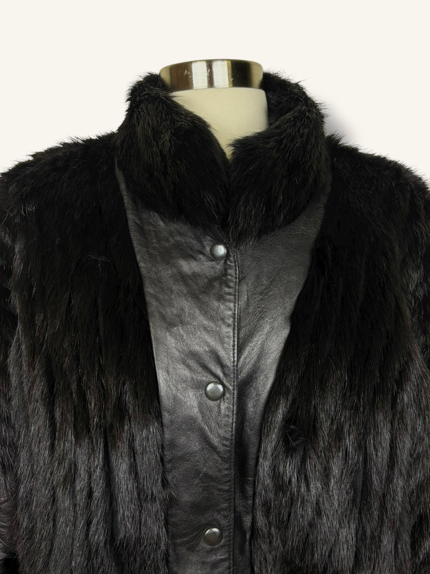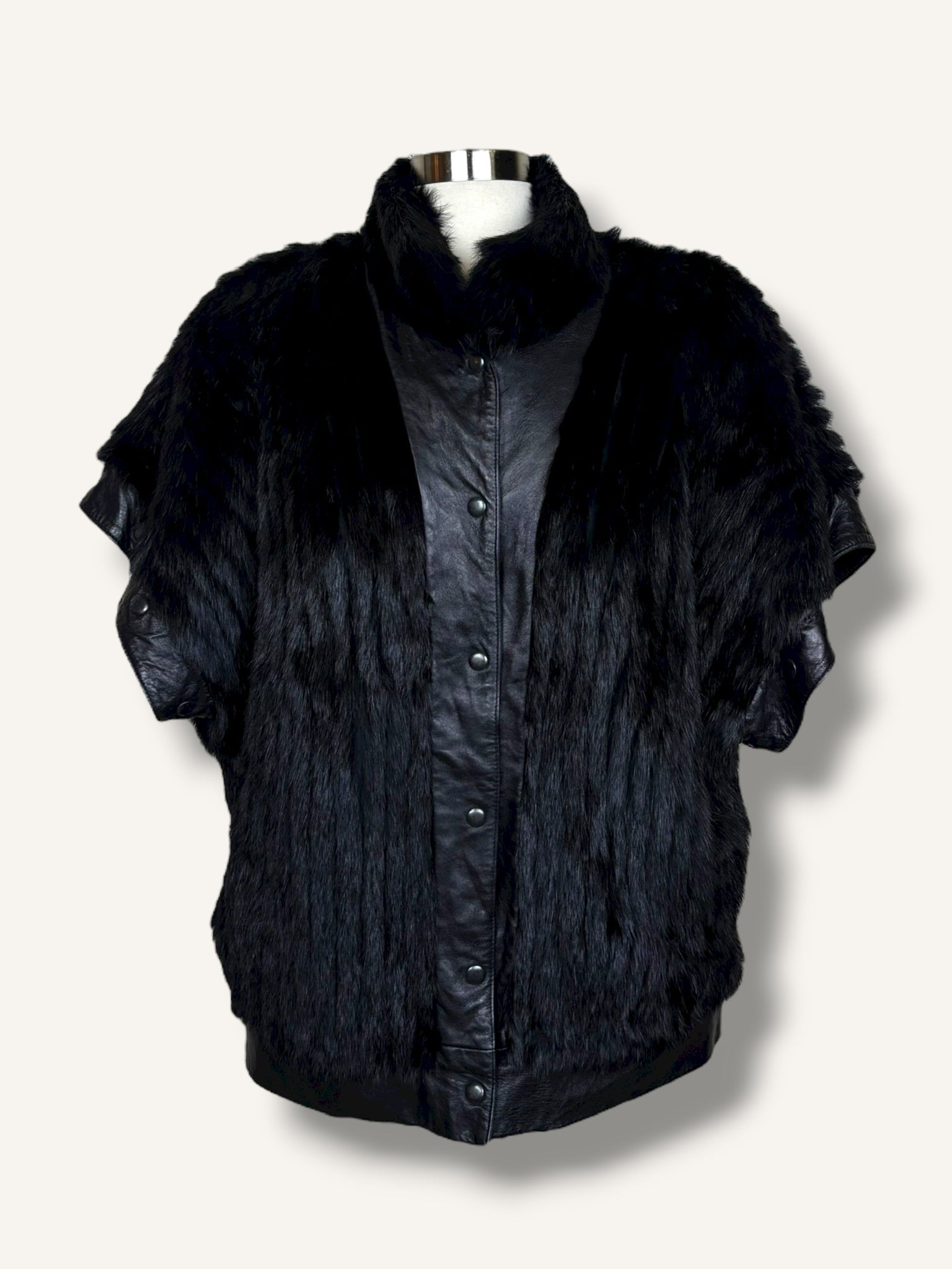 Vintage Black Leather & Mink Convertible Bomber Jacket