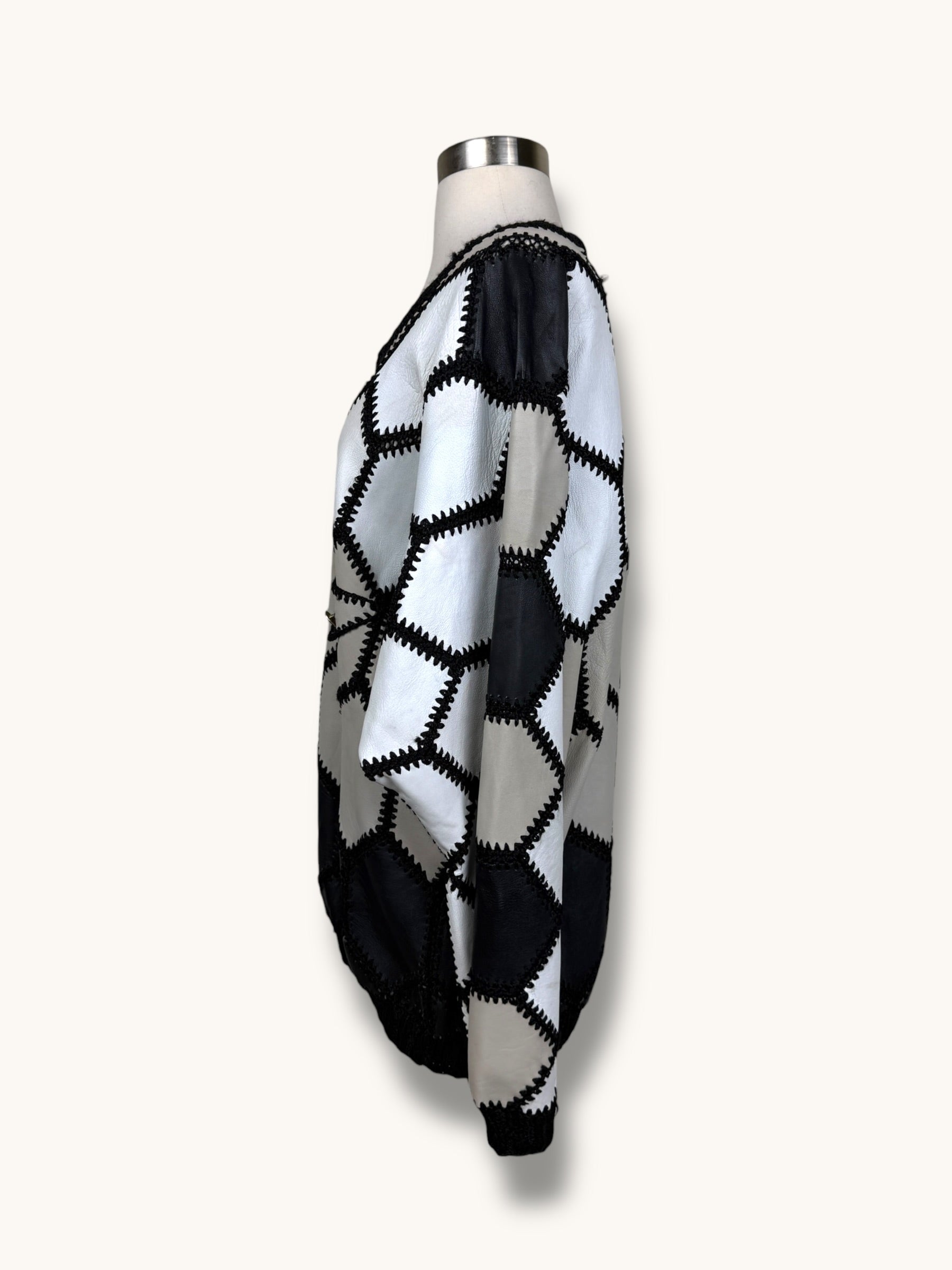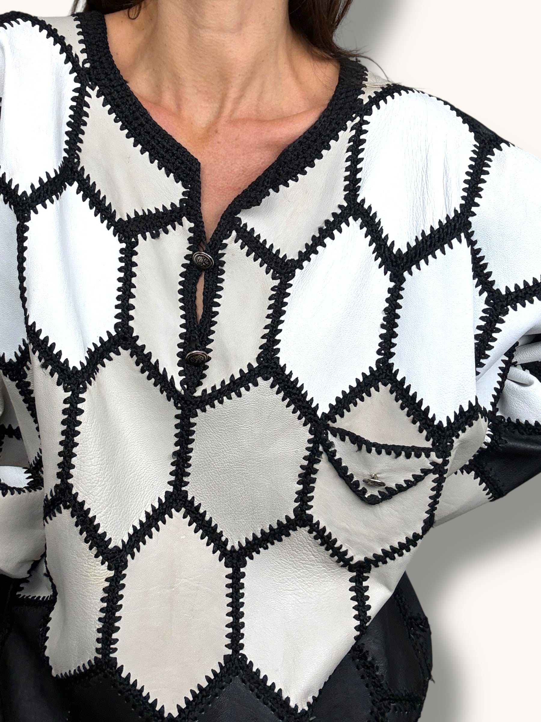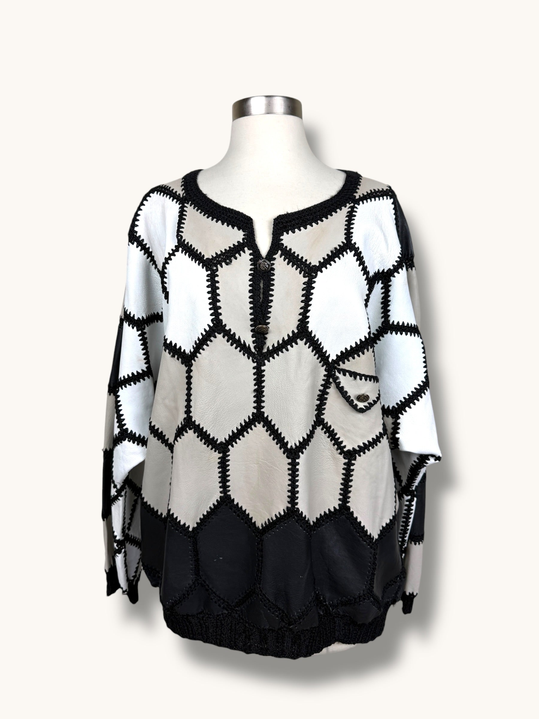Vintage black and ivory leather patchwork sweater crafted from supple leather panels stitched together in a striking honeycomb pattern with bold black whipstitch detailing. Designed in a relaxed, slightly oversized silhouette with a soft scoop neckline and a small chest pocket. Black leather panels accent the hem and sleeves, finished with a ribbed knit waistband and cuffs for subtle structure. Graphic yet timeless, this statement piece blends artisanal craftsmanship with effortless edge — perfect styled with denim or layered over tailored trousers for a modern, elevated look.