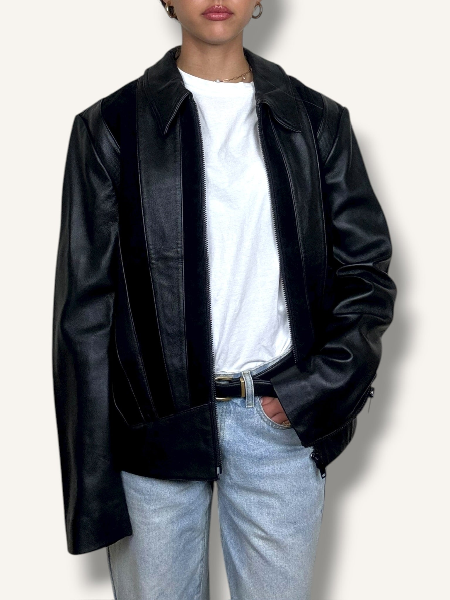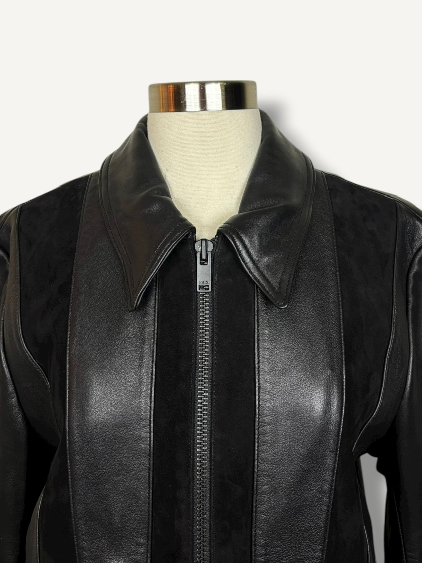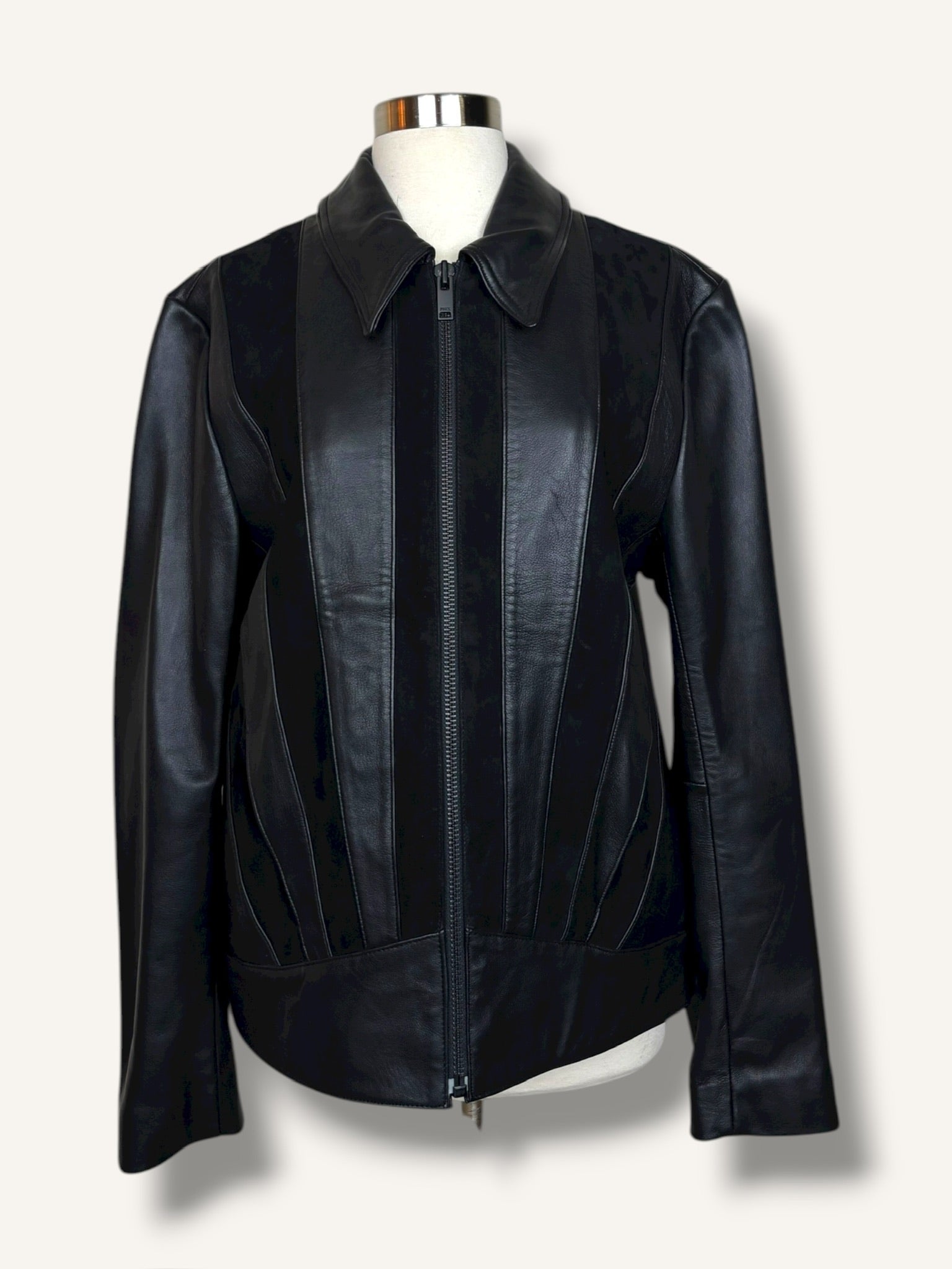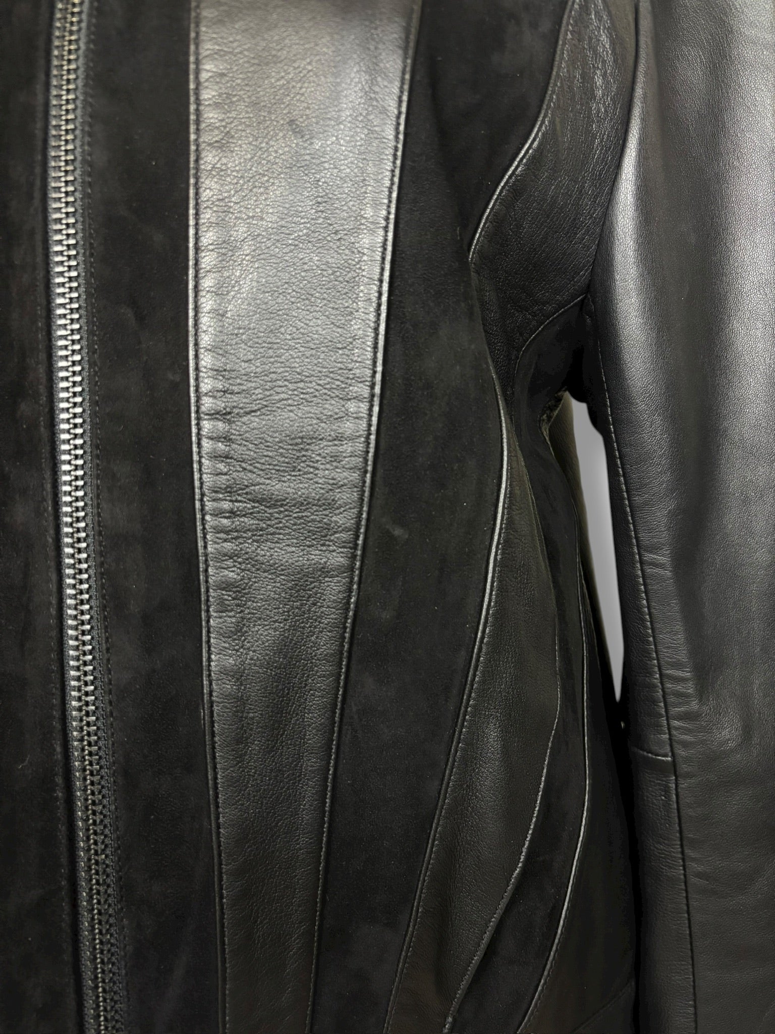 This jacket features a striking mix of textures, crafted in panels of smooth lambskin black leather and soft suede for a sleek, structured look. The fitted silhouette, pointed collar, and front zipper closure give it a modern edge, while the western-inspired back yoke adds subtle vintage character. A timeless statement piece that bridges sophistication and attitude—perfect worn over jeans or tailored trousers for an effortlessly cool.