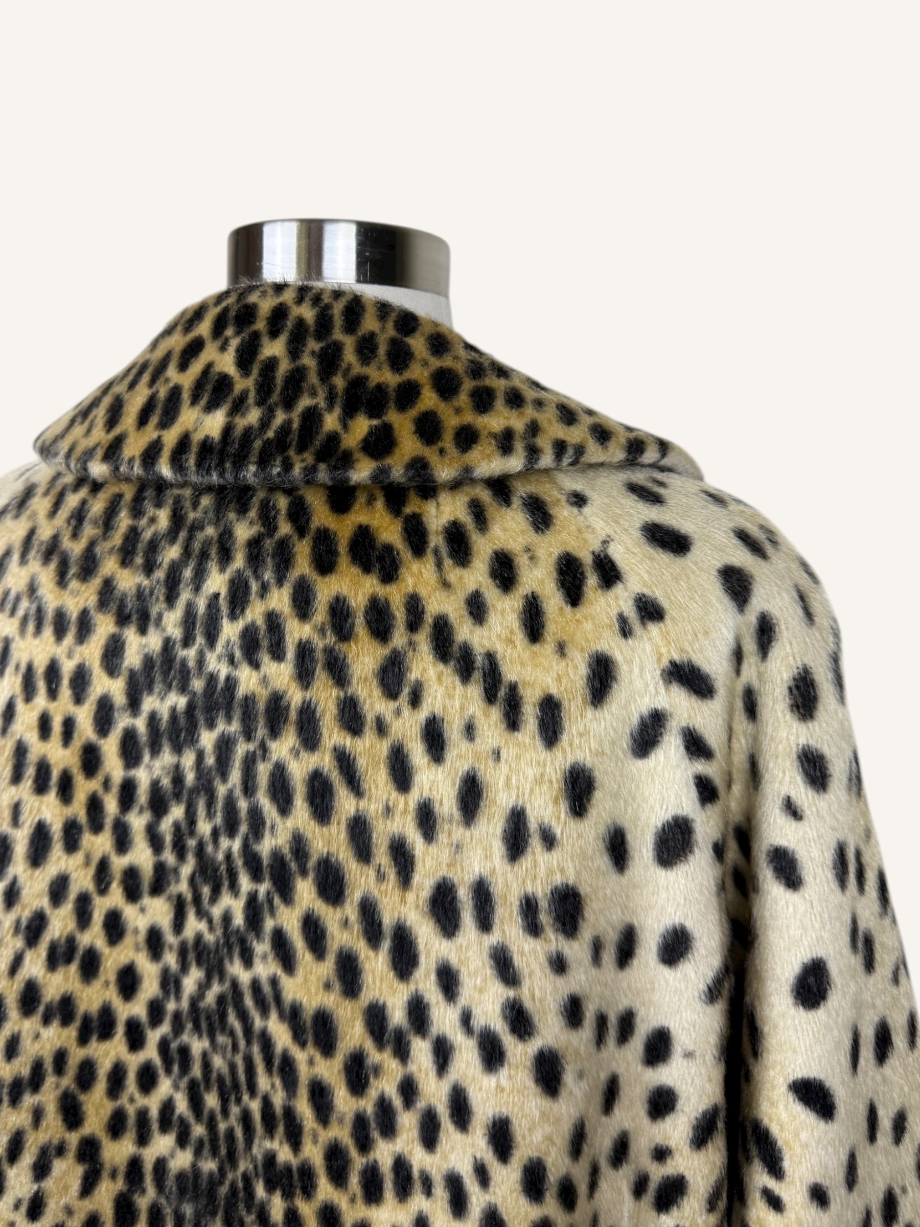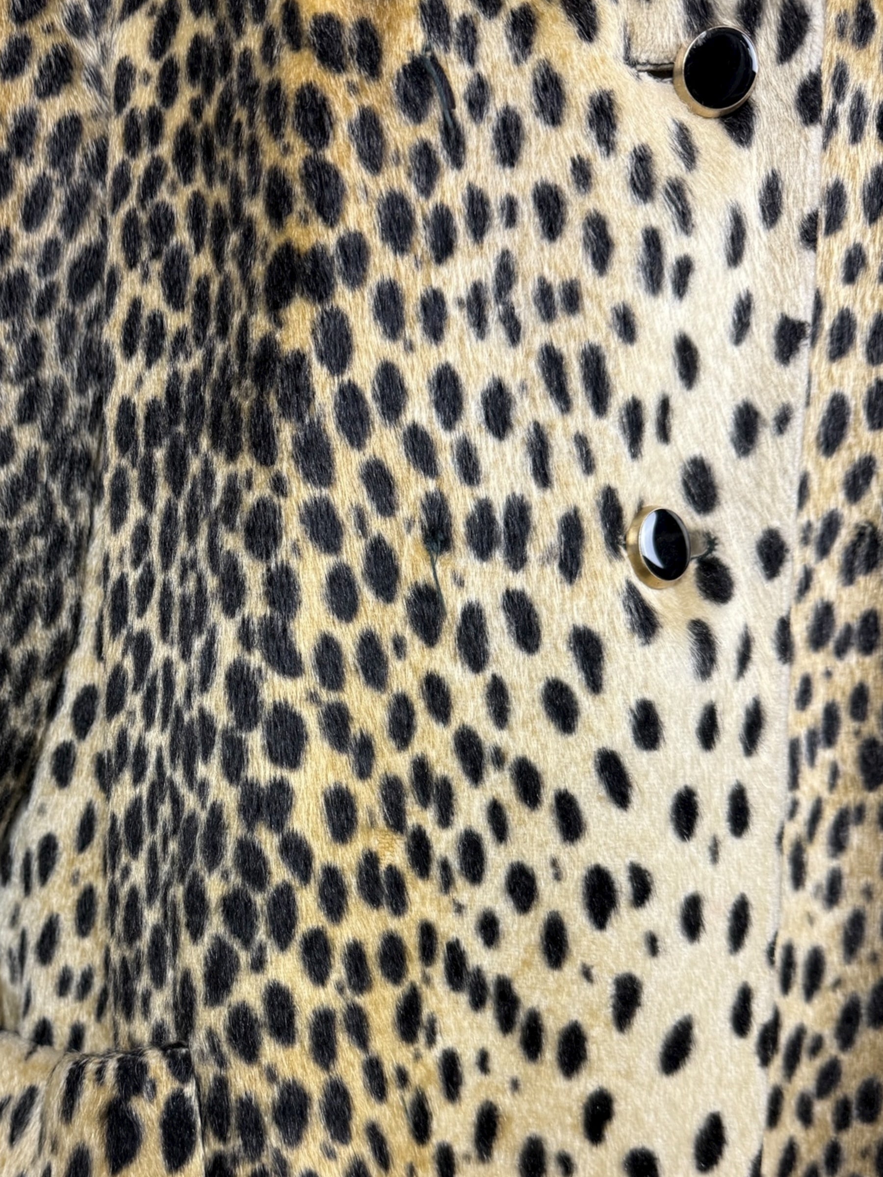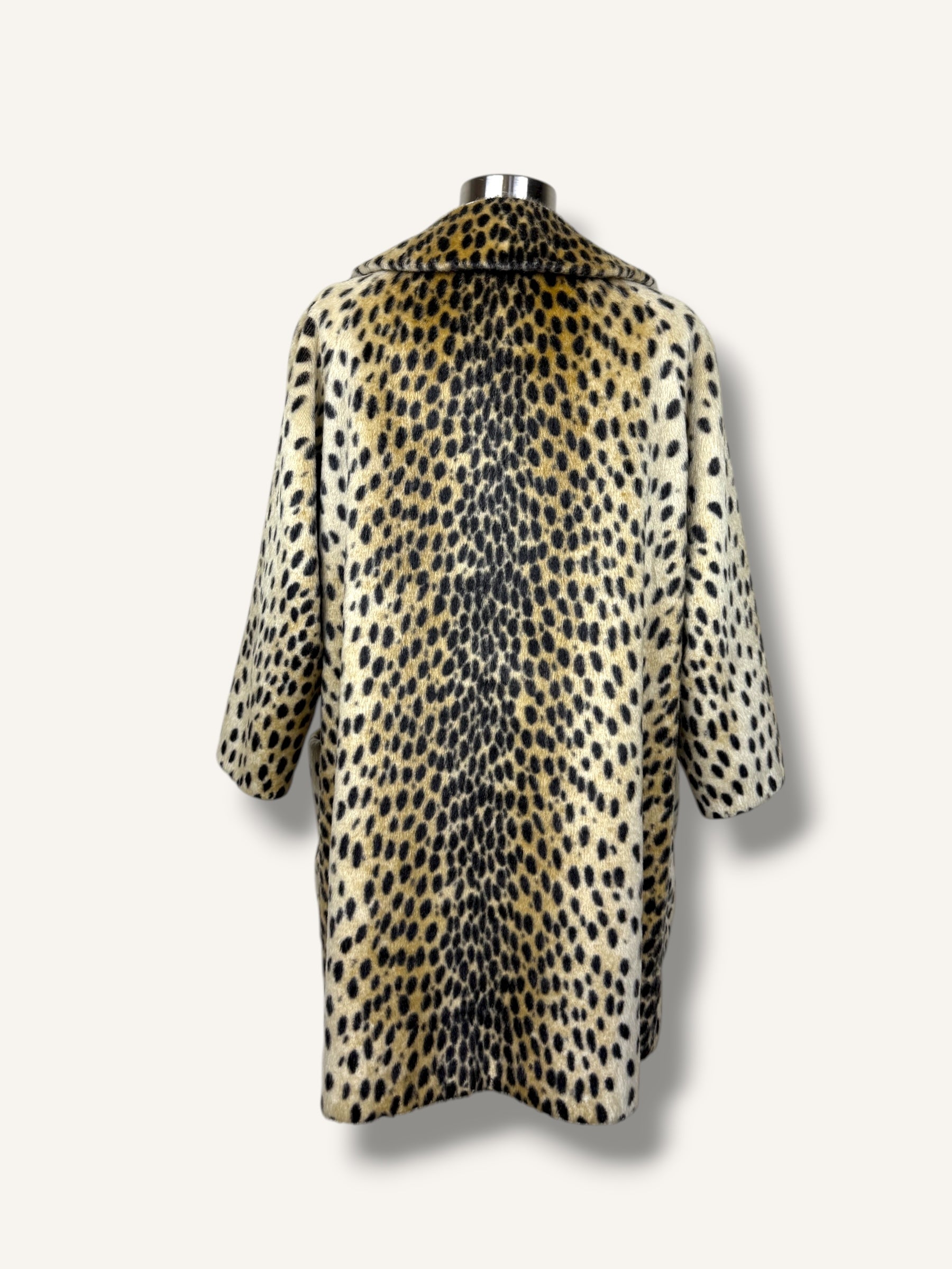 Vintage Faux Fur Leopard Coat. A stunning vintage 1960s faux fur coat in a bold leopard print, perfectly capturing the glamorous spirit of mid-century fashion. Made from soft, high-quality faux fur, it features an oversized silhouette with a wide notched collar, deep side pockets, and front button closure. A timeless statement piece that adds instant drama and sophistication to any look.