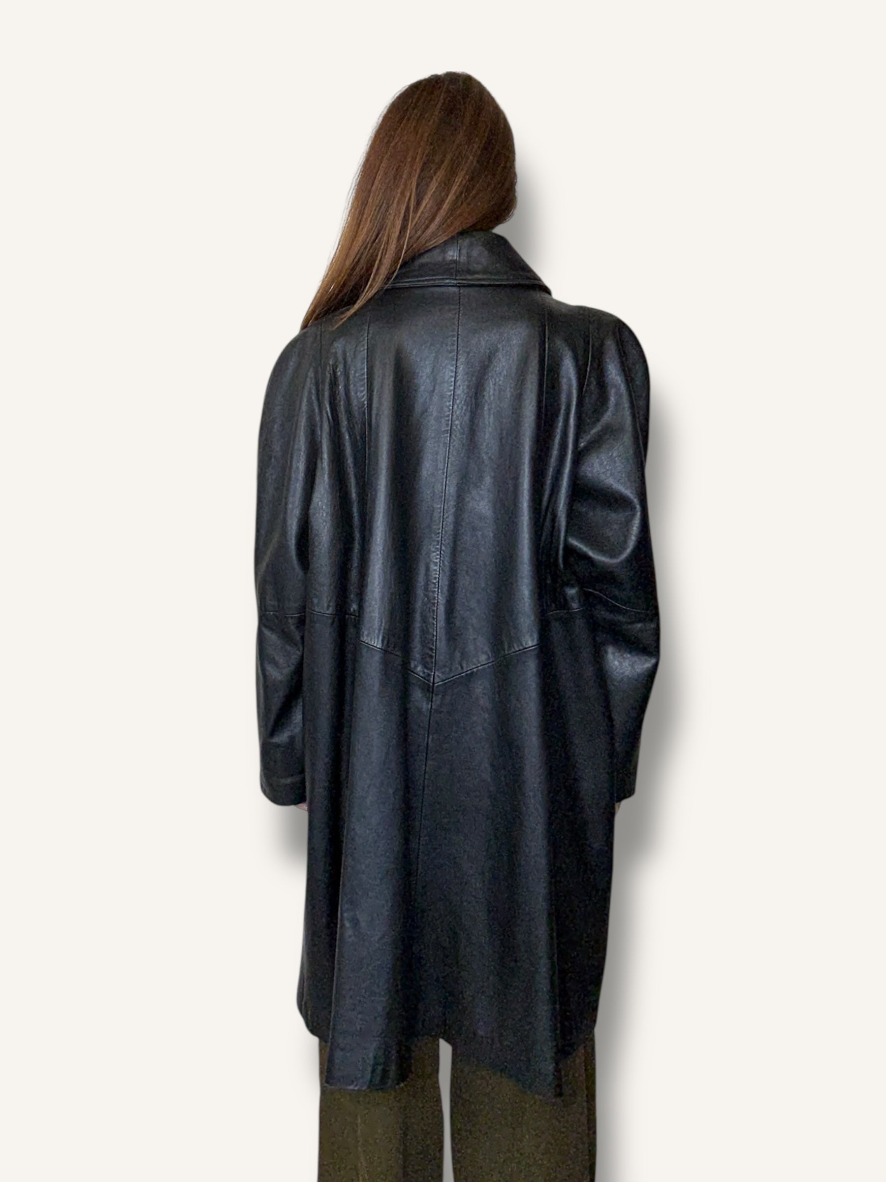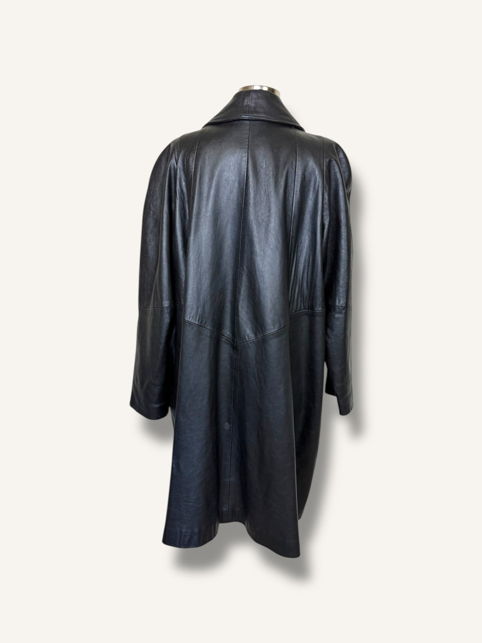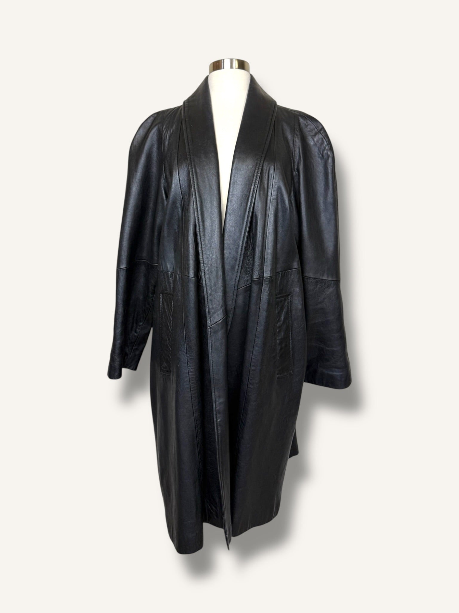 Vintage Leather Coat. An exquisite vintage leather coat with strong 1980s shoulders and a fluid, relaxed silhouette. Crafted from supple black leather, it features a minimalist shawl collar and clean tailoring that balance structure with effortless movement. The bold shoulders add a powerful, sculptural shape, a signature of the era, while the buttery texture brings modern ease. A timeless statement piece that embodies quiet strength and vintage sophistication.