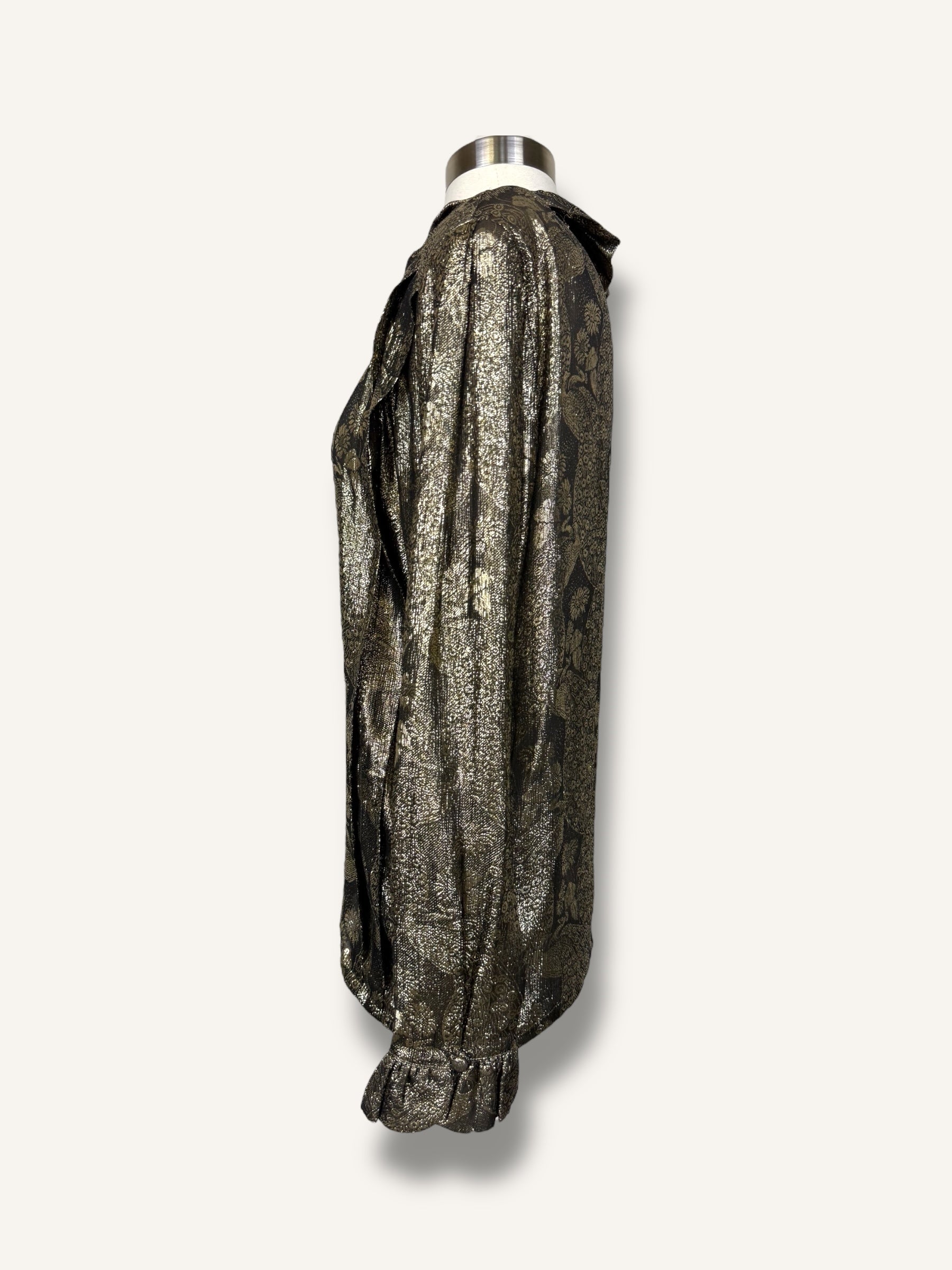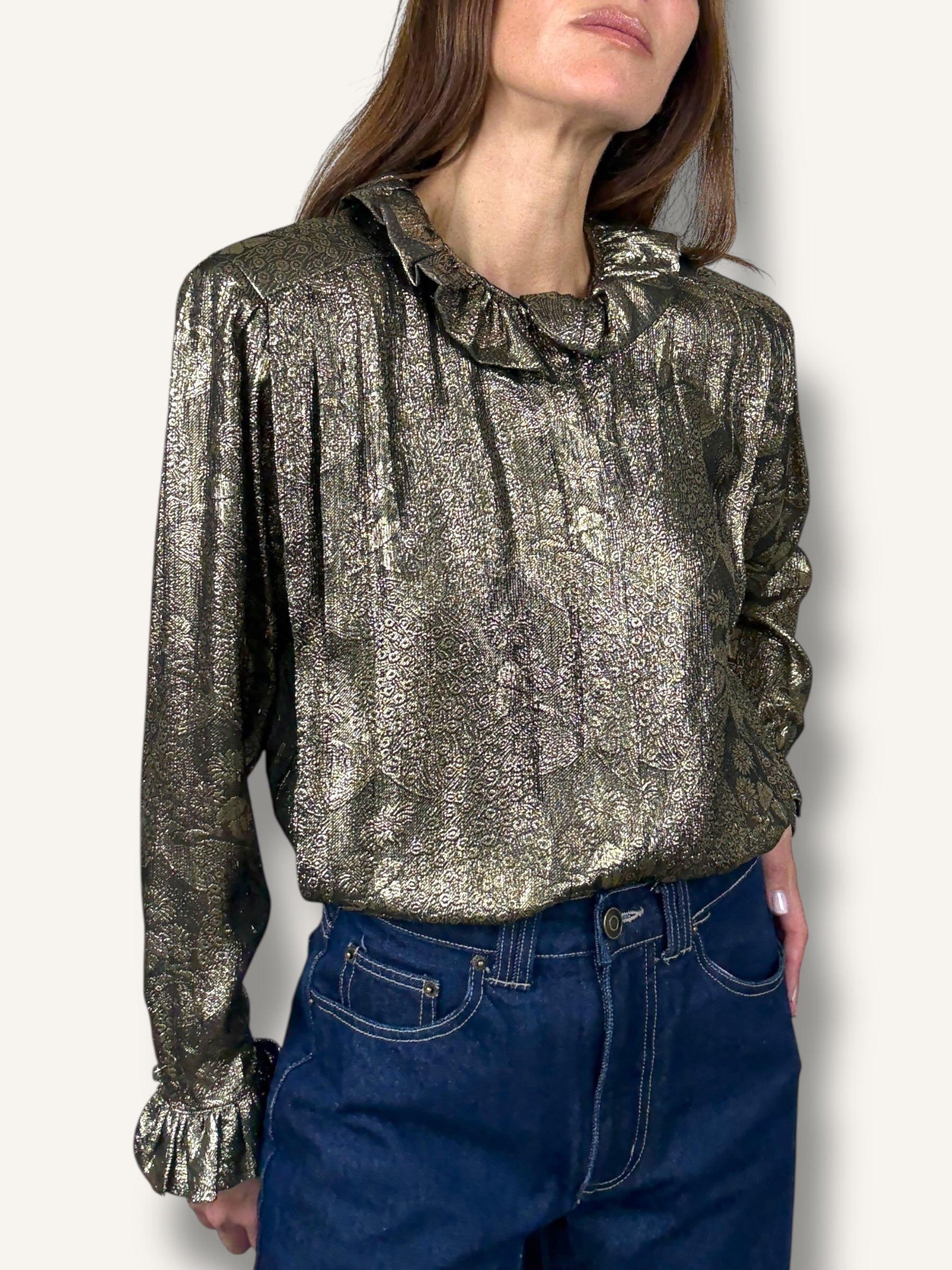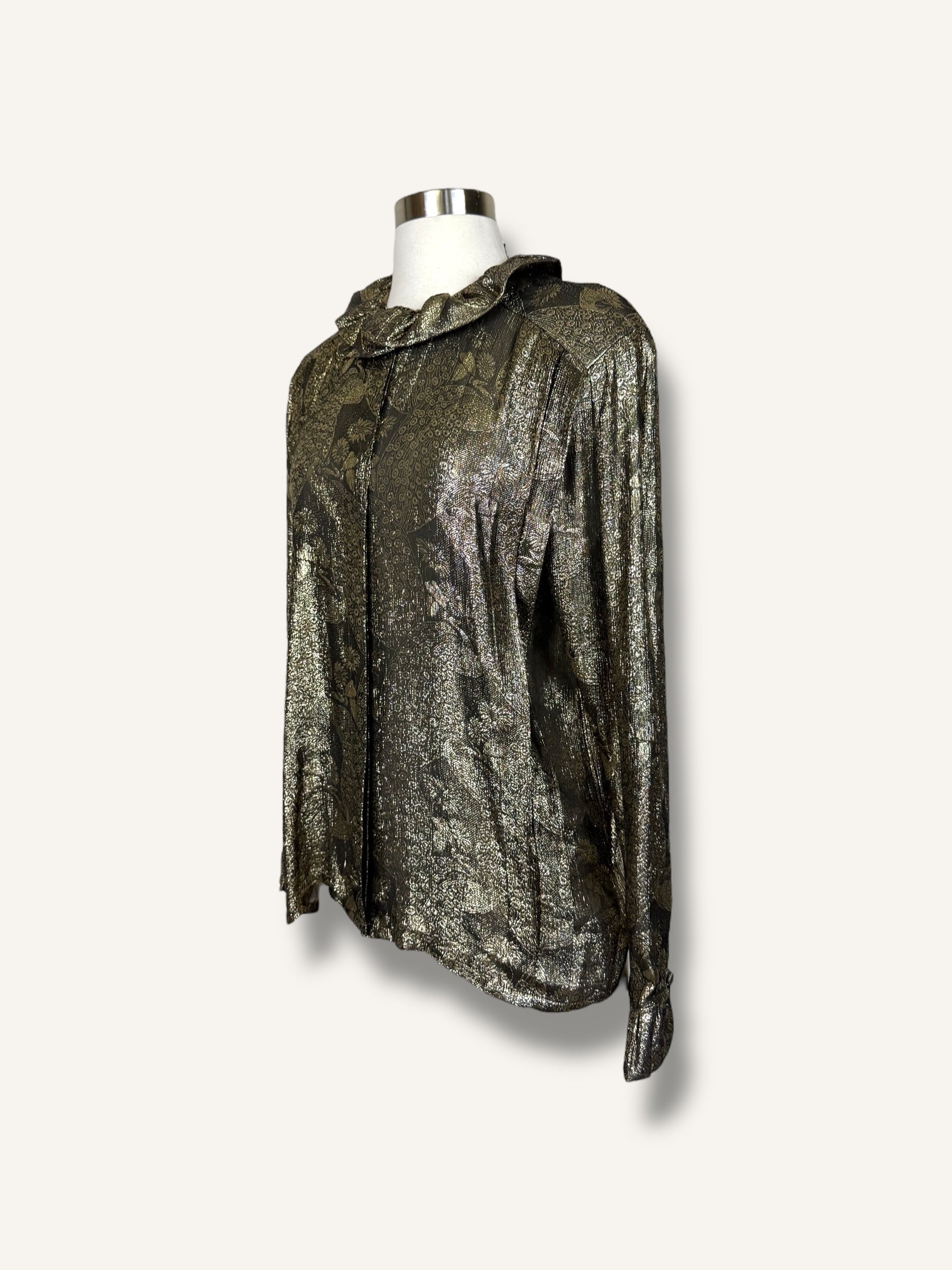 Vintage Louis Féraud metallic blouse featuring an intricate gold jacquard pattern with a subtle floral motif woven throughout. Designed with a ruffled collar and matching ruffle cuffs, it brings an elegant yet dramatic edge to a classic silhouette. The blouse has a concealed button front for a clean finish, with a slightly relaxed fit that makes it versatile for both evening and day styling. Made in France, it’s a timeless statement piece that reflects Louis Féraud’s signature attention to luxurious detail and refined fabrics.