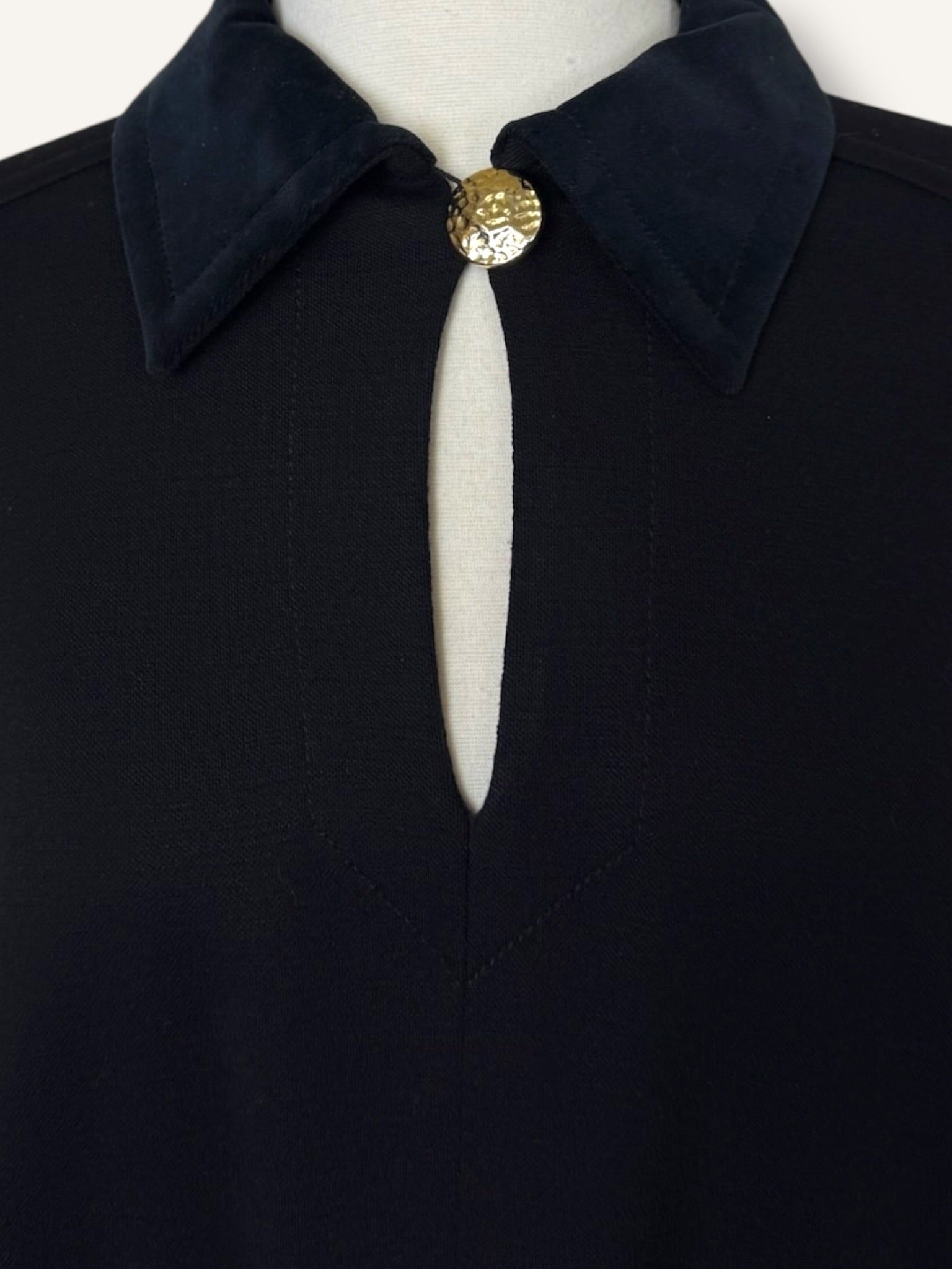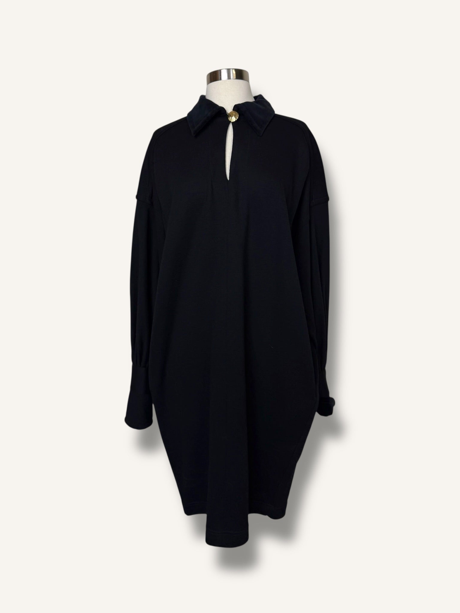 Vintage Max Mara Wool Dress. Timeless and effortlessly elegant, this vintage Max Mara dress is crafted from 100% pure wool in deep black, made in Italy. It features a relaxed cocoon silhouette with soft draping, side pockets, and luxurious black velvet details at the collar and cuffs. The oversized pointed collar and gathered sleeves add refined structure, while the gold textured buttons bring a touch of understated glamour. A sophisticated piece that transitions seamlessly from day to evening ,classic Max Mara tailoring with a vintage twist.