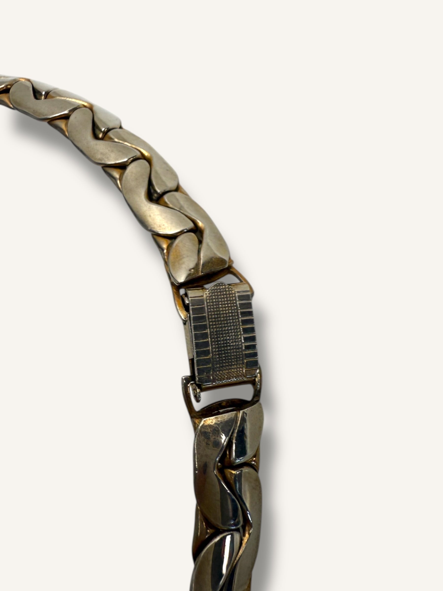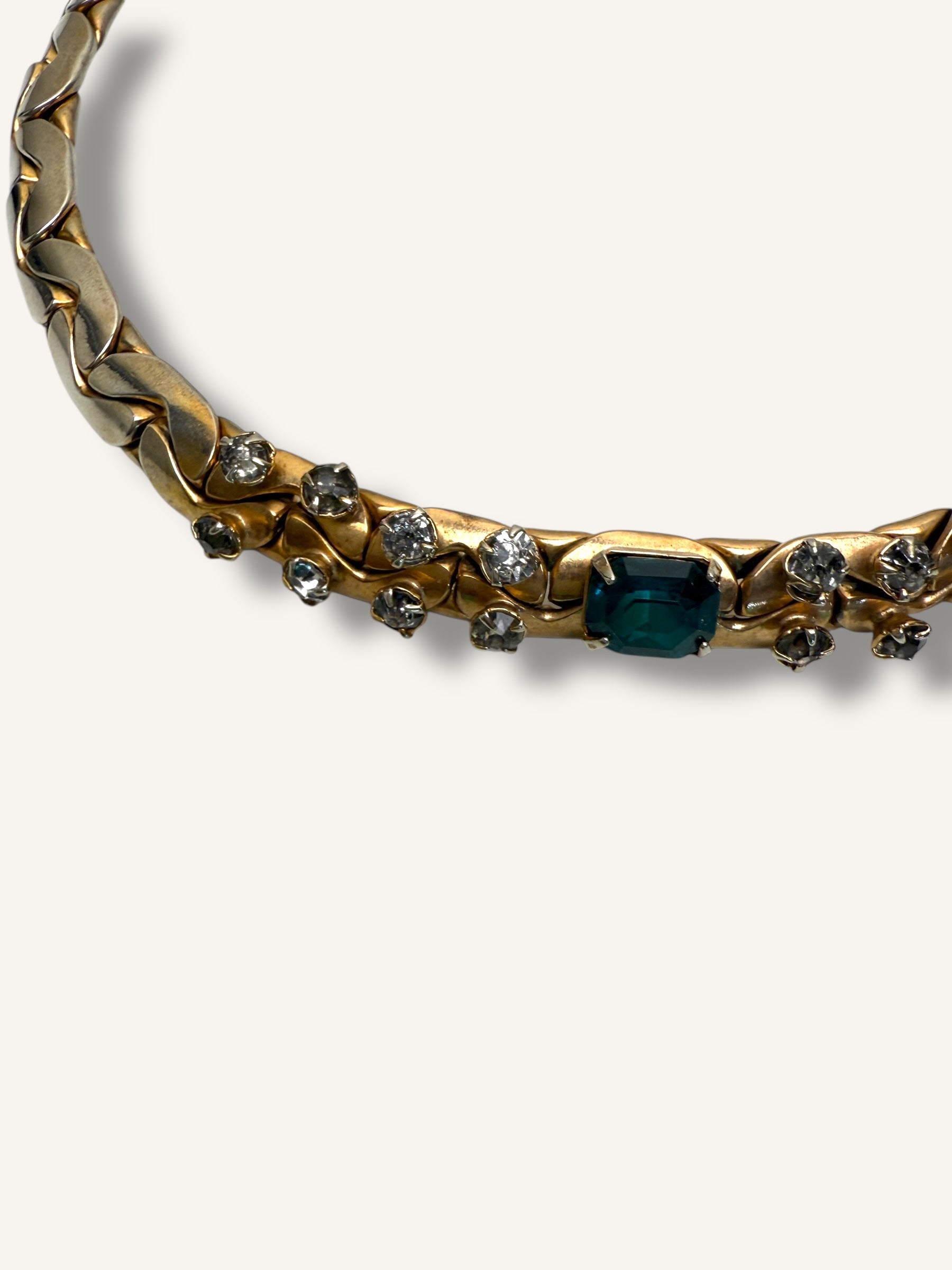 A breathtaking vintage collar necklace featuring sculptural faded gold-tone links adorned with sparkling clear rhinestones and a striking emerald-green central stone. The dimensional braided design gives the piece a luxurious, couture feel, while the jewel-tone centerpiece adds depth and drama. Finished with a secure vintage clasp, this necklace sits beautifully along the collarbone for an elegant, refined silhouette.
