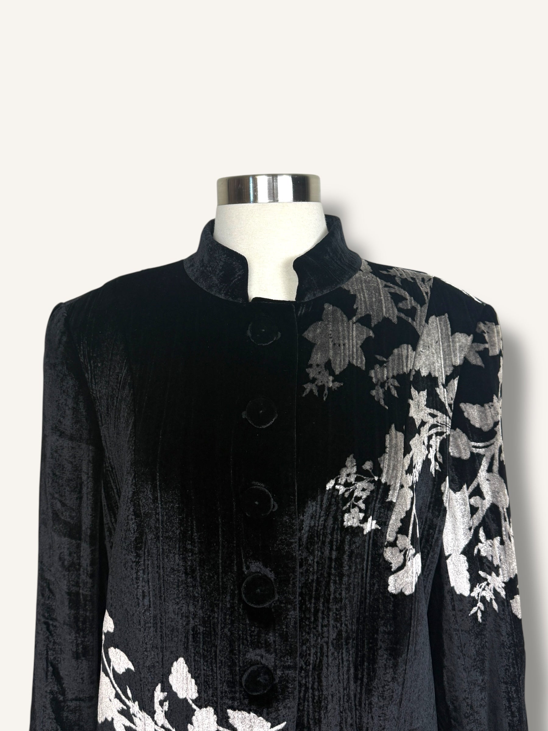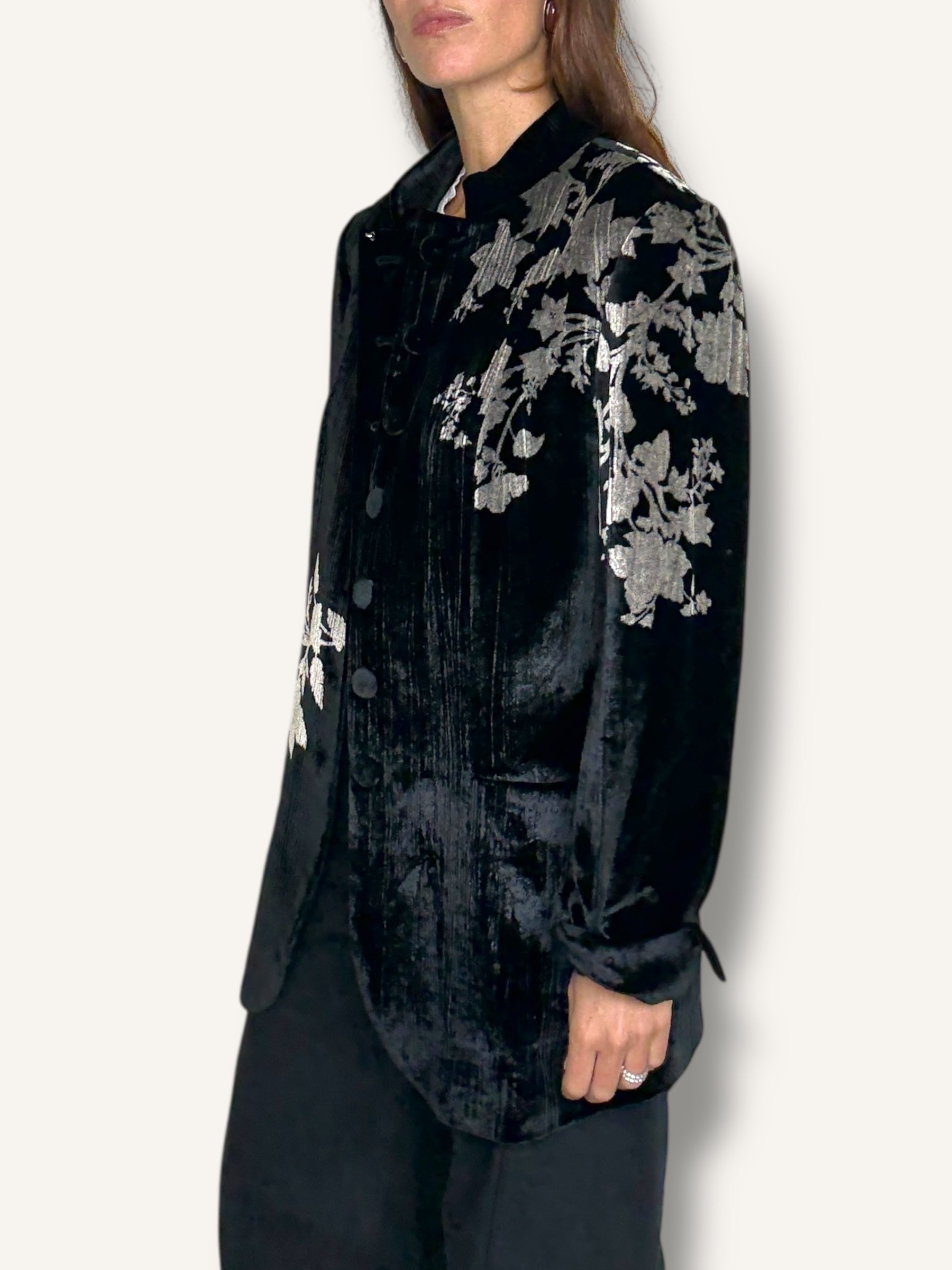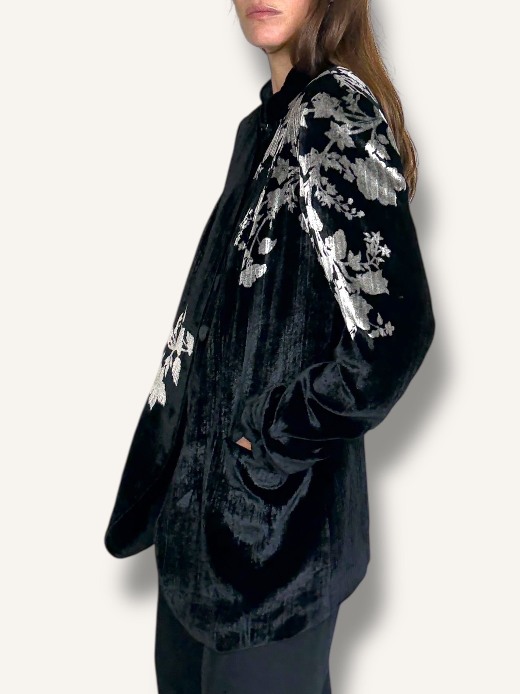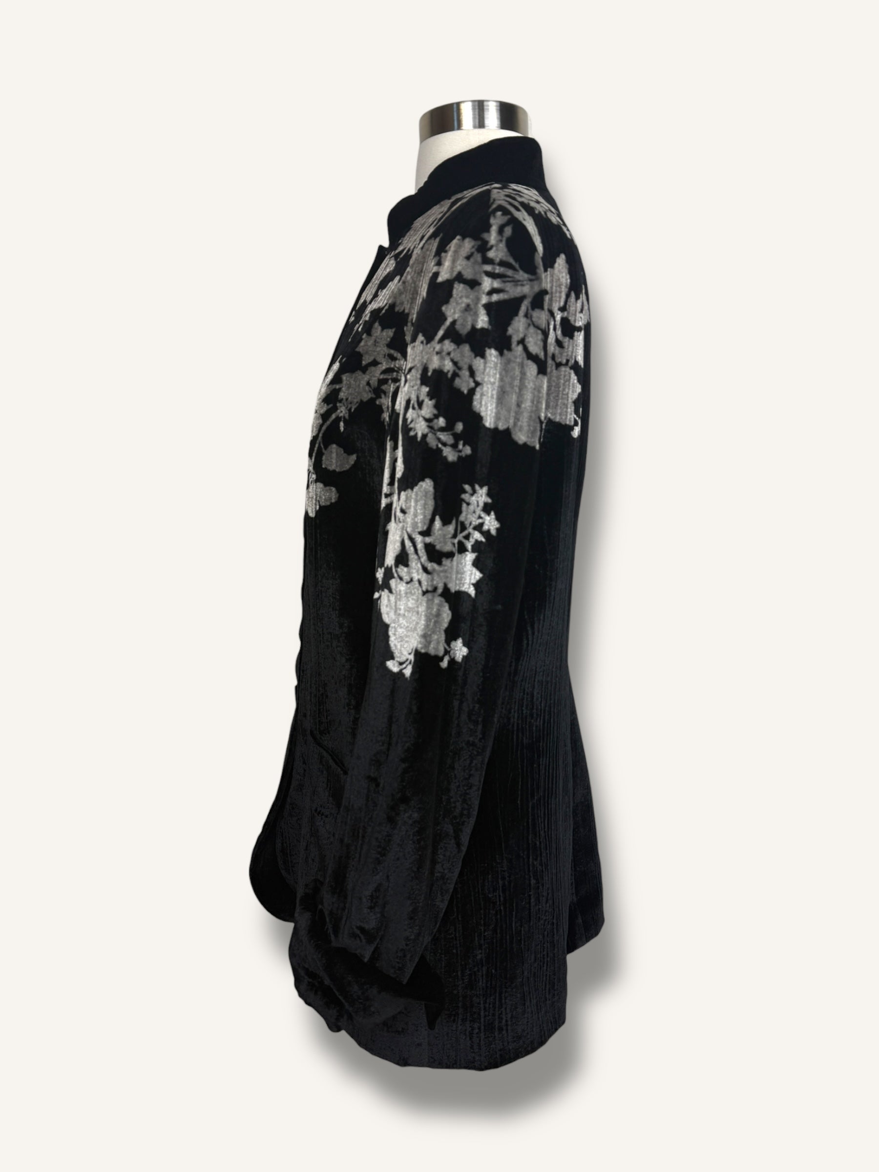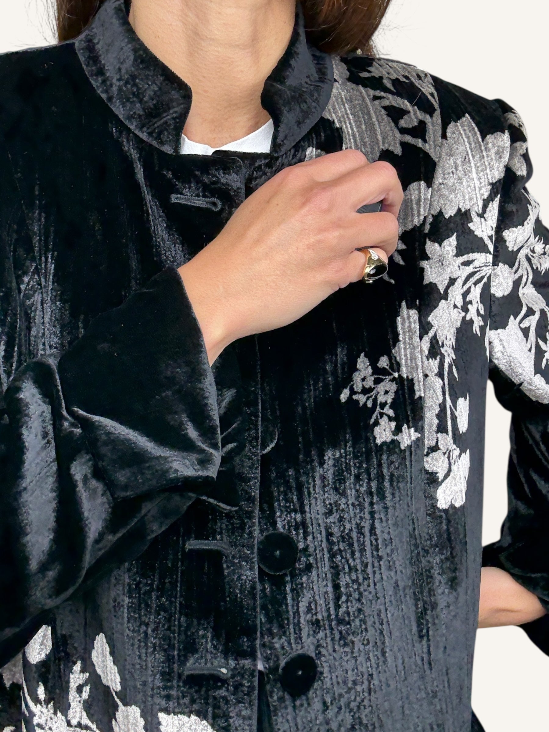 A sleek, statement vintage jacket in deep black velvet blend with a subtle tonal texture, designed with a refined stand collar and a clean button-front silhouette. white metallic florals sweep across one side and shoulder like a midnight garden—dramatic but still elegant—while the longline cut and structured shape make it feel instantly polished. Wear it as your “dressy top” over denim, or lean into the evening mood with black trousers and a sharp heel—quiet luxury with a little shimmer.