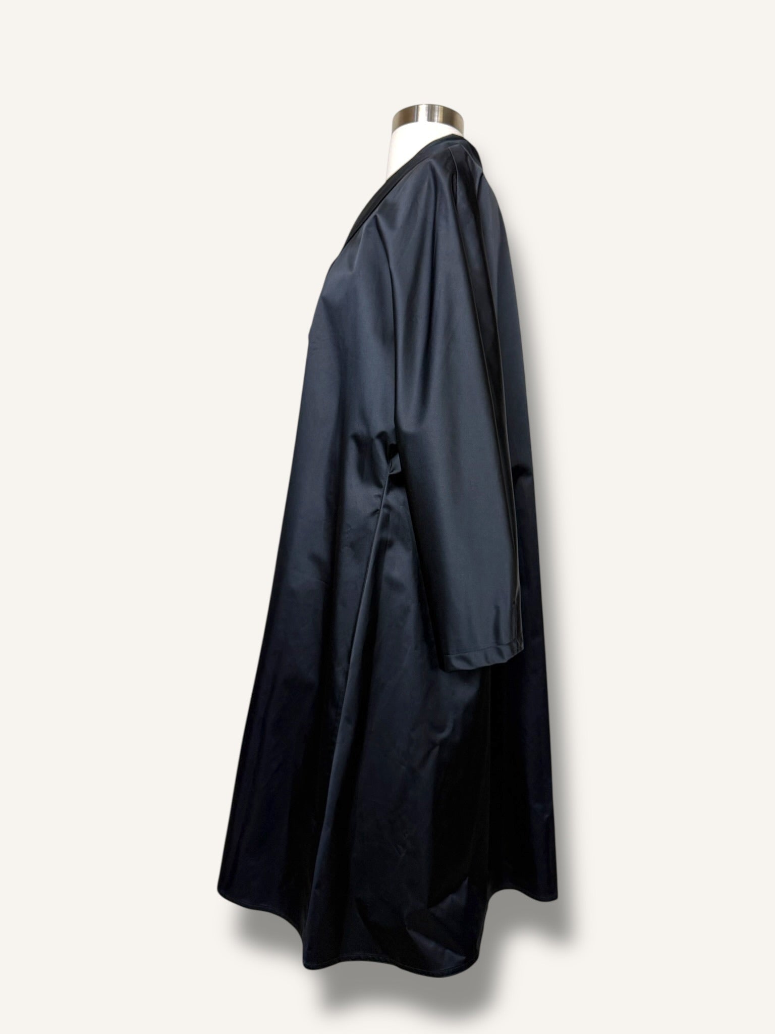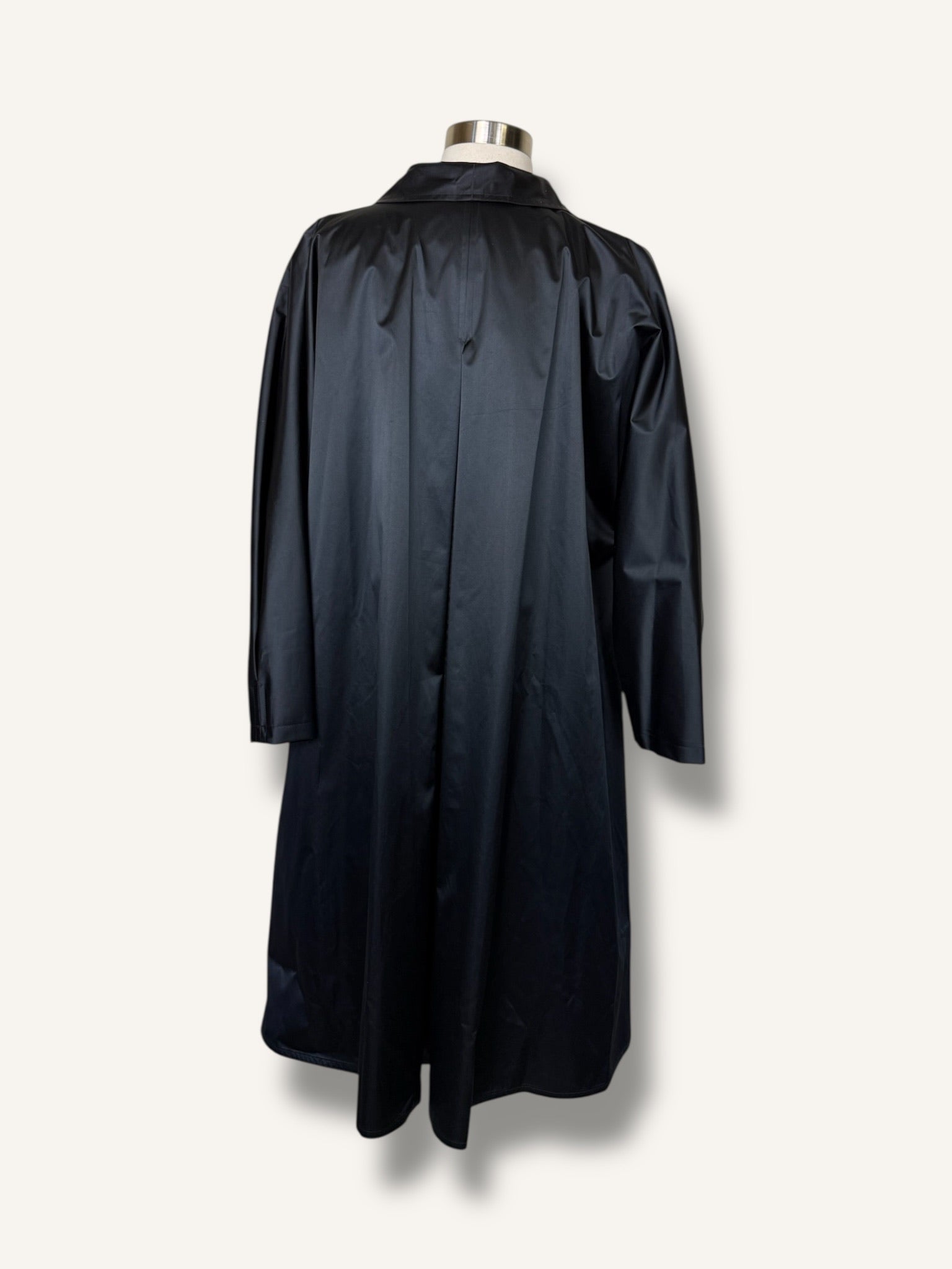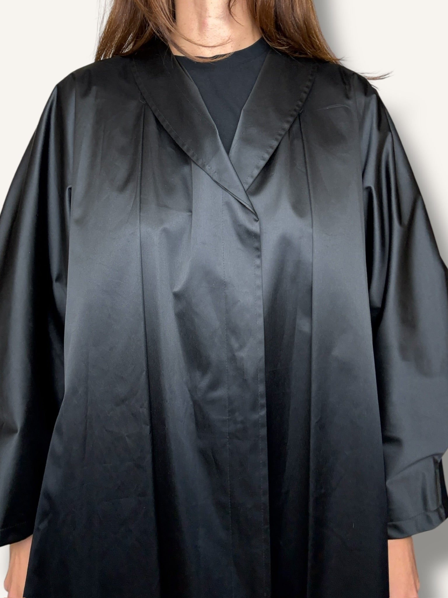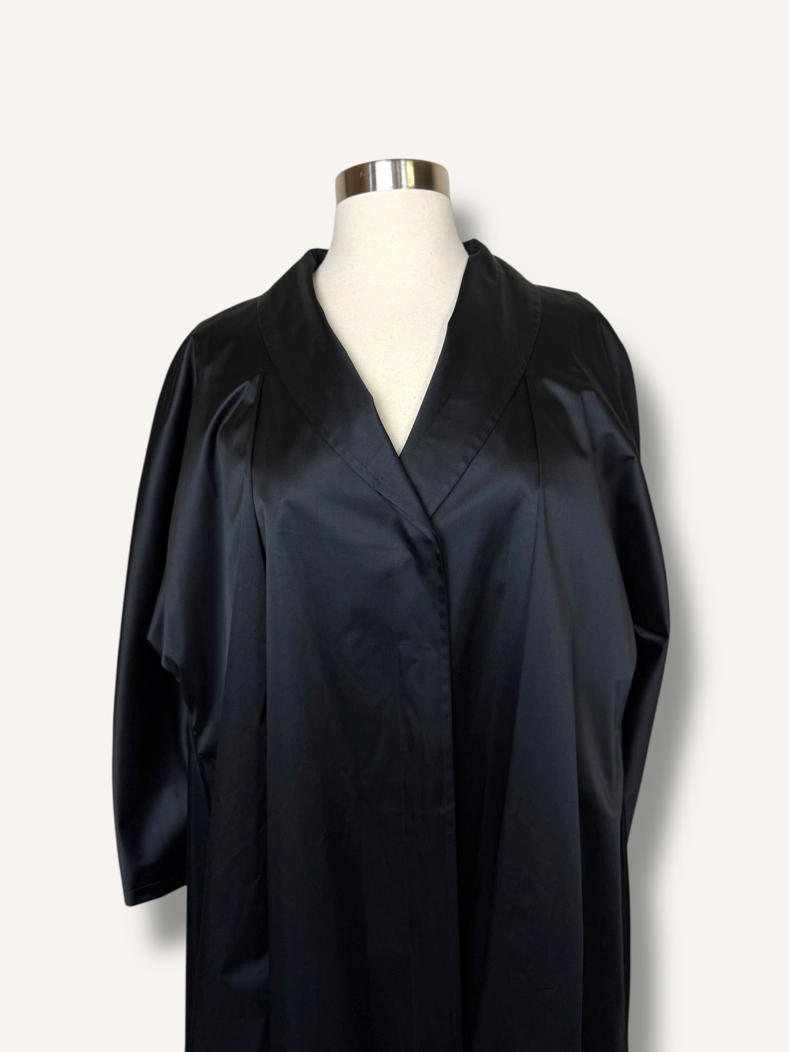 Vintage Missoni Coat. A minimalist masterpiece from Missoni, this vintage coat captures understated sophistication with its fluid A-line silhouette and lustrous black satin finish. The design features a soft drape with a subtle sheen that catches the light, creating an effortlessly elegant effect. Timeless and versatile, it can be worn open over relaxed tailoring or buttoned up for a refined, sculptural look, an elevated essential that embodies Missoni’s quiet luxury.