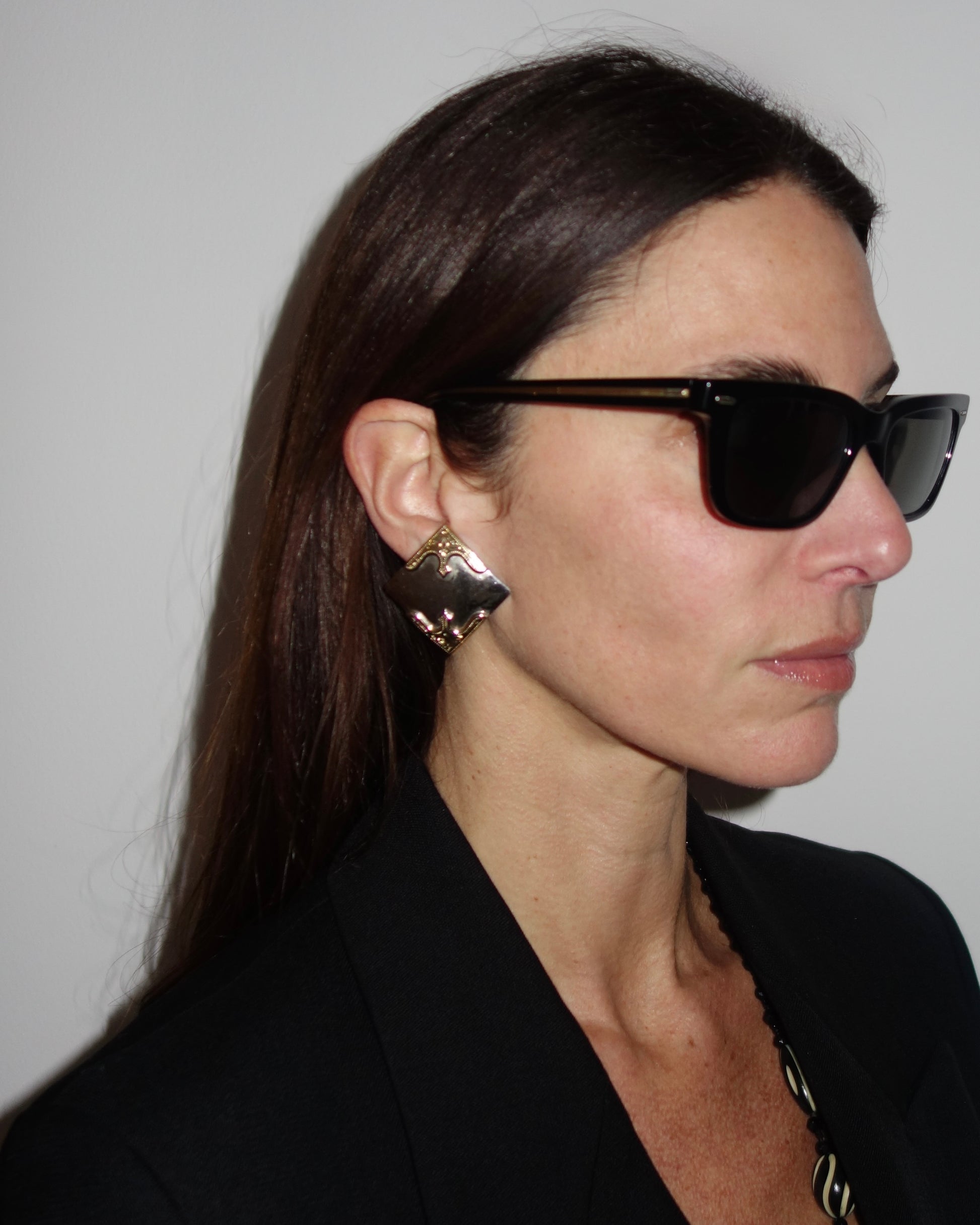 Bold and architectural, these vintage 1980s clip-on earrings feature a striking square silhouette with a hammered silver-tone center framed by ornate gold-tone detailing at the corners, creating a rich contrast that feels both western and modernist. The mixed-metal design gives them depth and dimension, while the substantial shape embodies that unapologetic ’80s glamour—powerful, sculptural, and effortlessly statement-making, whether paired with a sharp blazer or an evening look.