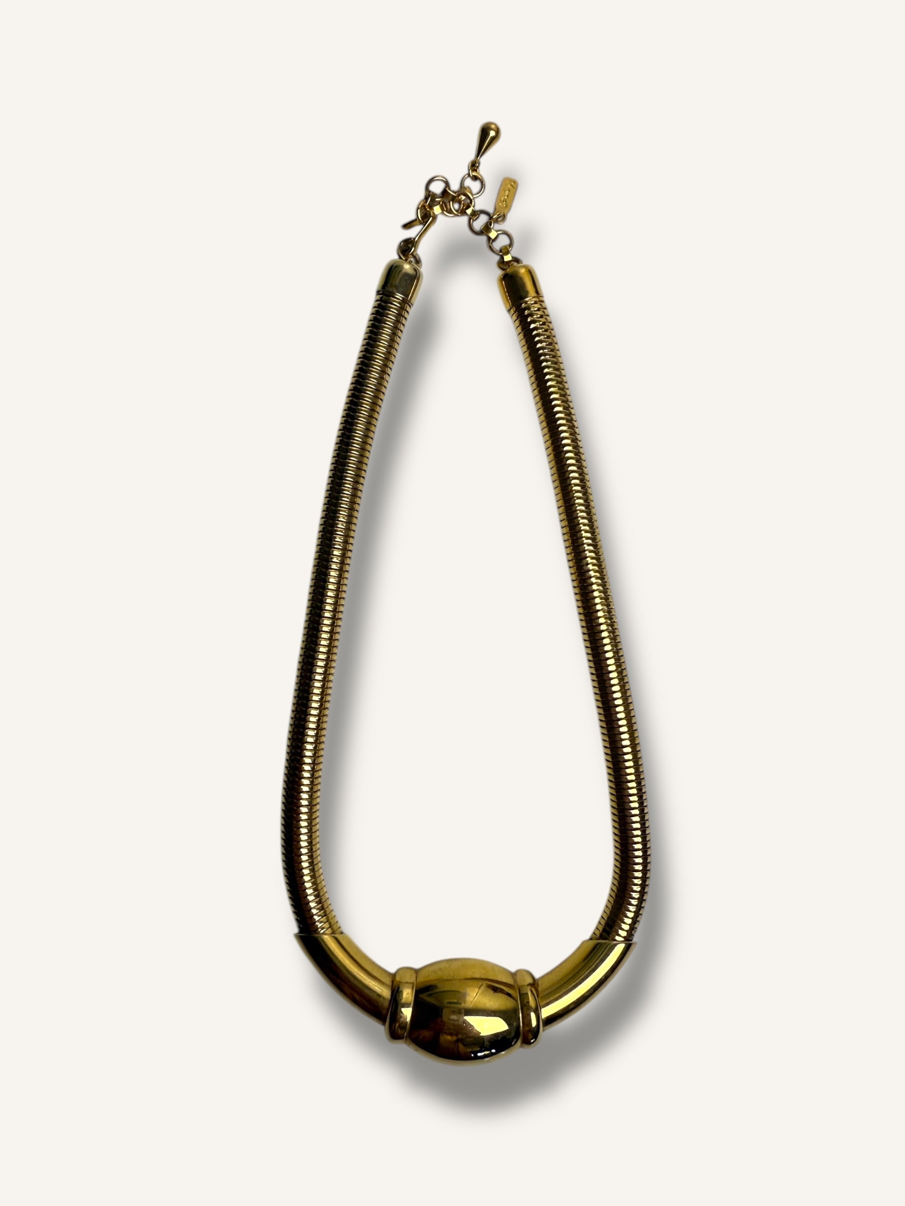 Vintage Monet Gold-Tone Collar Necklace. Timeless and sculptural, this vintage Monet necklace embodies the bold sophistication of 1980s jewelry design. Crafted in a high-shine gold tone, it features a flexible snake chain with a substantial central oval bead accent and smooth curved ends that rest elegantly along the collarbone. Finished with Monet’s signature adjustable clasp and logo tag, this statement piece brings instant polish to any look, perfect worn alone or layered with other gold chains.