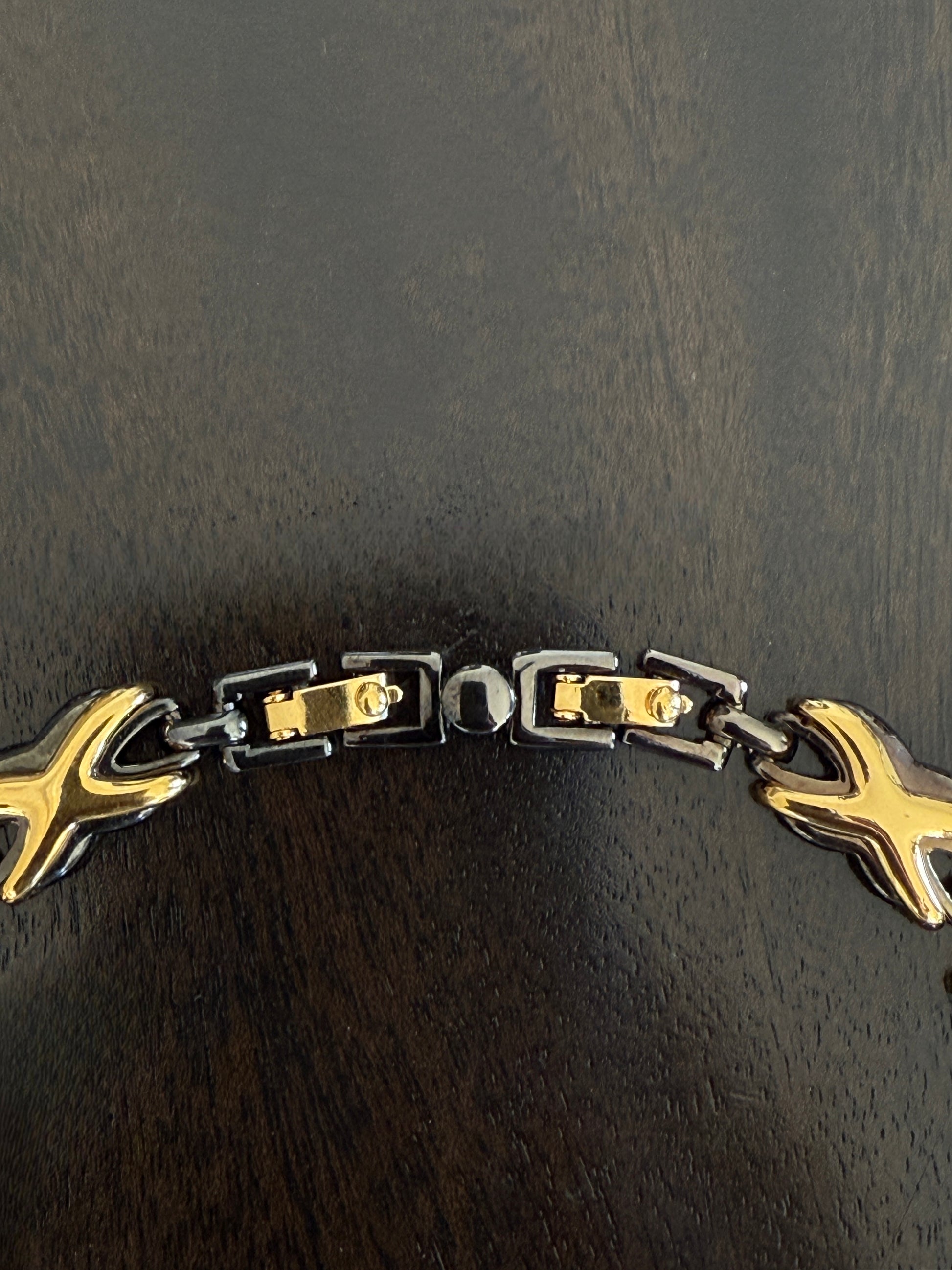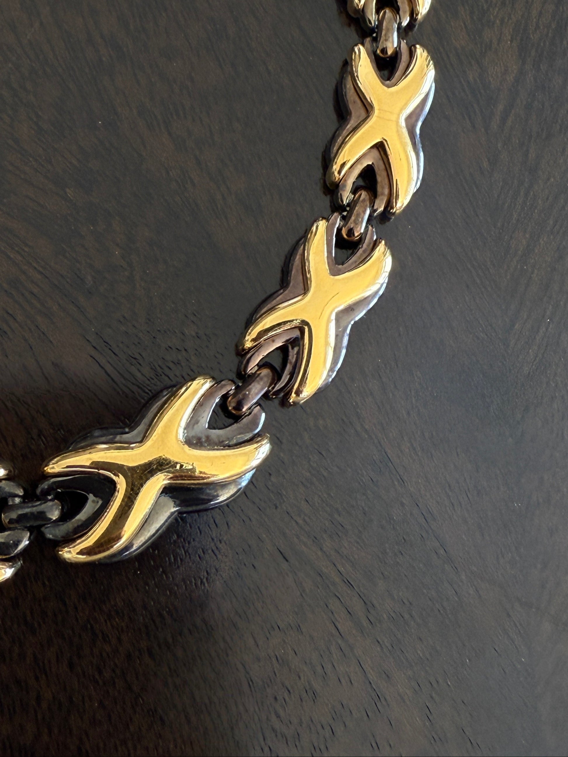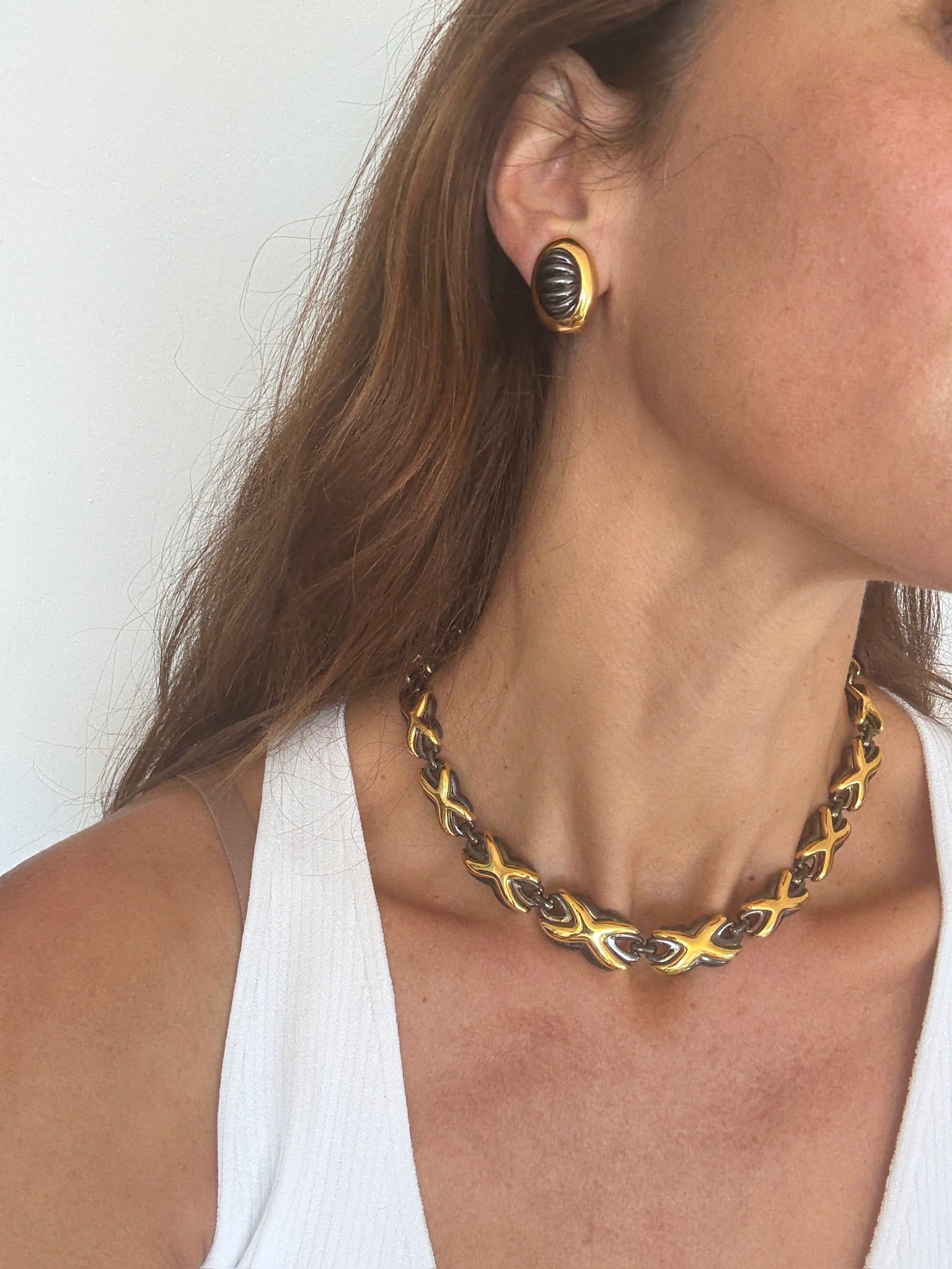 Vintage Monet gold-tone and dark grey enamel necklace and earrings set featuring a sculptural X-link chain design. The necklace sits beautifully as a structured collar. Iconic late 1980s Monet styling: bold, glamorous, and timeless.