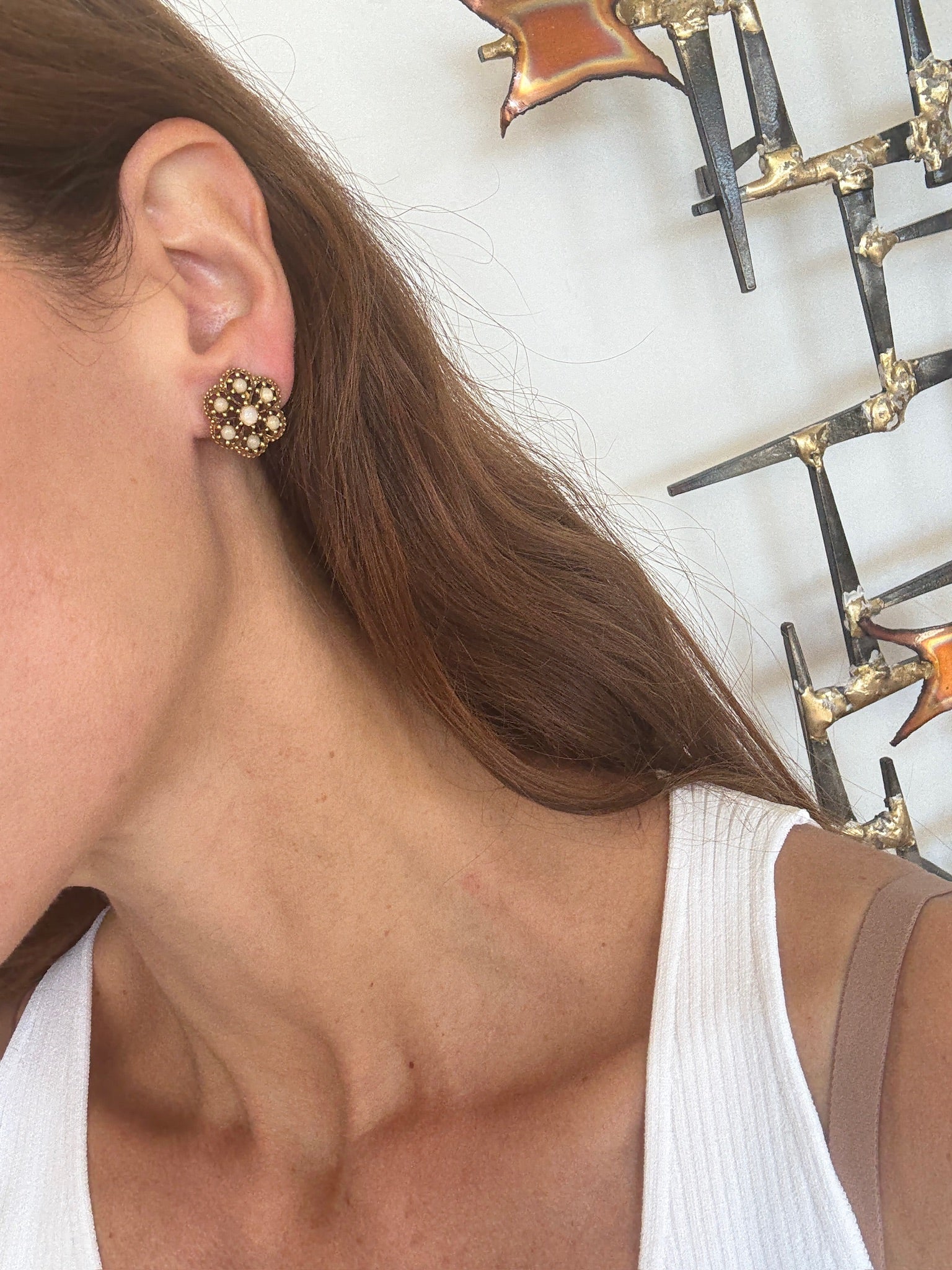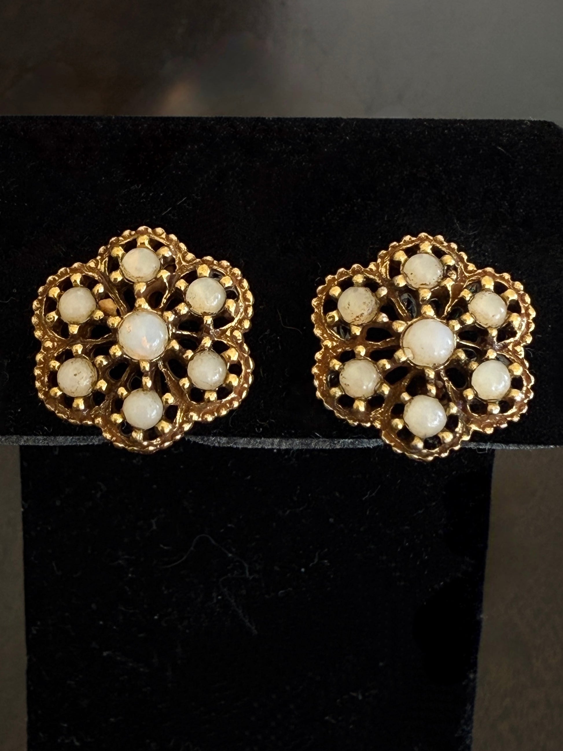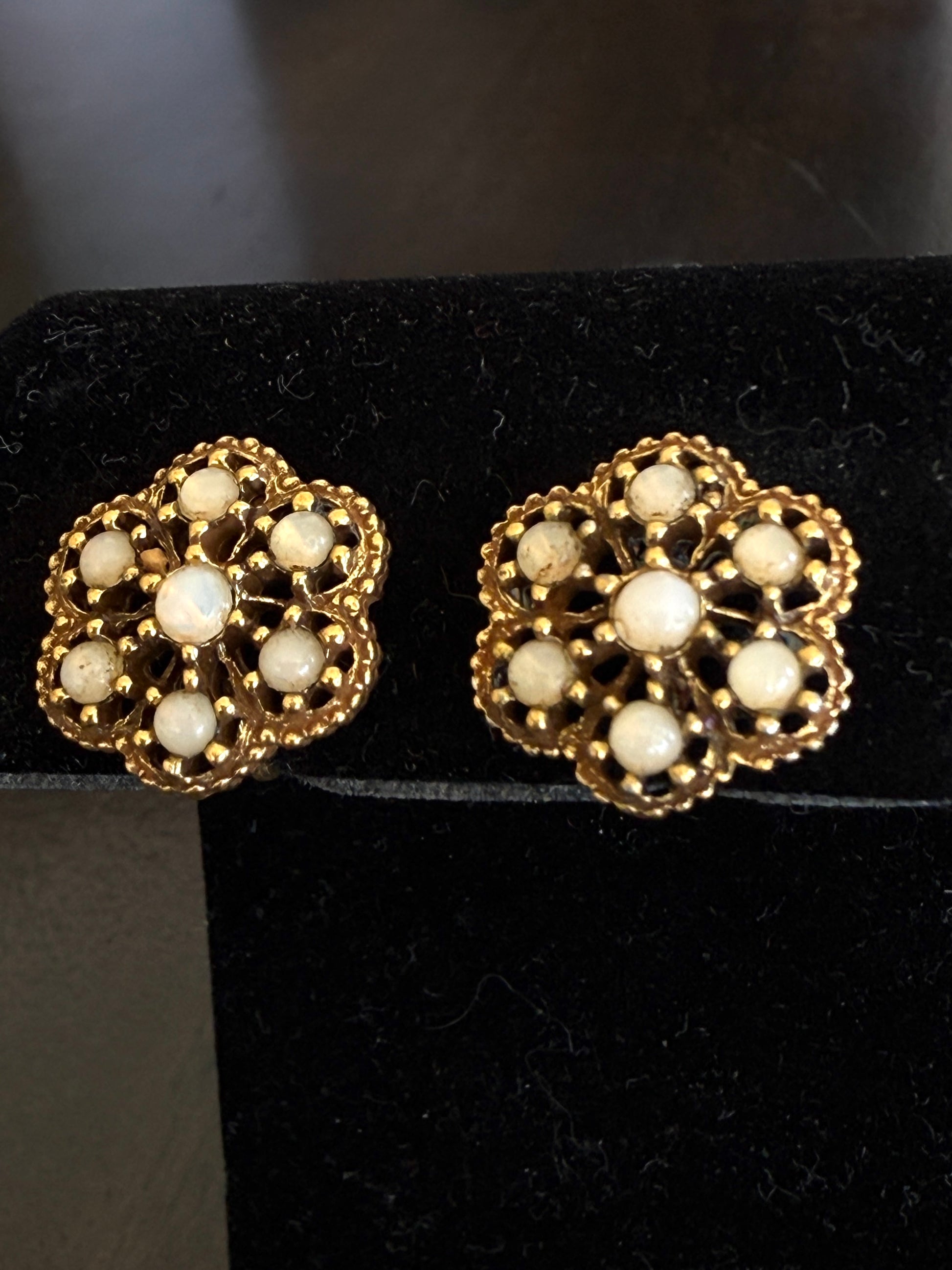 Vintage 1950's gold-tone cluster earrings featuring delicate mother of pearl stones arranged in a floral-inspired design. These clip-on earrings are lightweight yet striking, giving off an effortlessly chic, Old Hollywood-meets-Paris glamour vibe. Perfect for special occasions or adding a touch of vintage elegance to an everyday look.