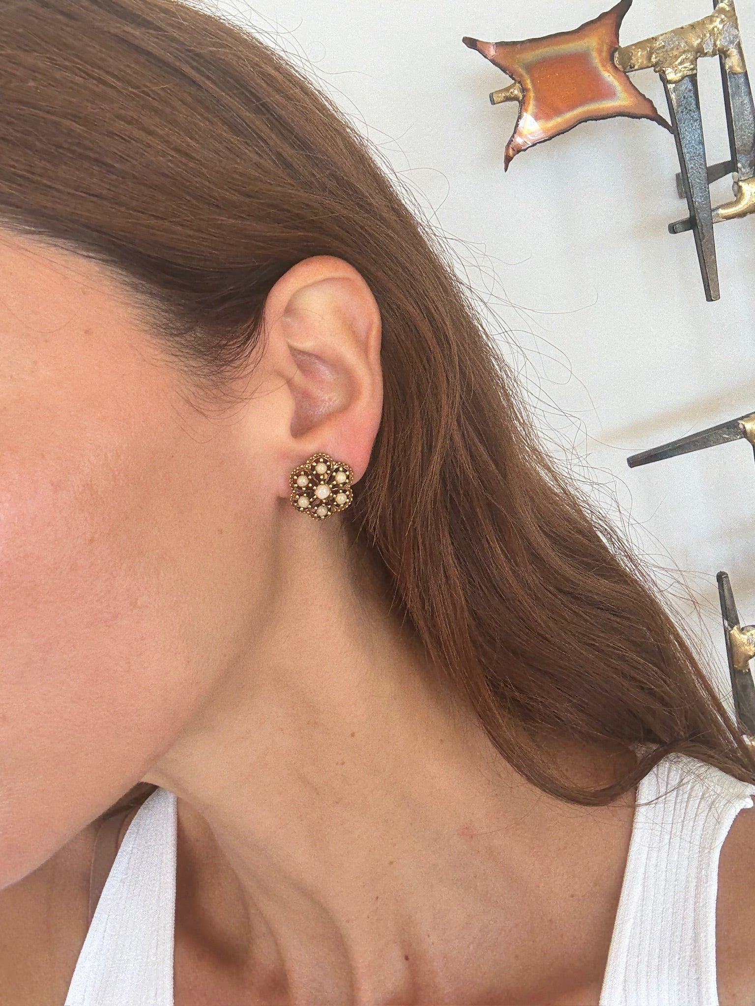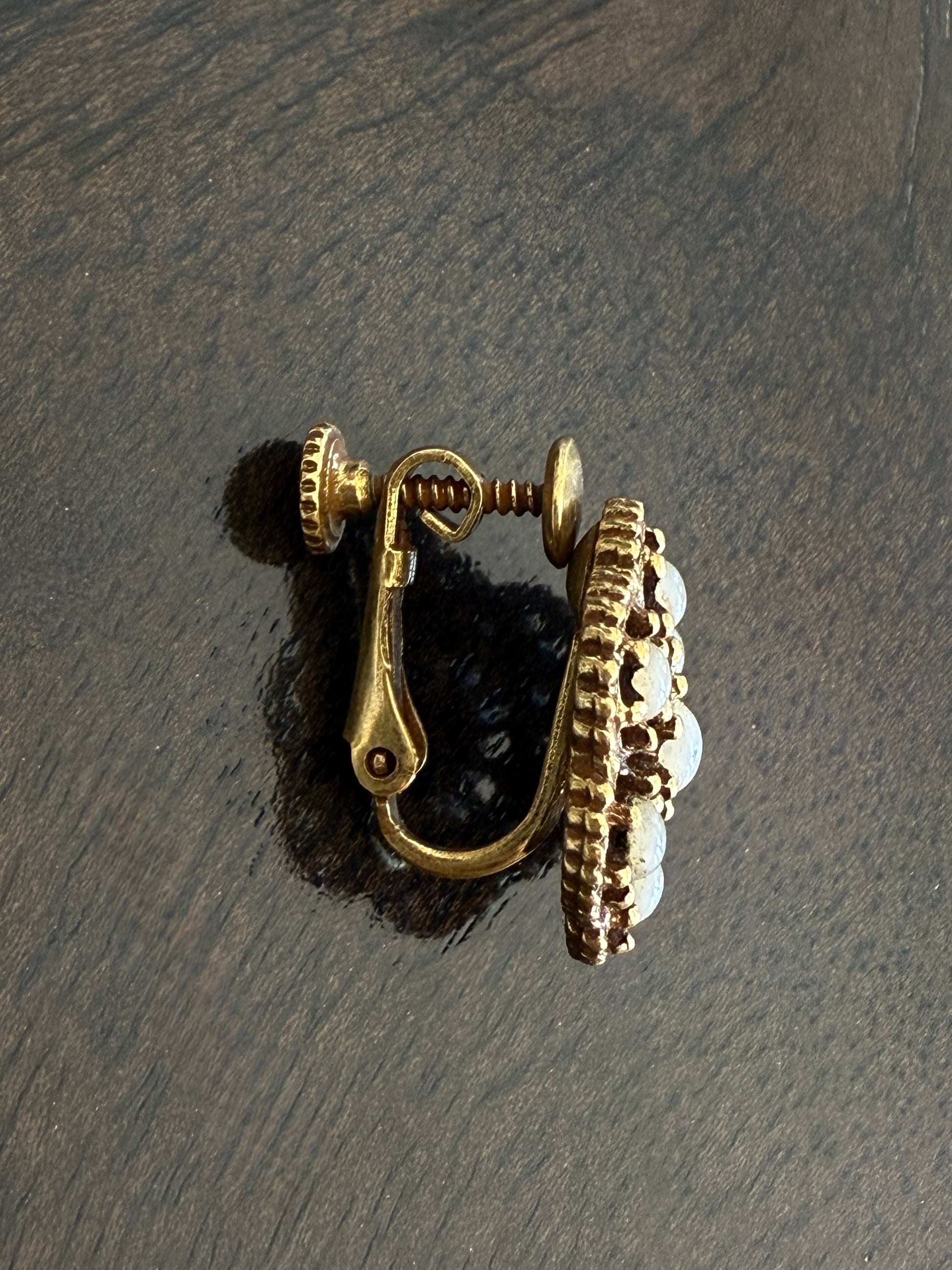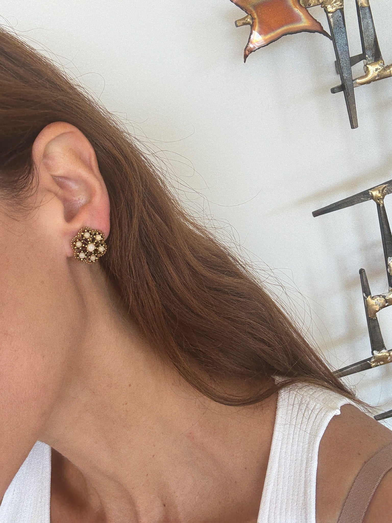 Vintage 1950's gold-tone cluster earrings featuring delicate mother of pearl stones arranged in a floral-inspired design. These clip-on earrings are lightweight yet striking, giving off an effortlessly chic, Old Hollywood-meets-Paris glamour vibe. Perfect for special occasions or adding a touch of vintage elegance to an everyday look.