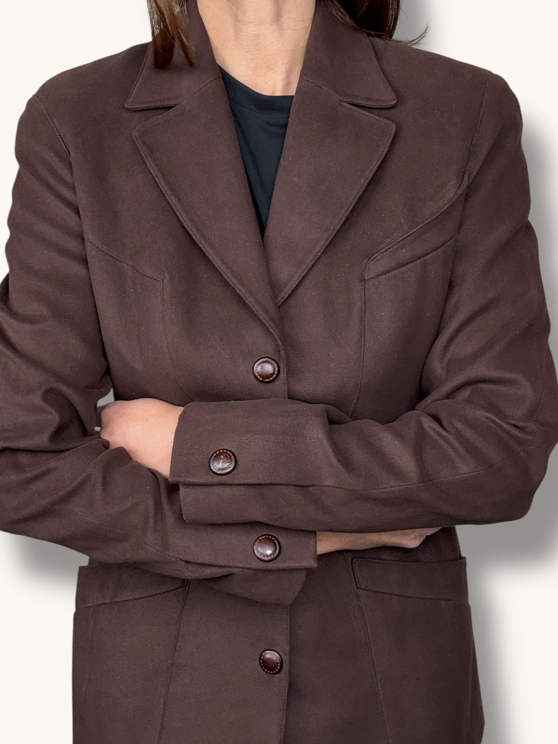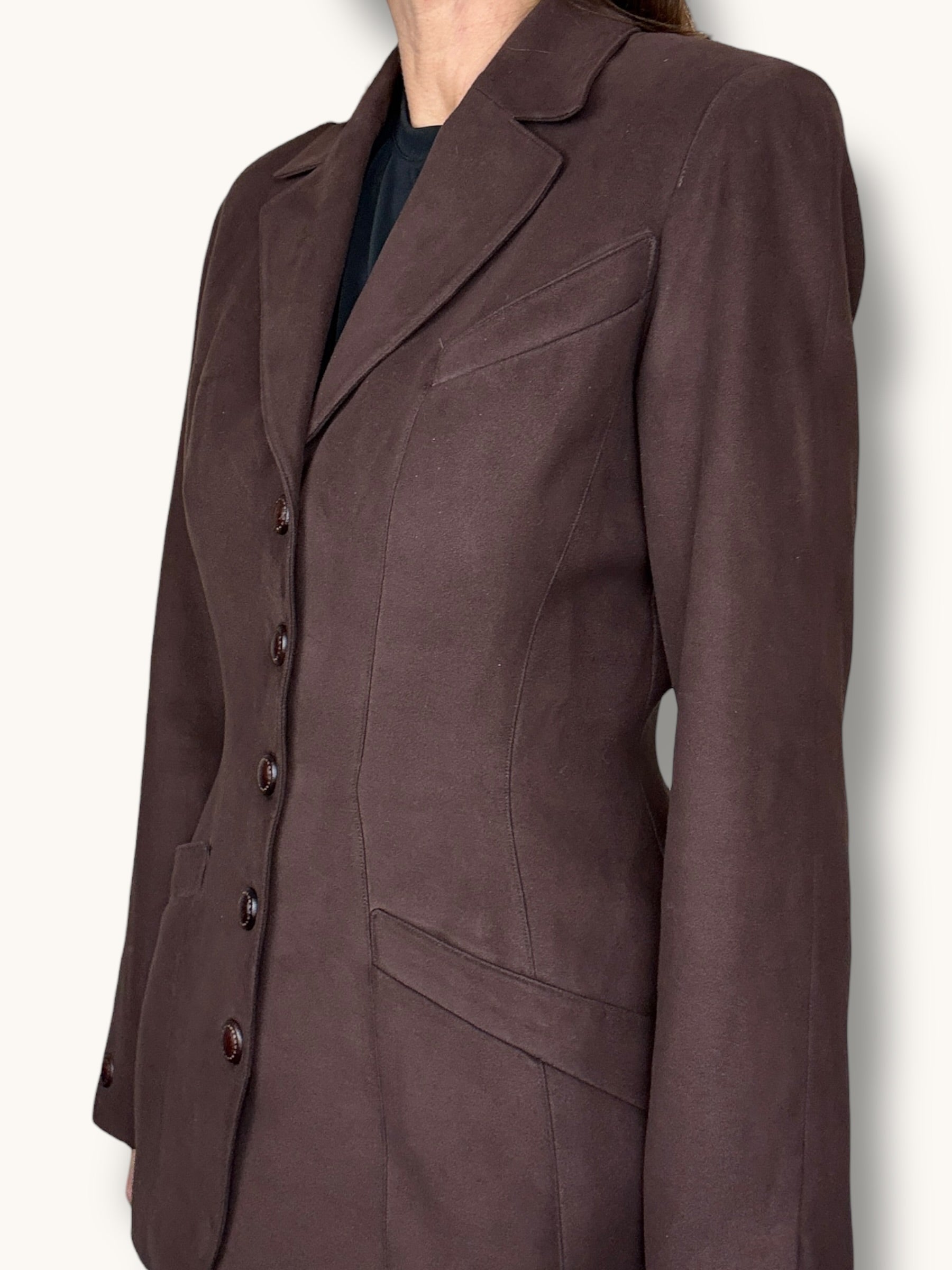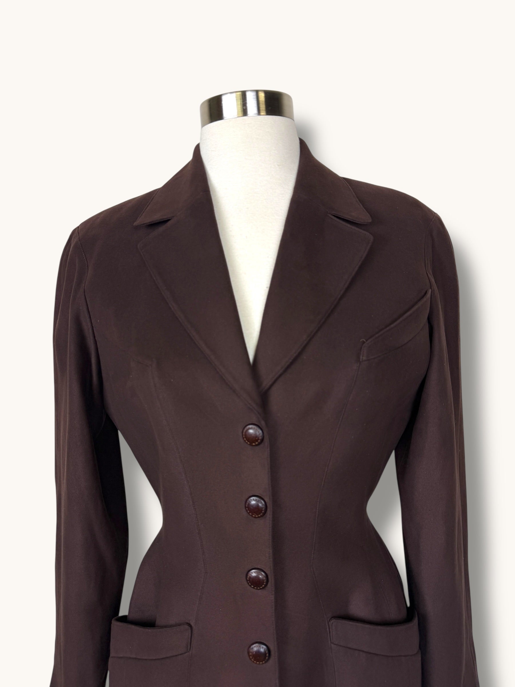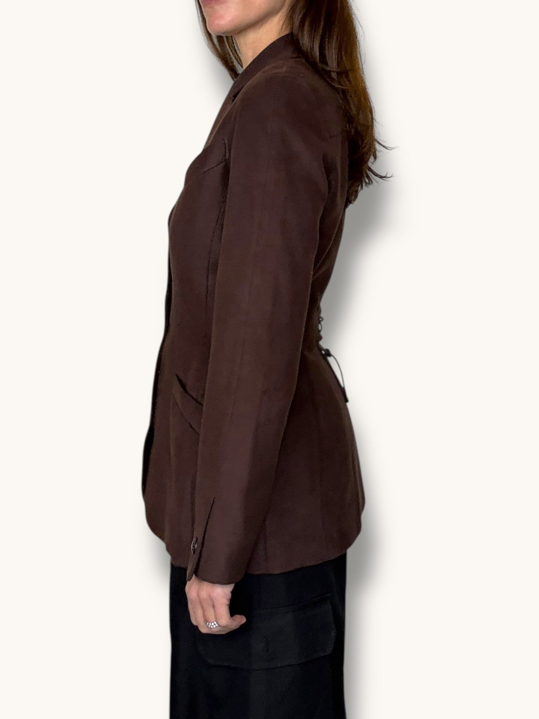 A sculptural vintage blazer by Mugler in a rich chocolate brown tone, showcasing the house’s iconic hourglass tailoring. Precision-cut seams contour the body to create a sharply defined waist, enhanced by the adjustable lace detail at the back that further cinches the silhouette. Designed with structured shoulders, classic lapels, tonal snap-buttons down the front, and angled pockets, the piece embodies Mugler’s powerful architectural style. Crafted from microsuede polyester, the fabric develops a soft peach-skin finish with a suede-like texture, giving it depth and richness while maintaining structure and durability. A striking and timeless Mugler blazer that perfectly captures the bold elegance of the era.