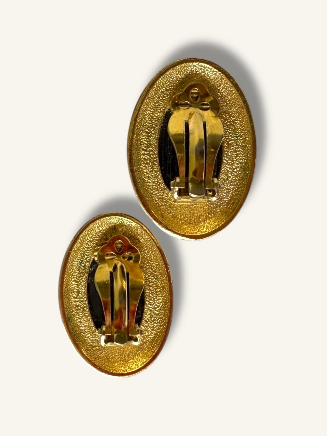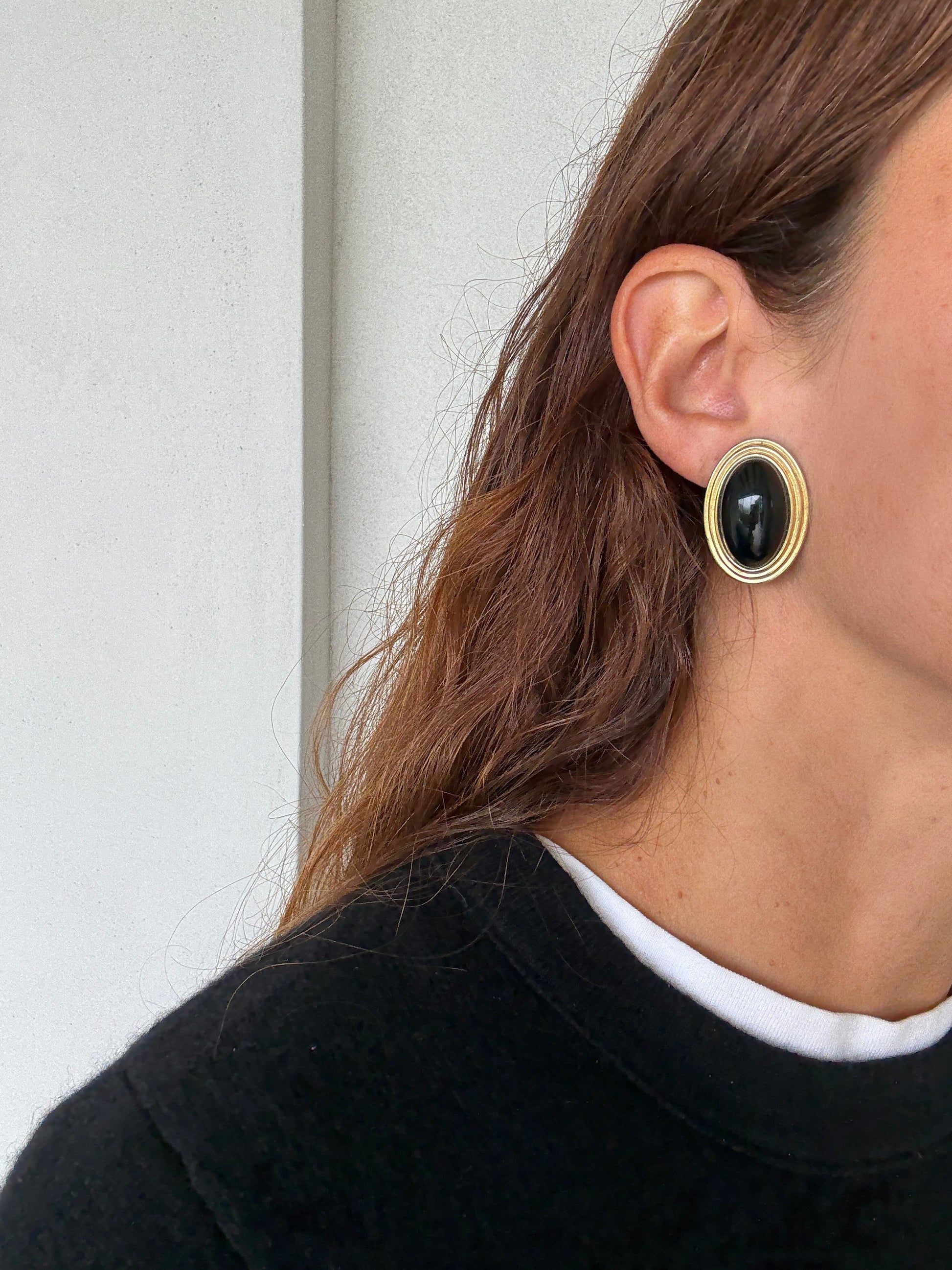 Vintage gold-tone clip-ons with black oval cabochon centers. Clean, minimal design with a smooth domed finish and layered frame detailing. Secure clip backs.