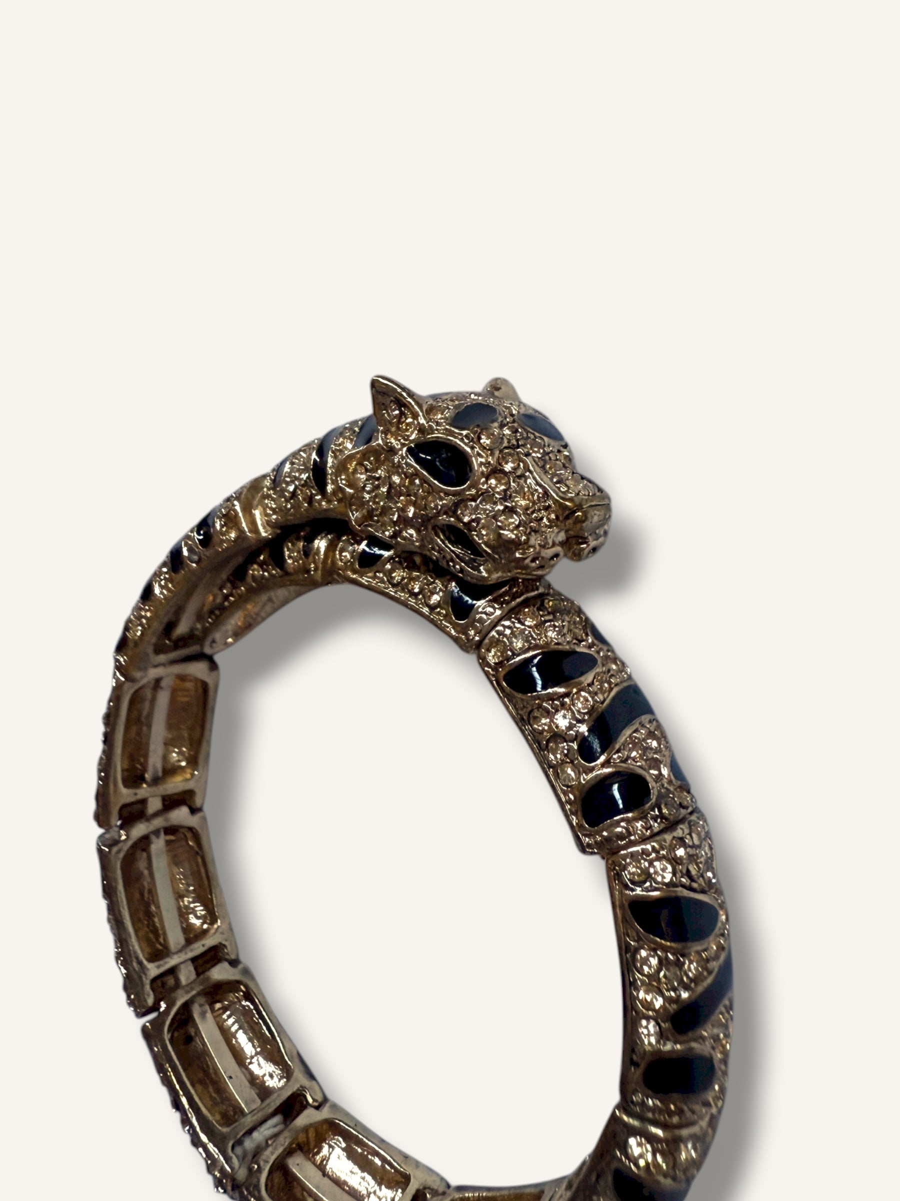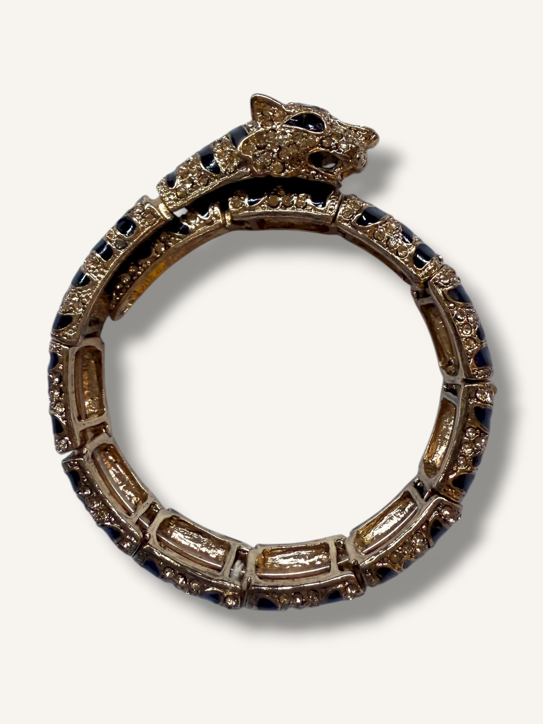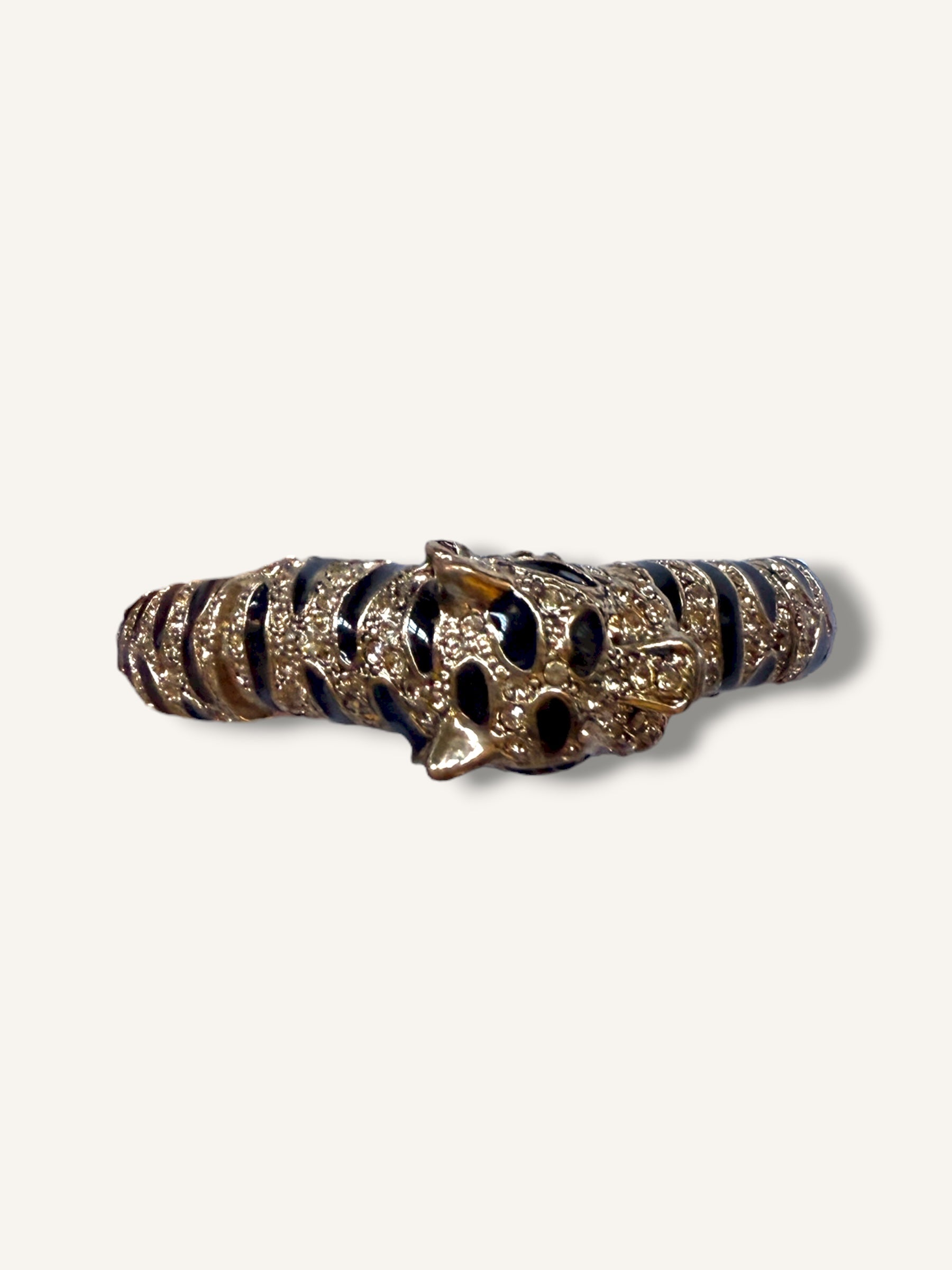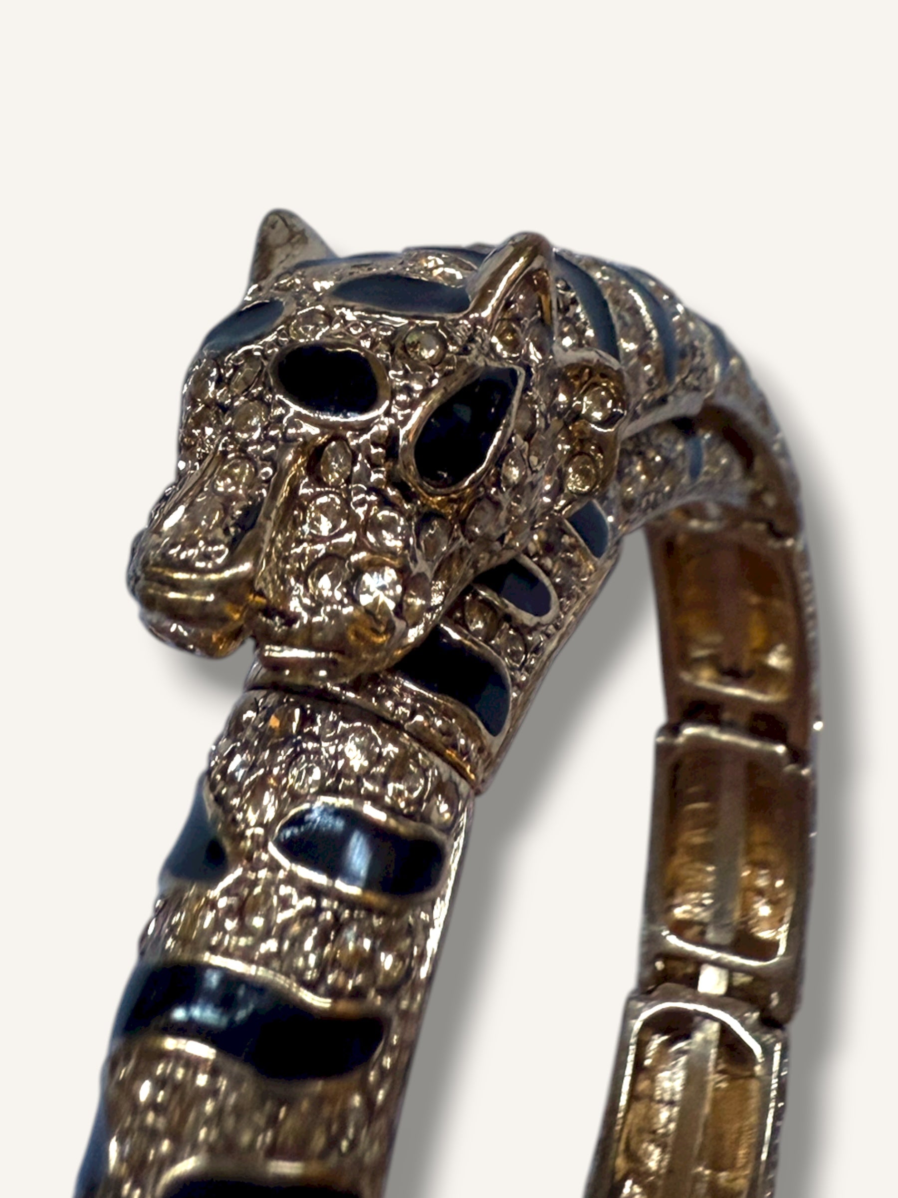 Vintage Panther Hinged Bracelet. A striking vintage statement piece featuring a sculpted panther wrapped elegantly around the wrist, finished in textured gold-tone metal with glossy black enamel and sparkling crystal accents. The hinged design makes it easy to slip on while maintaining a bold, structured silhouette. Dramatic yet refined, this bracelet feels like wearable art — very 80s couture energy. Perfect worn alone or stacked with gold bangles for a powerful, editorial look.