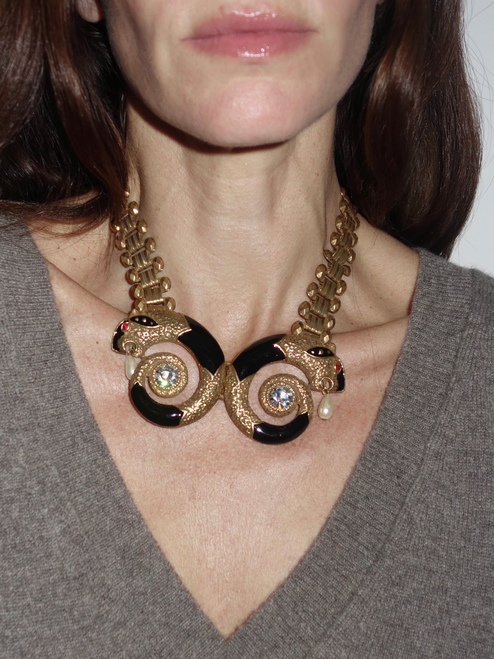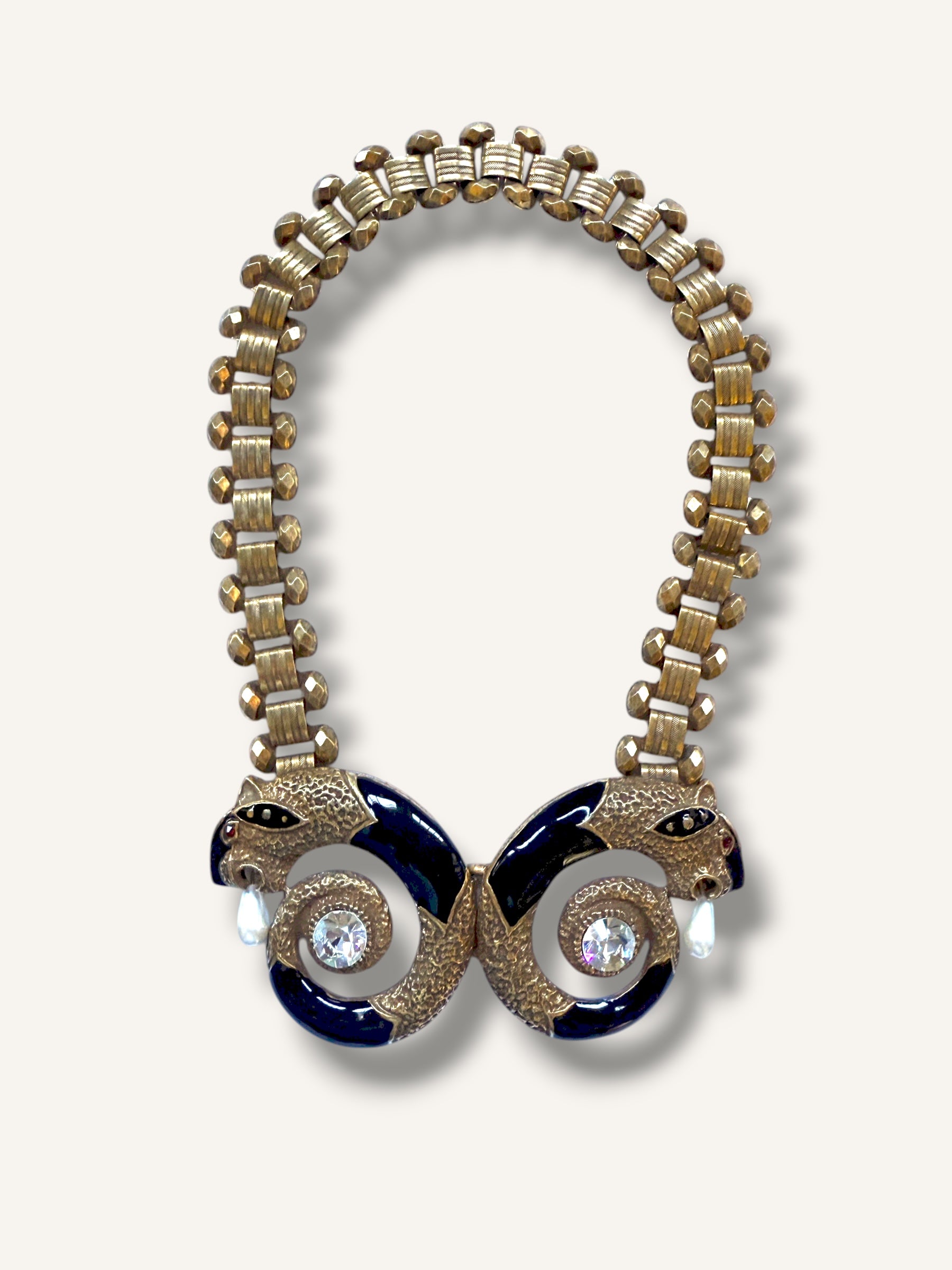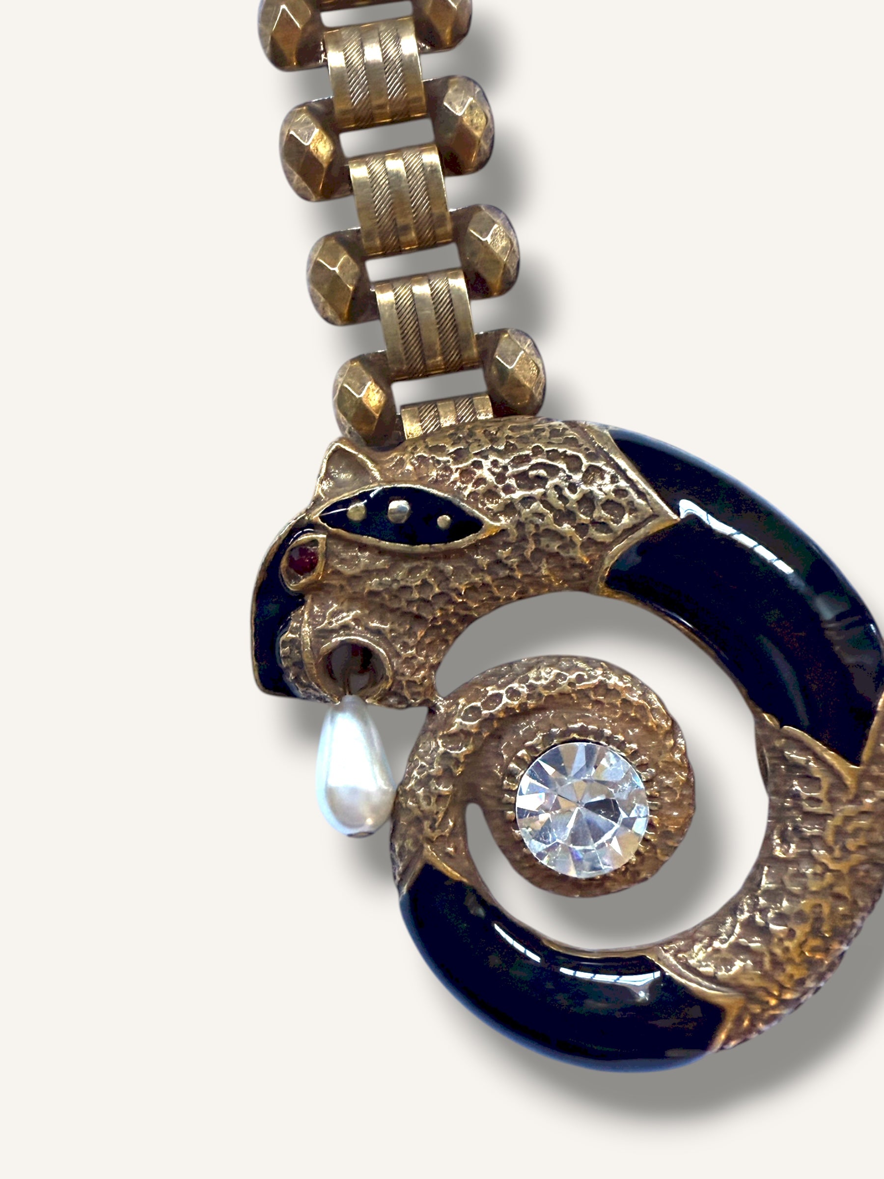 Vintage Alexis Kirk 1980s Statement Necklace, Extremely Rare. A striking collector’s piece from Alexi Kirk, circa 1980s, featuring twin panther heads in sculpted gold-tone metal wrapped in deep black enamel with brilliant crystal centers and teardrop pearl drops. The articulated chain is bold and dimensional, catching the light with every movement. Iconic, sculptural, and unmistakably dramatic, this necklace is wearable art — a museum-level vintage treasure that embodies the glamour and eccentricity of 80s statement jewelry. In excellent vintage condition. UNSIGNED.