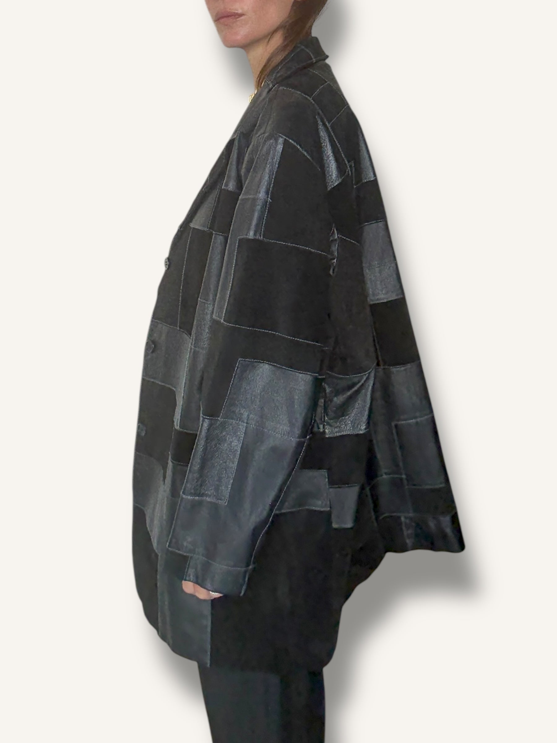 A statement Vintage outerwear piece crafted from rich black leather and suede in a bold patchwork design. This coat features an oversized fit with structured shoulders, a classic notched collar, and button-front closure. The mix of smooth leather and soft suede panels adds texture and depth, giving it a unique, elevated edge. Finished with long sleeves and a straight silhouette, it’s a versatile piece that layers effortlessly over both casual and dressy looks.
