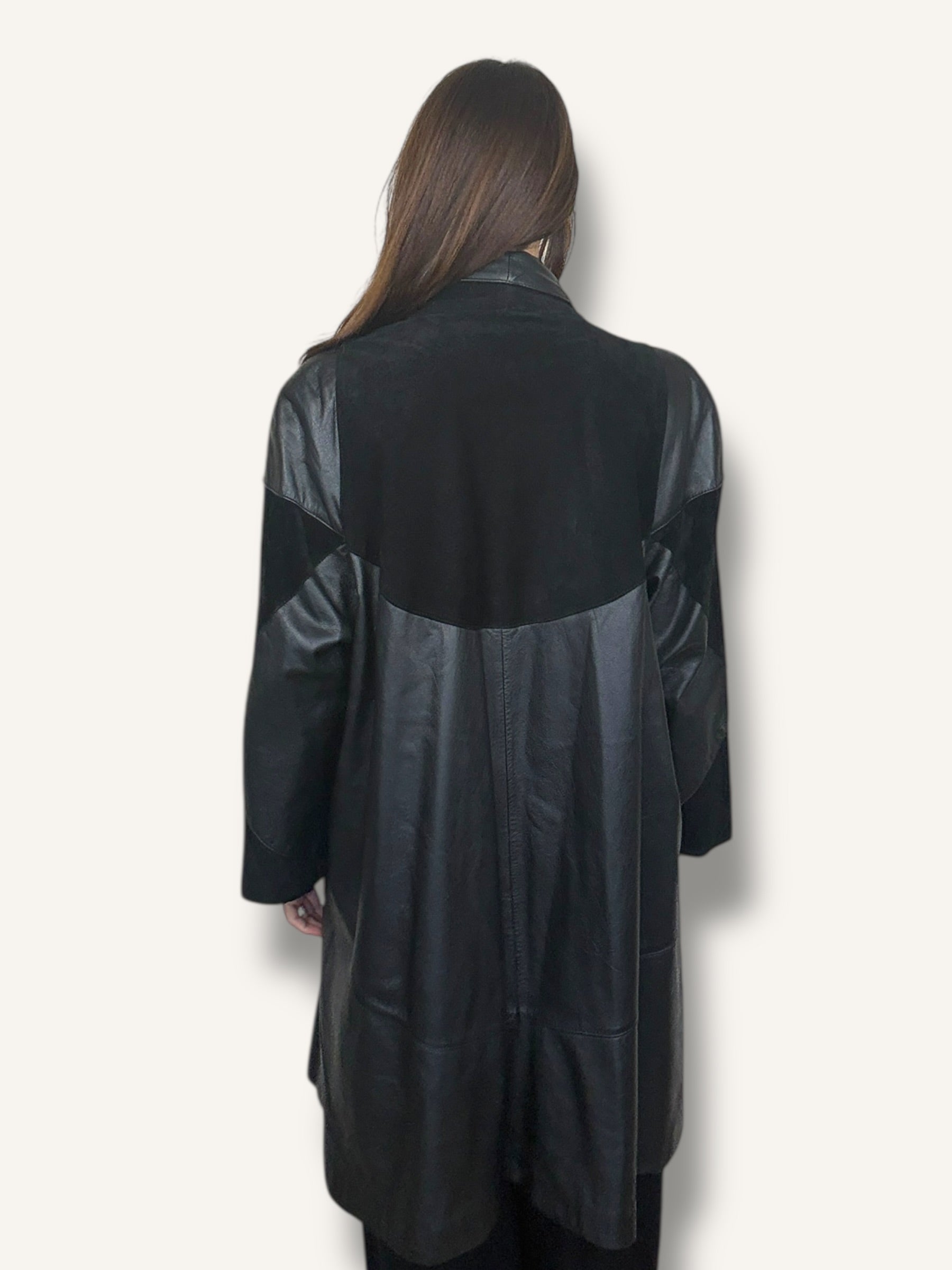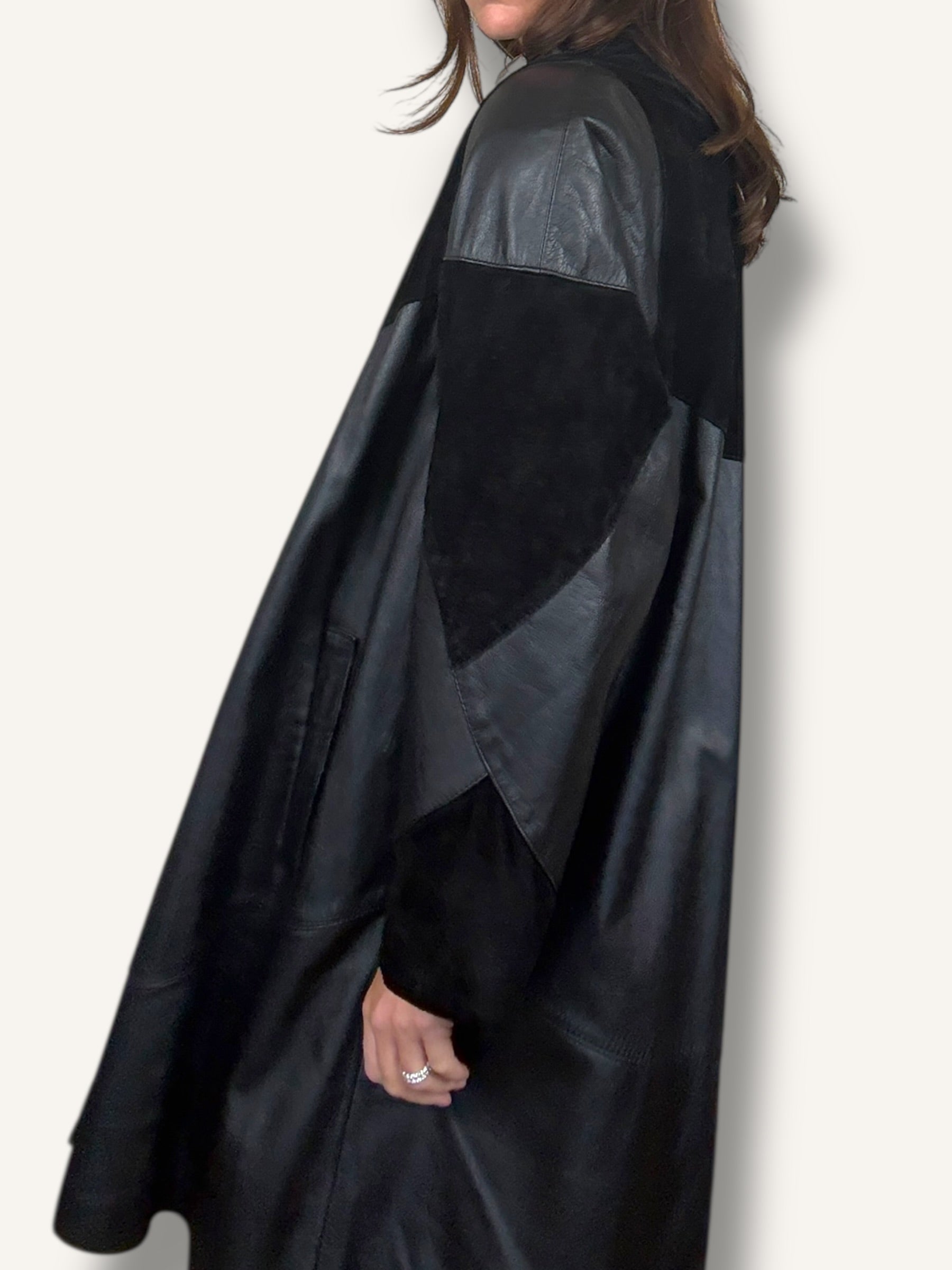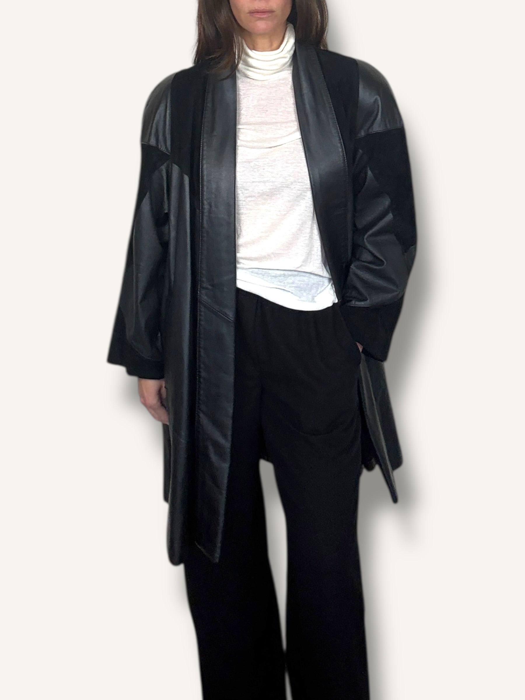 Vintage black leather duster with an effortlessly draped, open-front silhouette and a wide shawl collar that frames the neckline like a built-in scarf. Designed in sleek mixed panels (smooth leather with velvety suede-style insets) for subtle texture and that very ’80s/’90s minimalist drama, plus side pockets for ease. The perfect throw-on layer over denim, a slip dress, or all-black—instant polish with a little edge.
