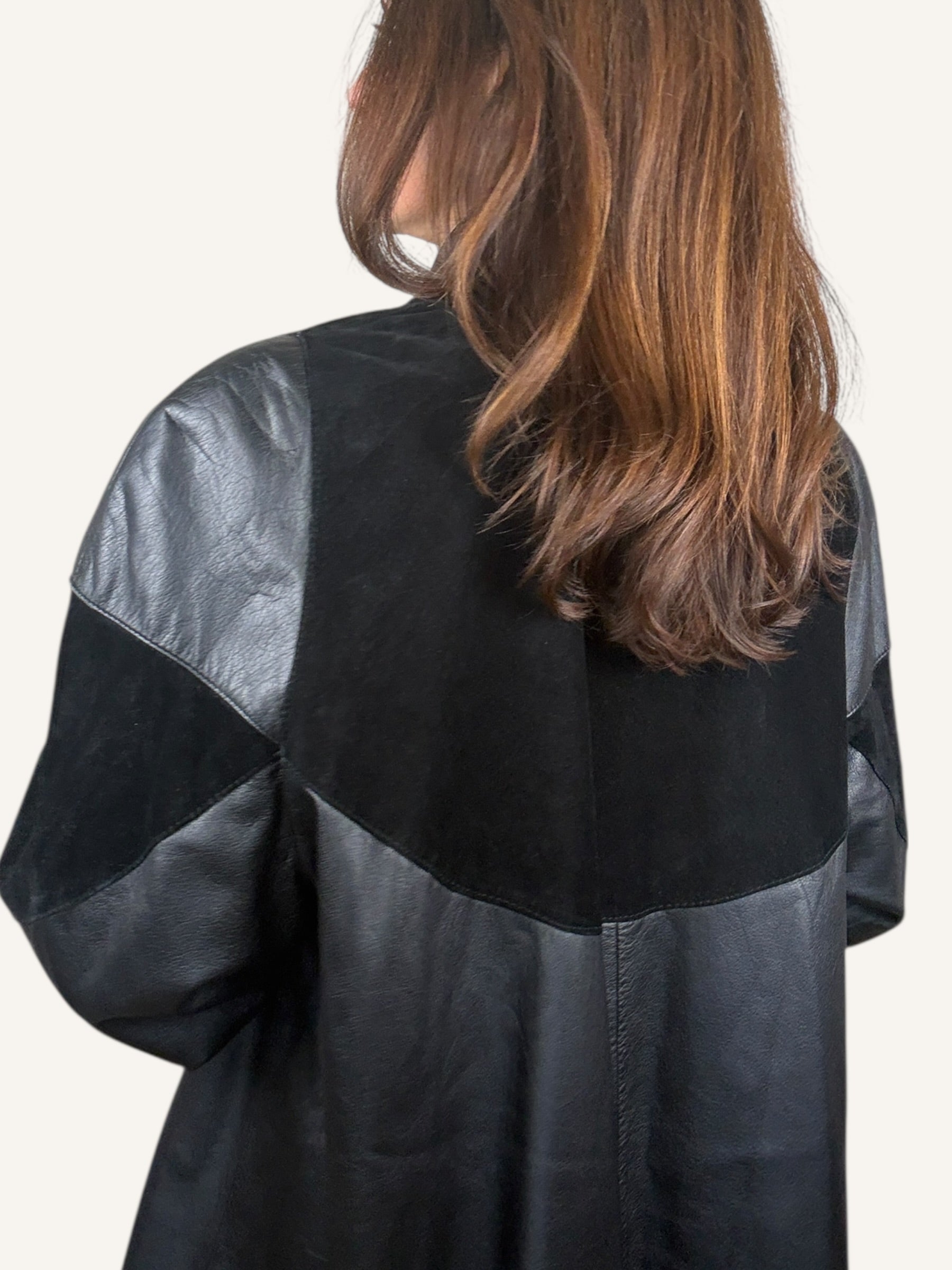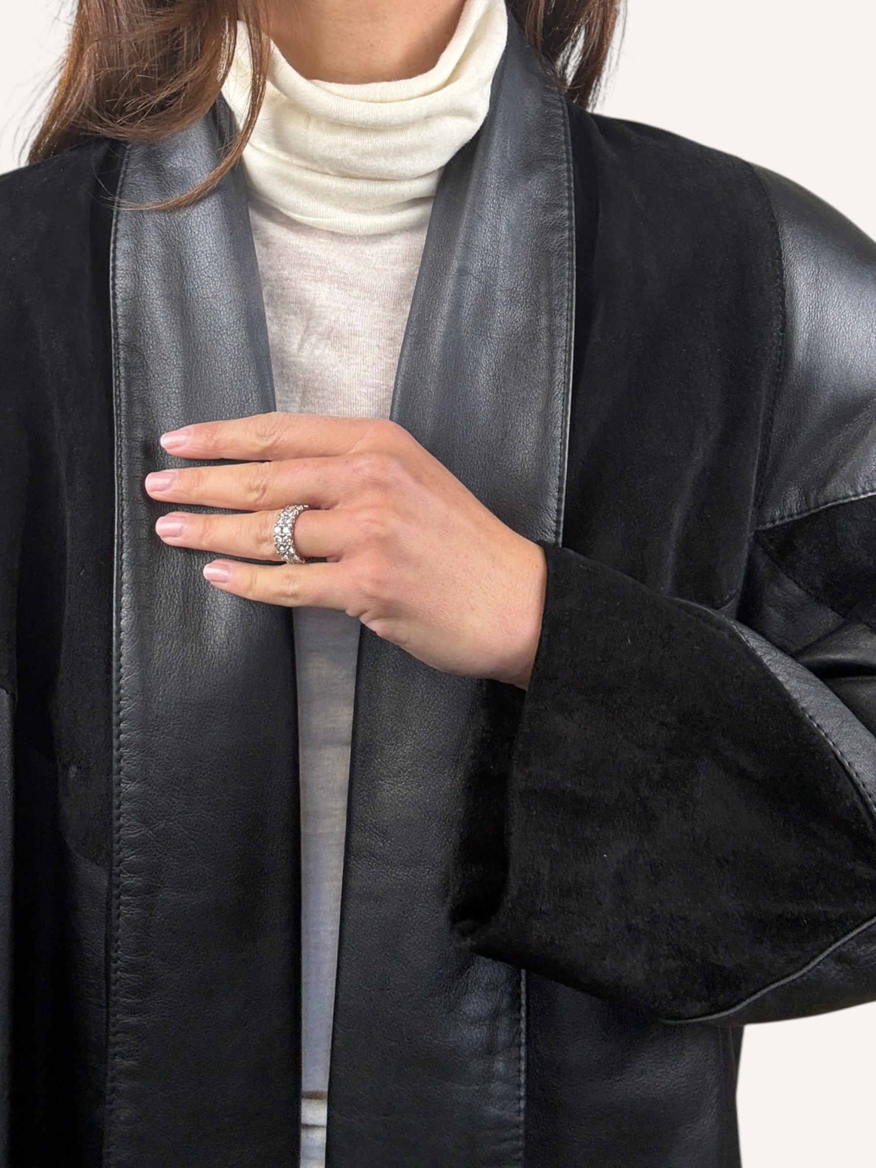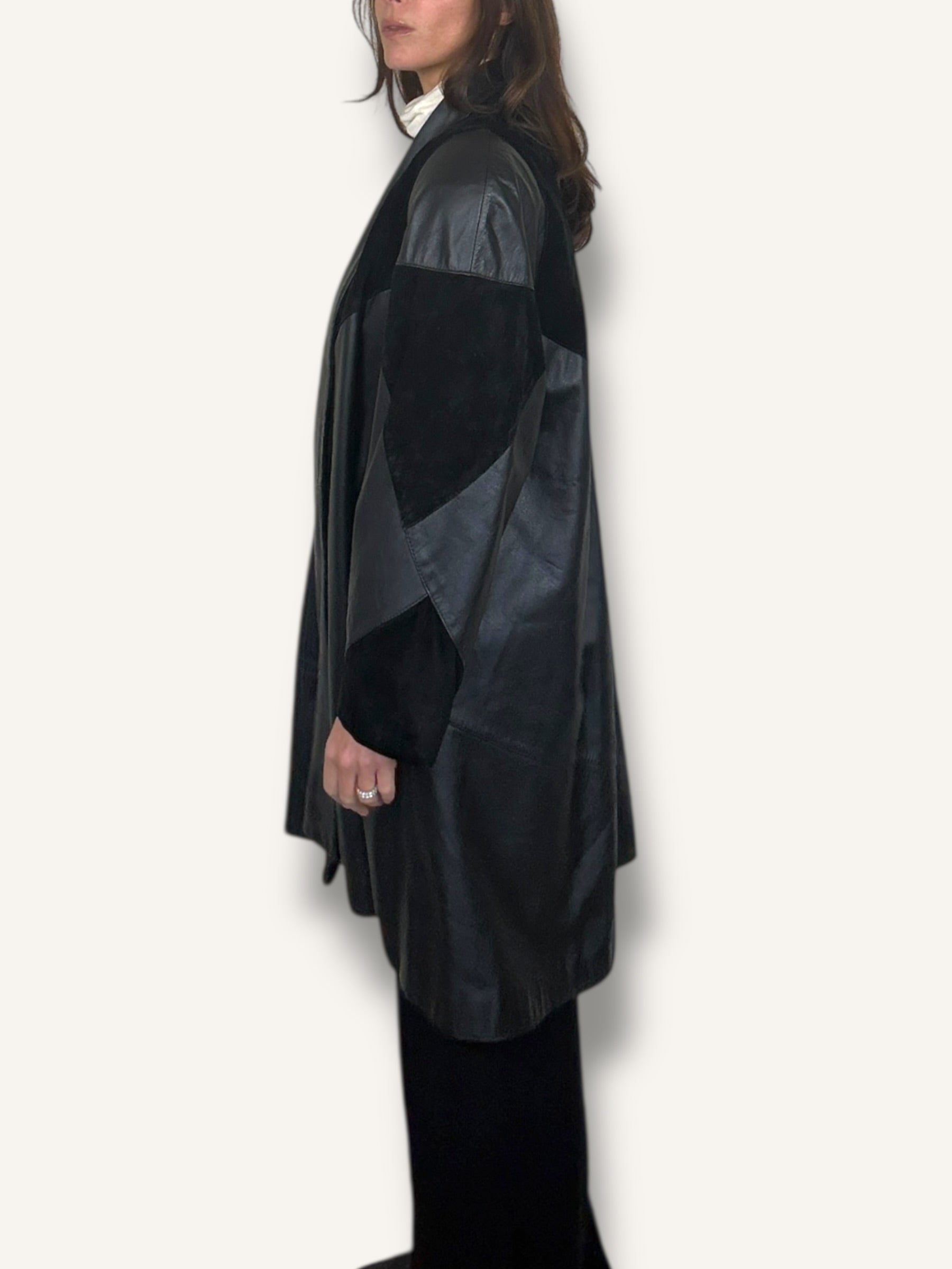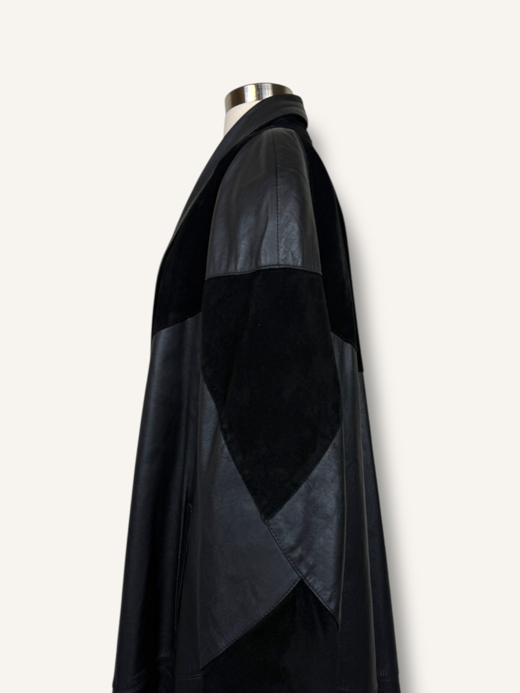 Vintage black leather duster with an effortlessly draped, open-front silhouette and a wide shawl collar that frames the neckline like a built-in scarf. Designed in sleek mixed panels (smooth leather with velvety suede-style insets) for subtle texture and that very ’80s/’90s minimalist drama, plus side pockets for ease. The perfect throw-on layer over denim, a slip dress, or all-black—instant polish with a little edge.