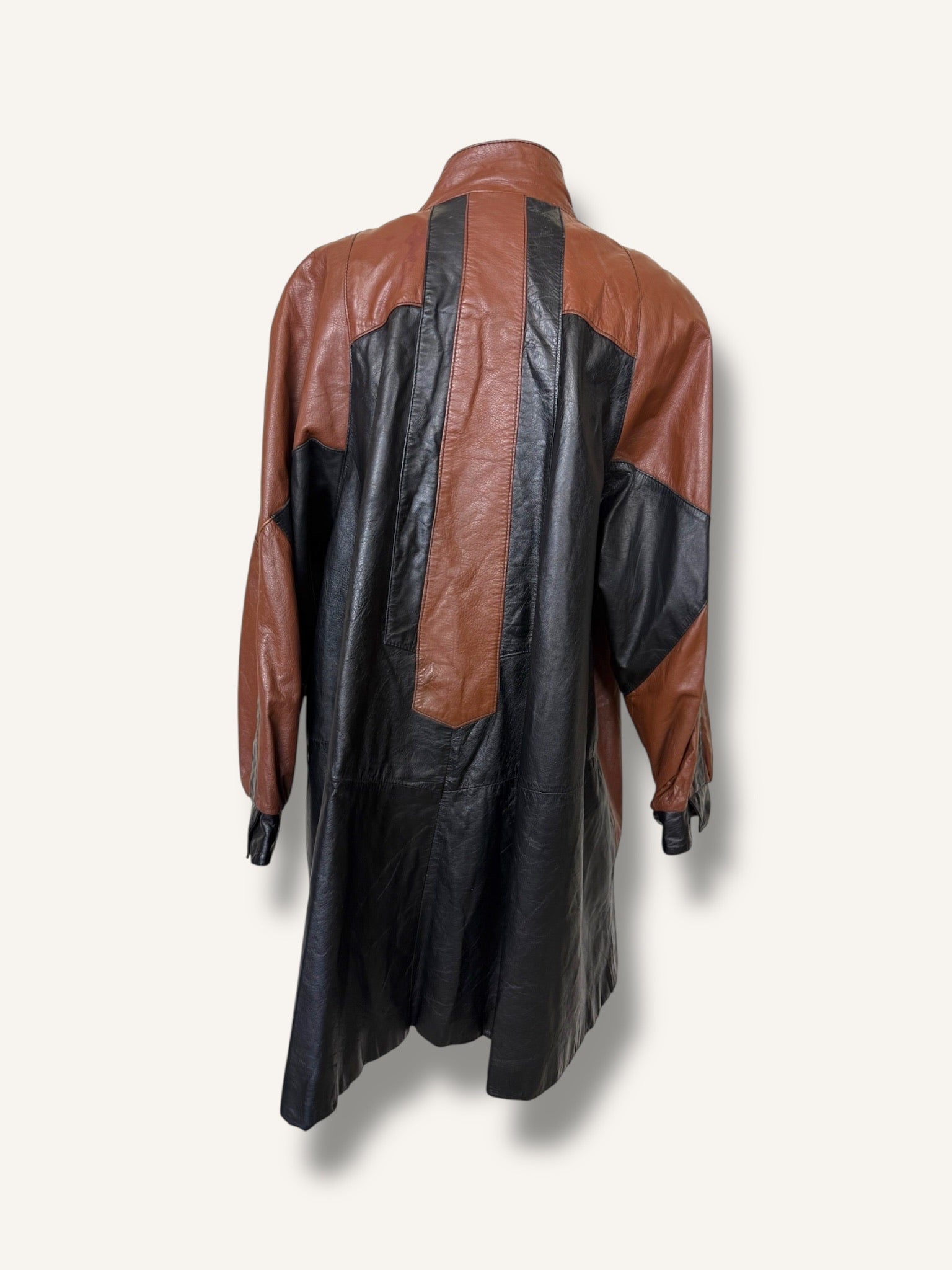 Vintage Two-Tone Leather Coat. Bold and graphic, this 1980s vintage leather coat features an eye-catching patchwork design in rich chocolate brown and deep black. Crafted from supple leather with a relaxed, oversized fit, it blends sharp geometric panels with soft structure. Button-front closure, side pockets, and a high collar option for a sleek finish, a true statement piece that channels effortless retro cool.