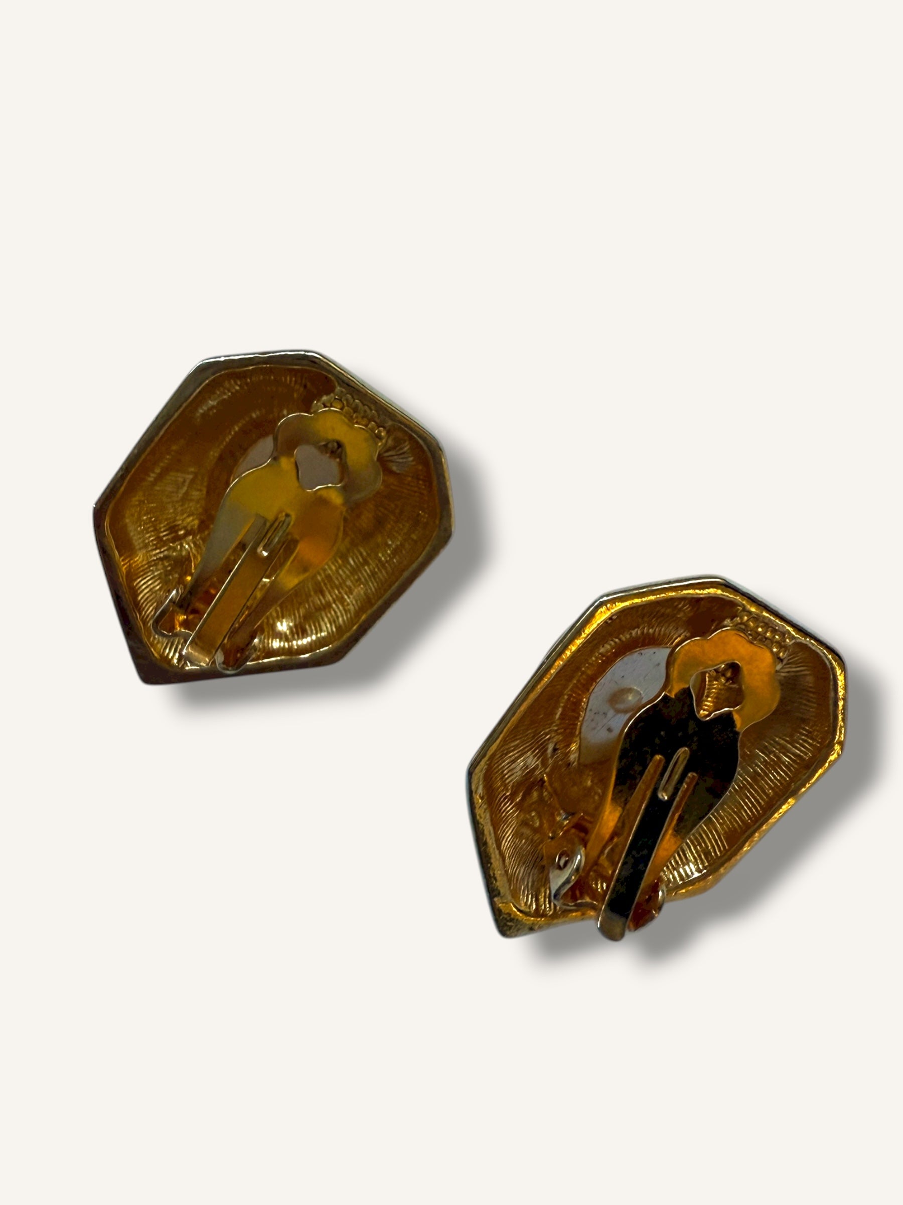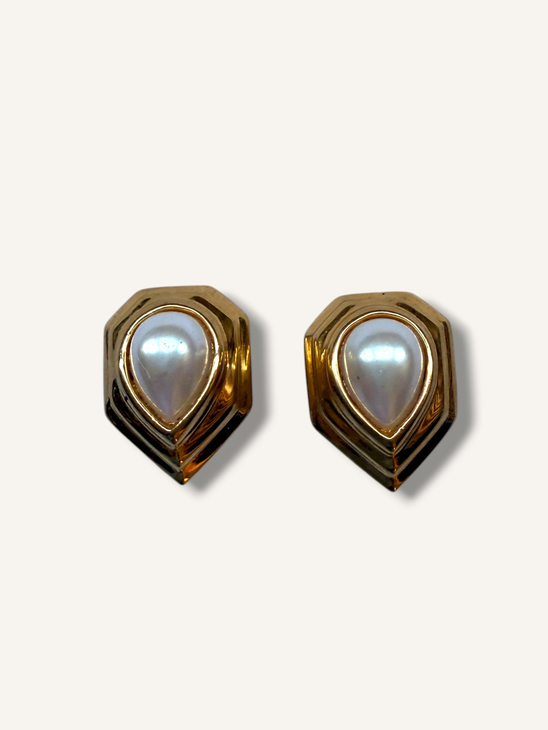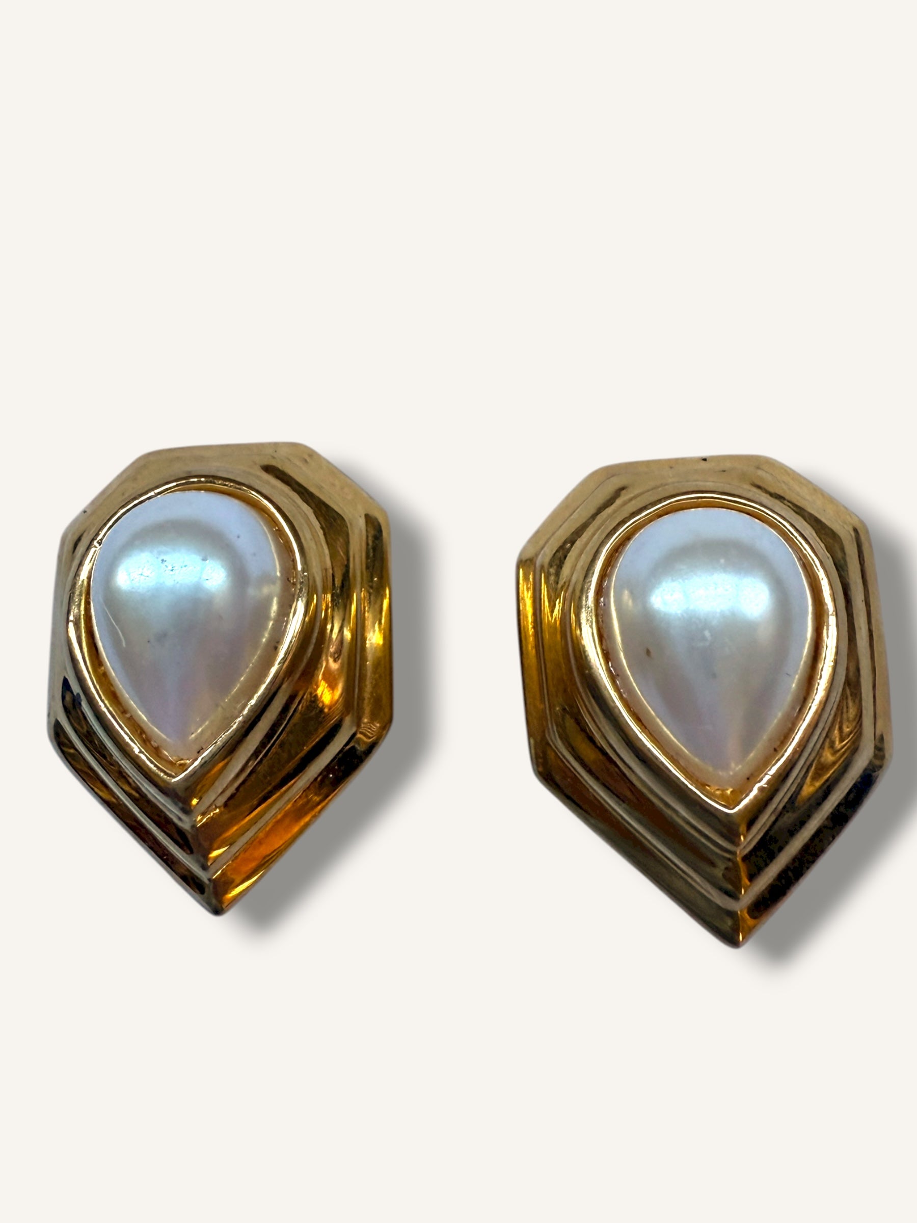 Vintage 1980s Clip-On Earrings. Pearl Drop Shape + Gold. A sleek and elegant pair from the 1980s featuring a pear-shaped faux pearl set in sculpted gold-tone metal with a subtle architectural edge. The shape is refined and elongating, instantly elevating any look with that minimal, luxurious 80s vibe. Clip backs make them comfortable and easy to wear. A timeless, chic pair, perfect with a blazer, a silk blouse, or evening styling. Only one pair available.