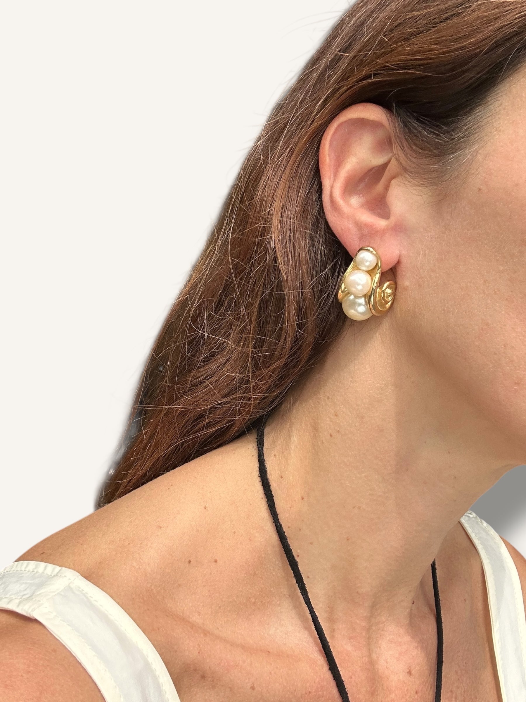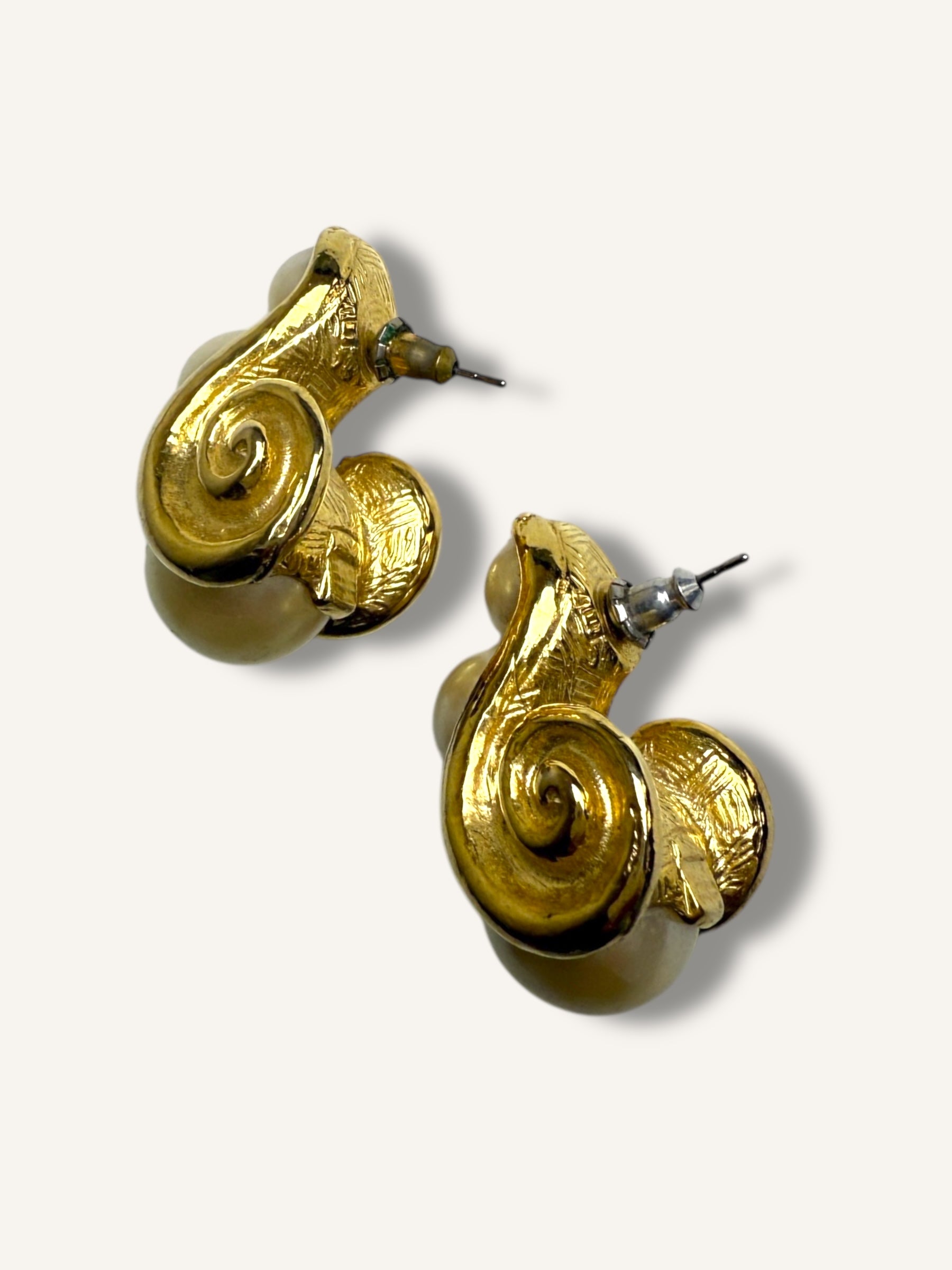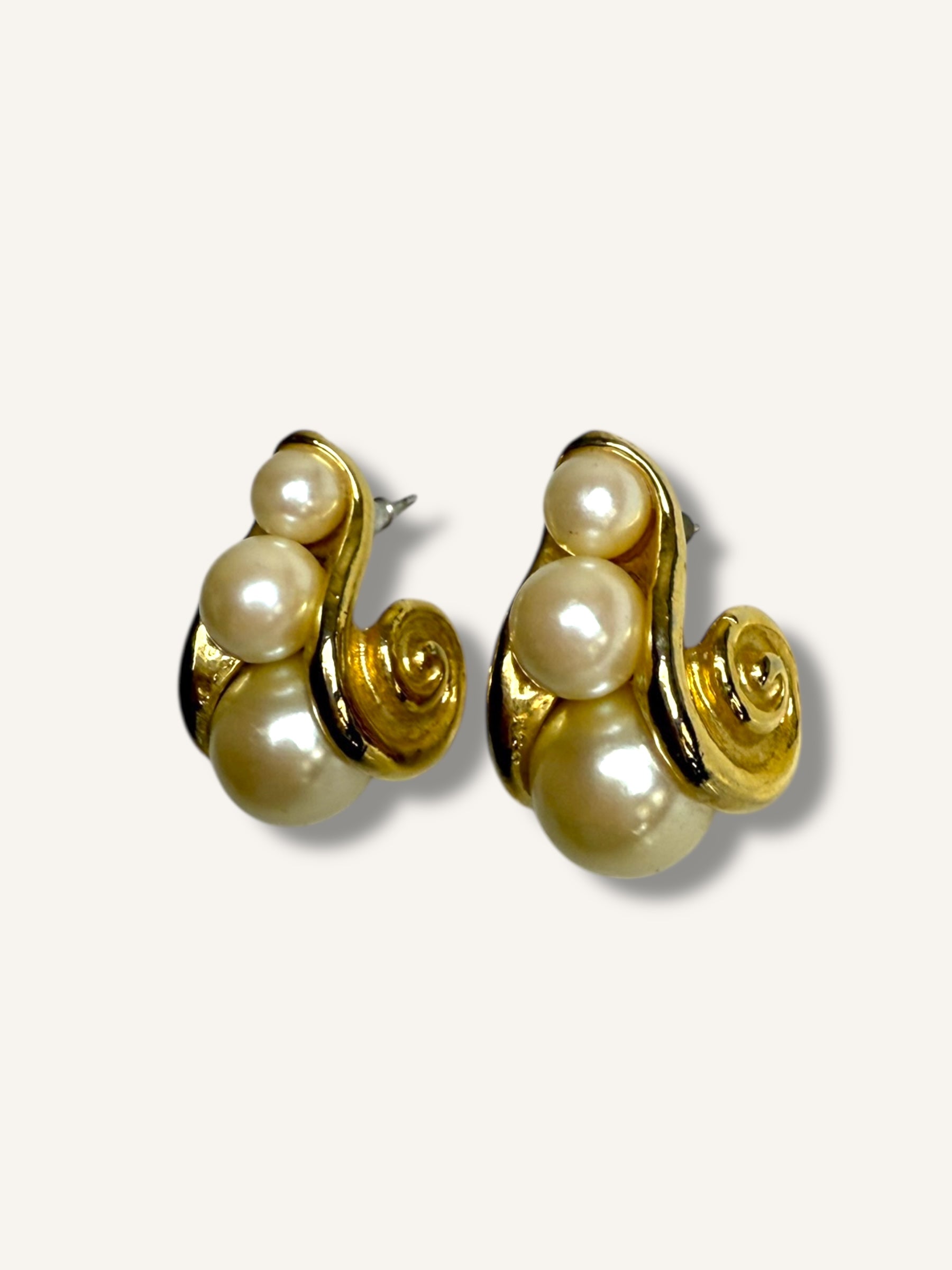 Channeling a glamorous 1980s aesthetic, these vintage earrings feature a sculptural gold-tone swirl design embellished with clusters of faux pearls. For pierced ears, the textured spiral motif and the luminous pearls bring an elegant contrast. With their bold shape and post-back closure, these earrings are a perfect statement piece for vintage lovers drawn to timeless drama and sophisticated charm.