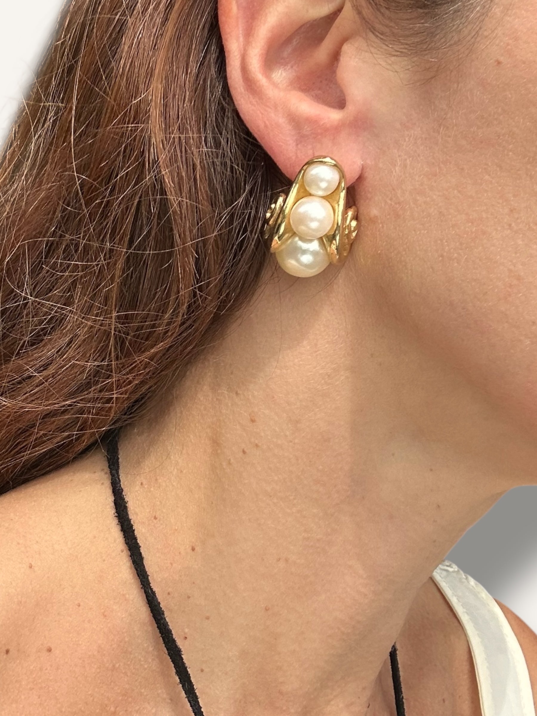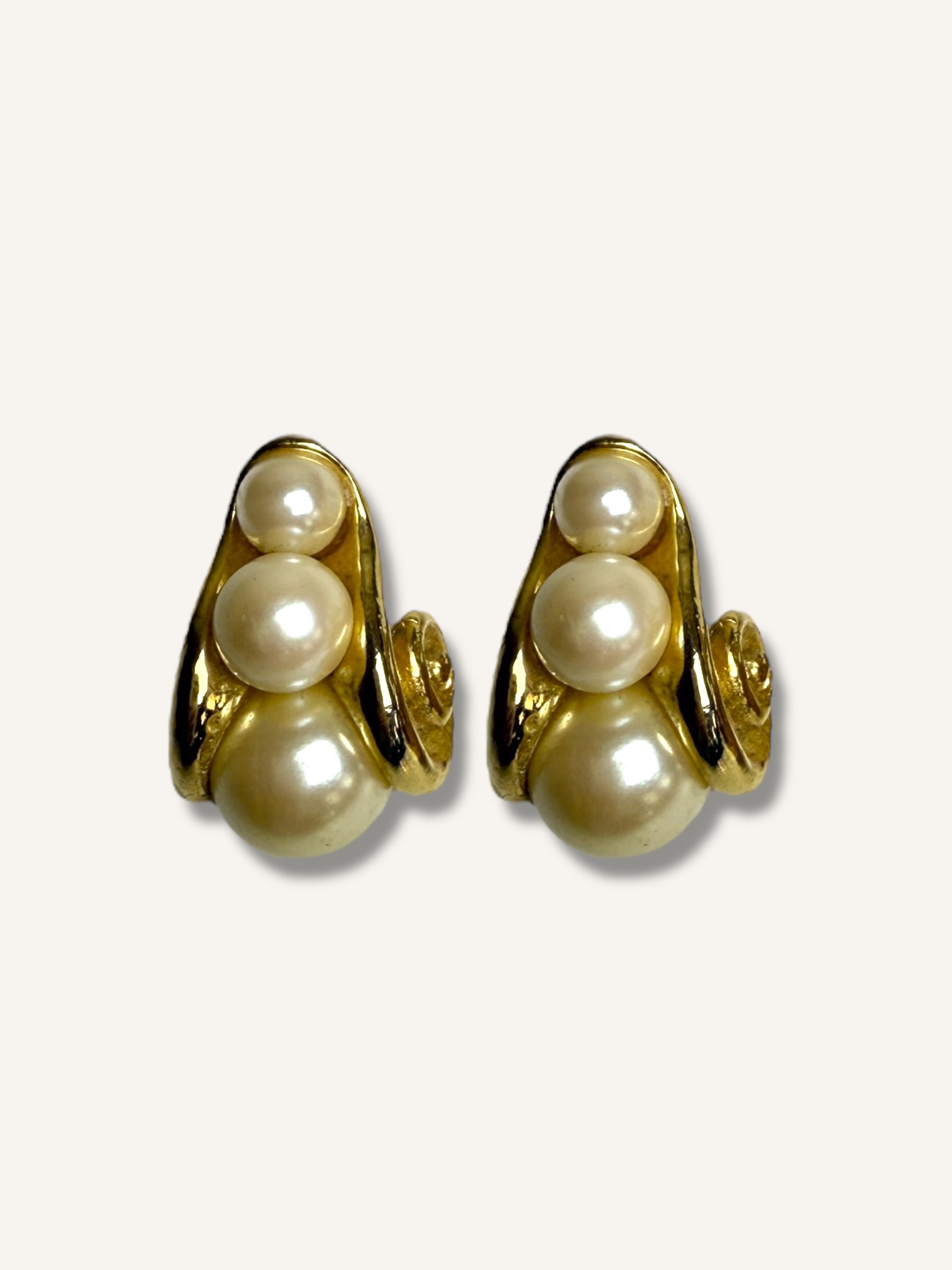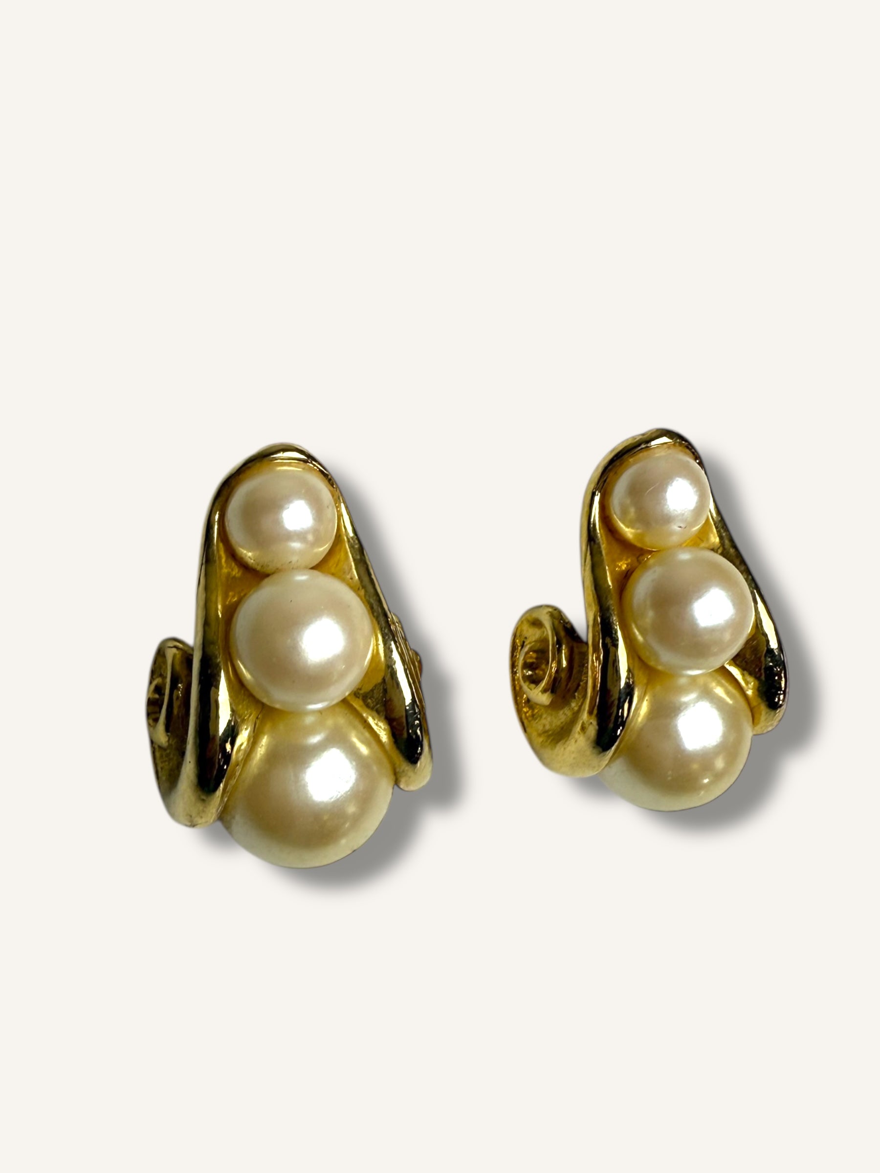 Channeling a glamorous 1980s aesthetic, these vintage earrings feature a sculptural gold-tone swirl design embellished with clusters of faux pearls. For pierced ears, the textured spiral motif and the luminous pearls bring an elegant contrast. With their bold shape and post-back closure, these earrings are a perfect statement piece for vintage lovers drawn to timeless drama and sophisticated charm.