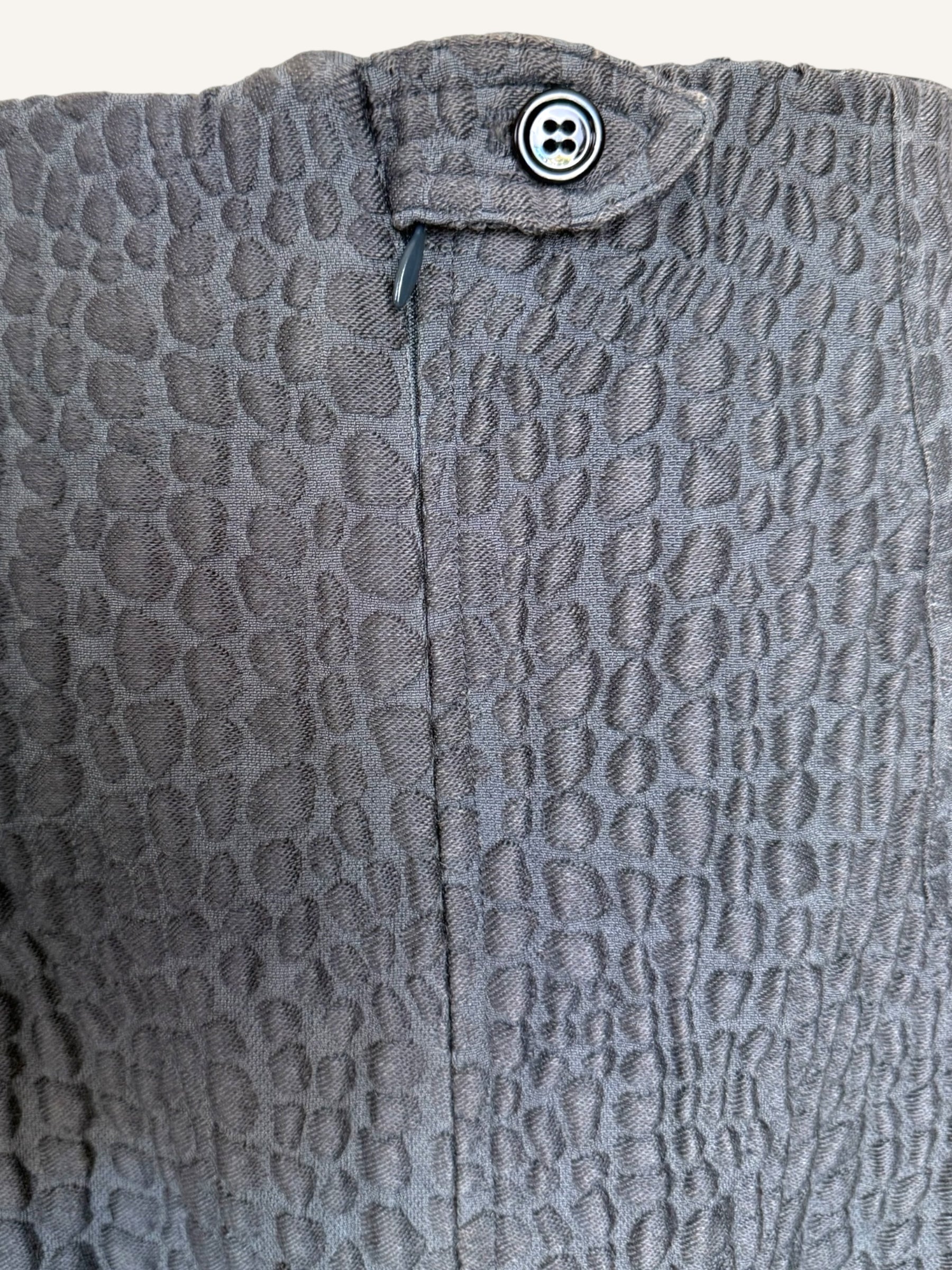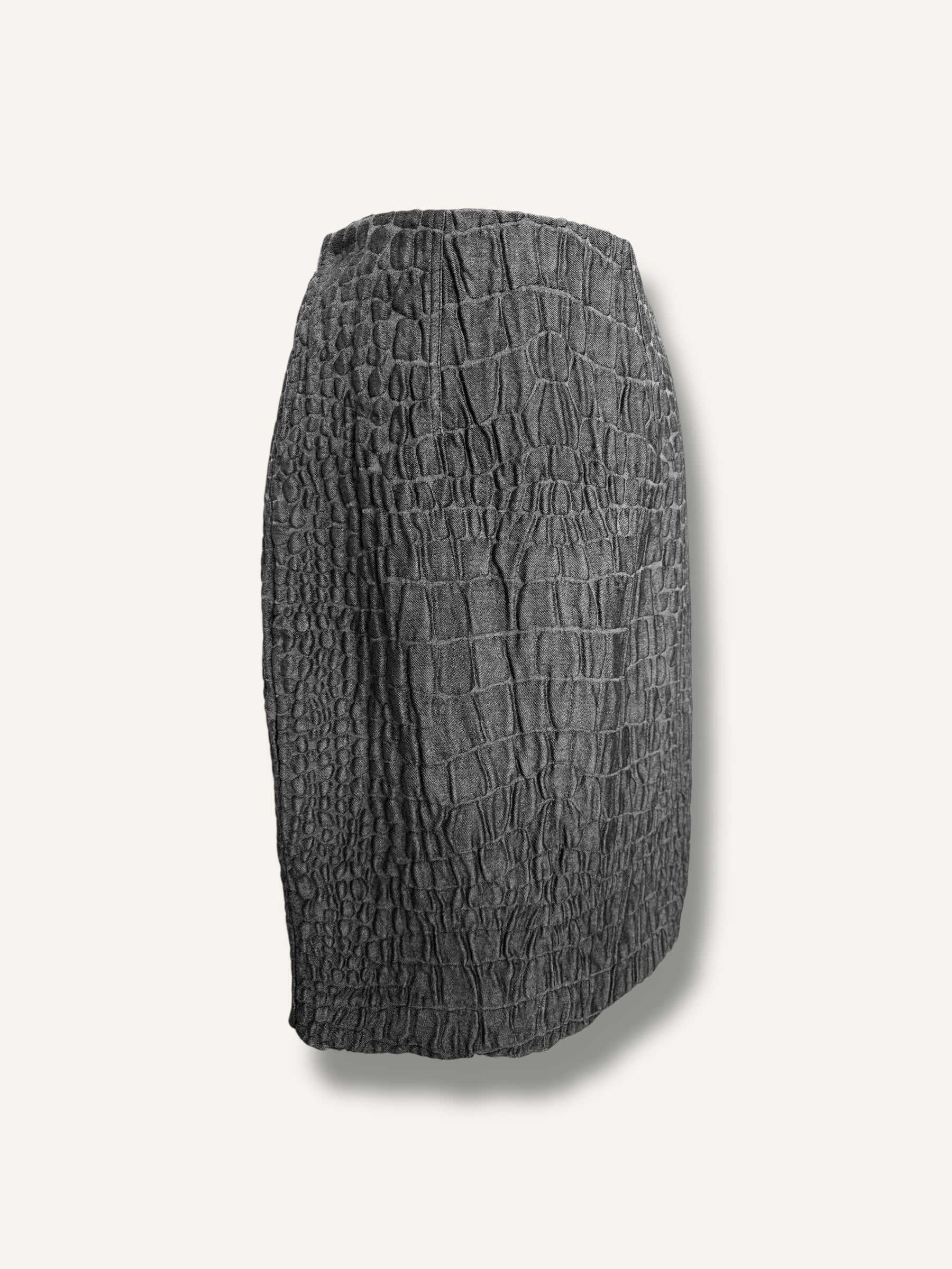 High-waisted vintage Yves Saint Laurent Rive Gauche skirt in a deep charcoal gray with an embossed, textured crocodile-style pattern. Features a back button and zip closure, with a back slit accented by a button detail. Fully lined for structure and comfort. Made in France.