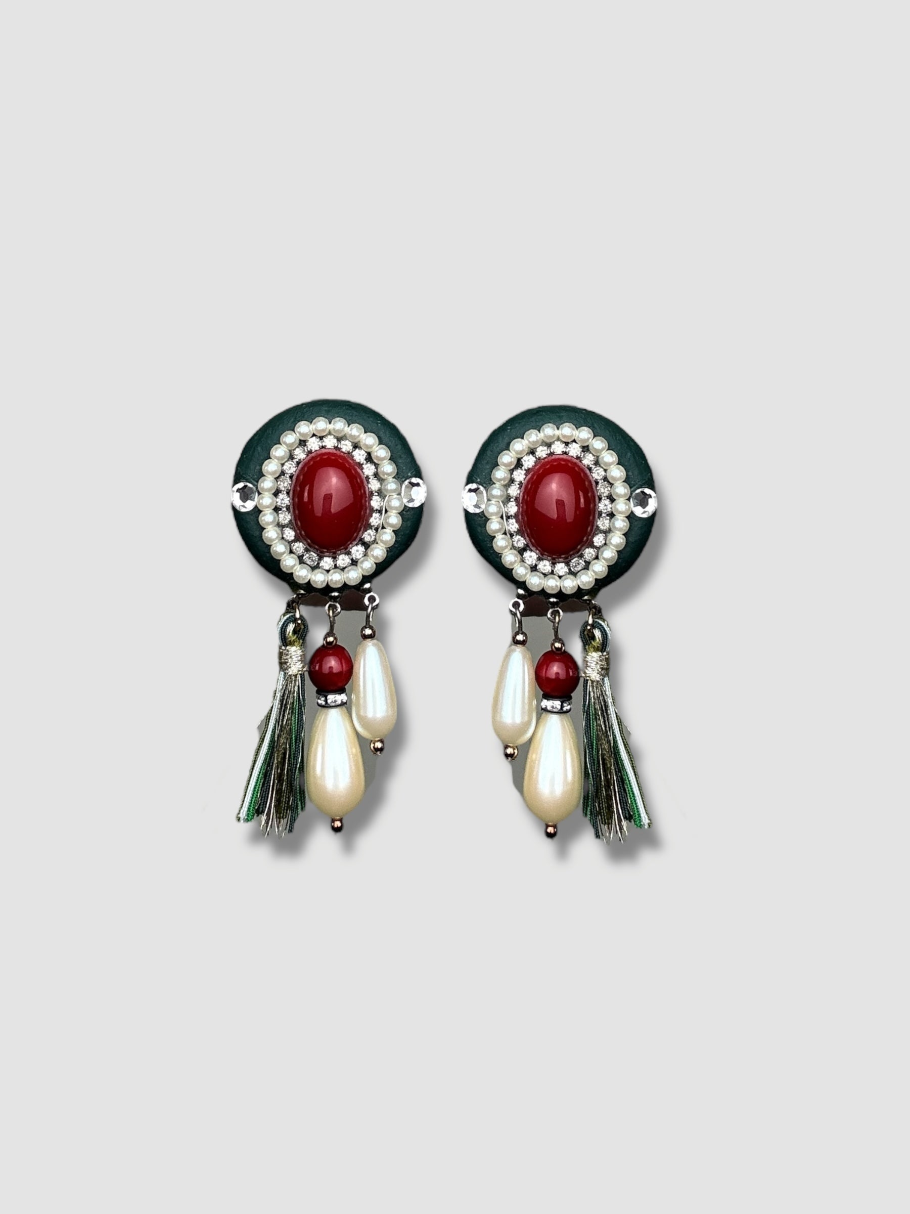 Vintage statement Clip-ons earrings featuring a bold red cabochon surrounded by a halo of tiny faux pearls and rhinestones, all set on a rich emerald green base. The drop section includes teardrop faux pearls, ruby-red beads, and metallic tassels for added movement and glamour. A rare and vibrant piece that channels 80s maximalism.