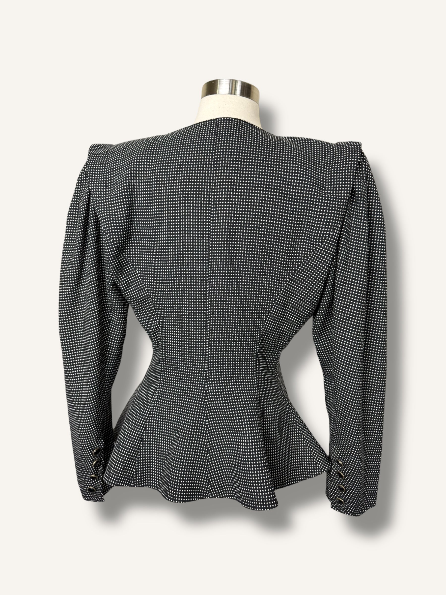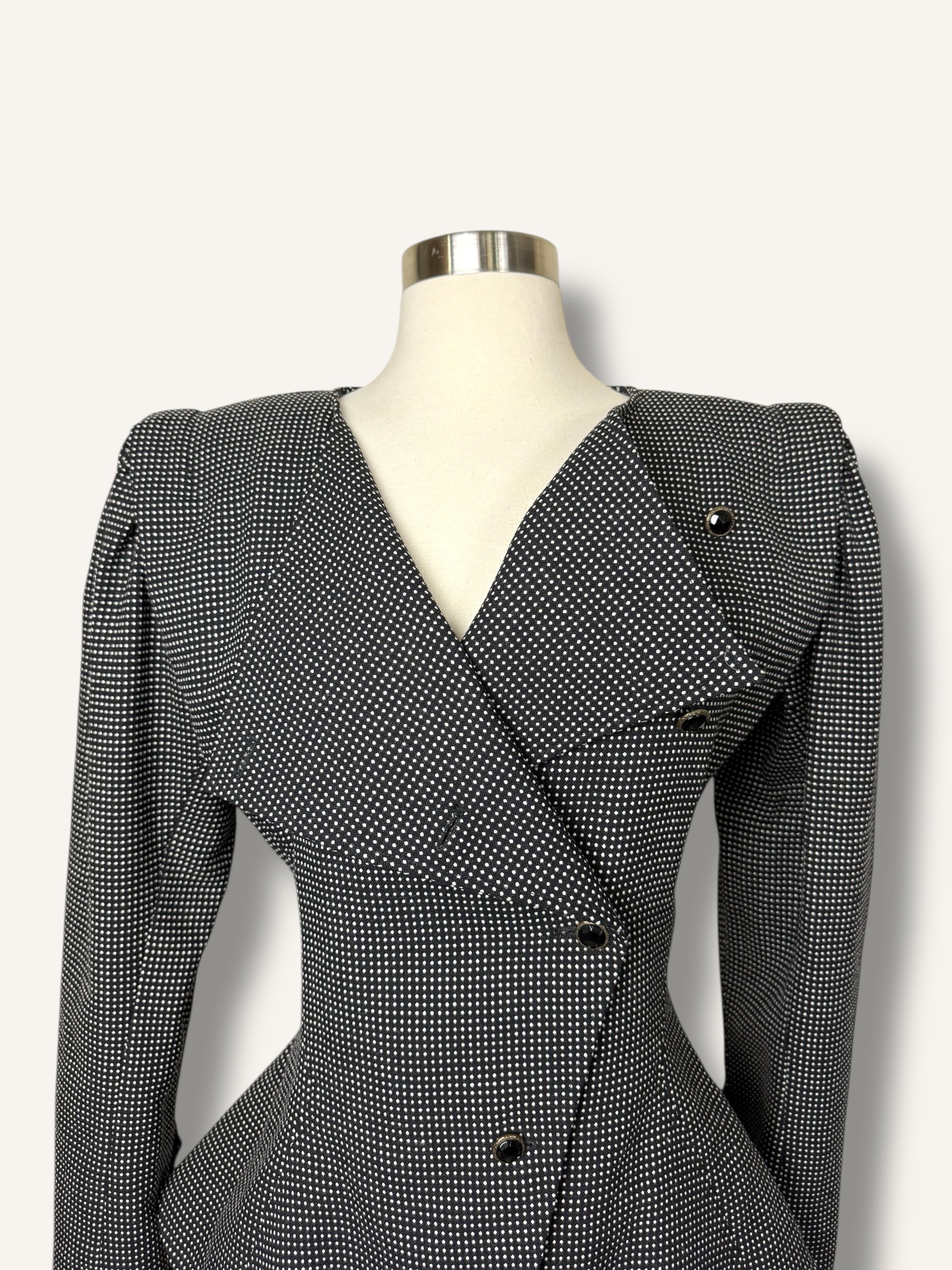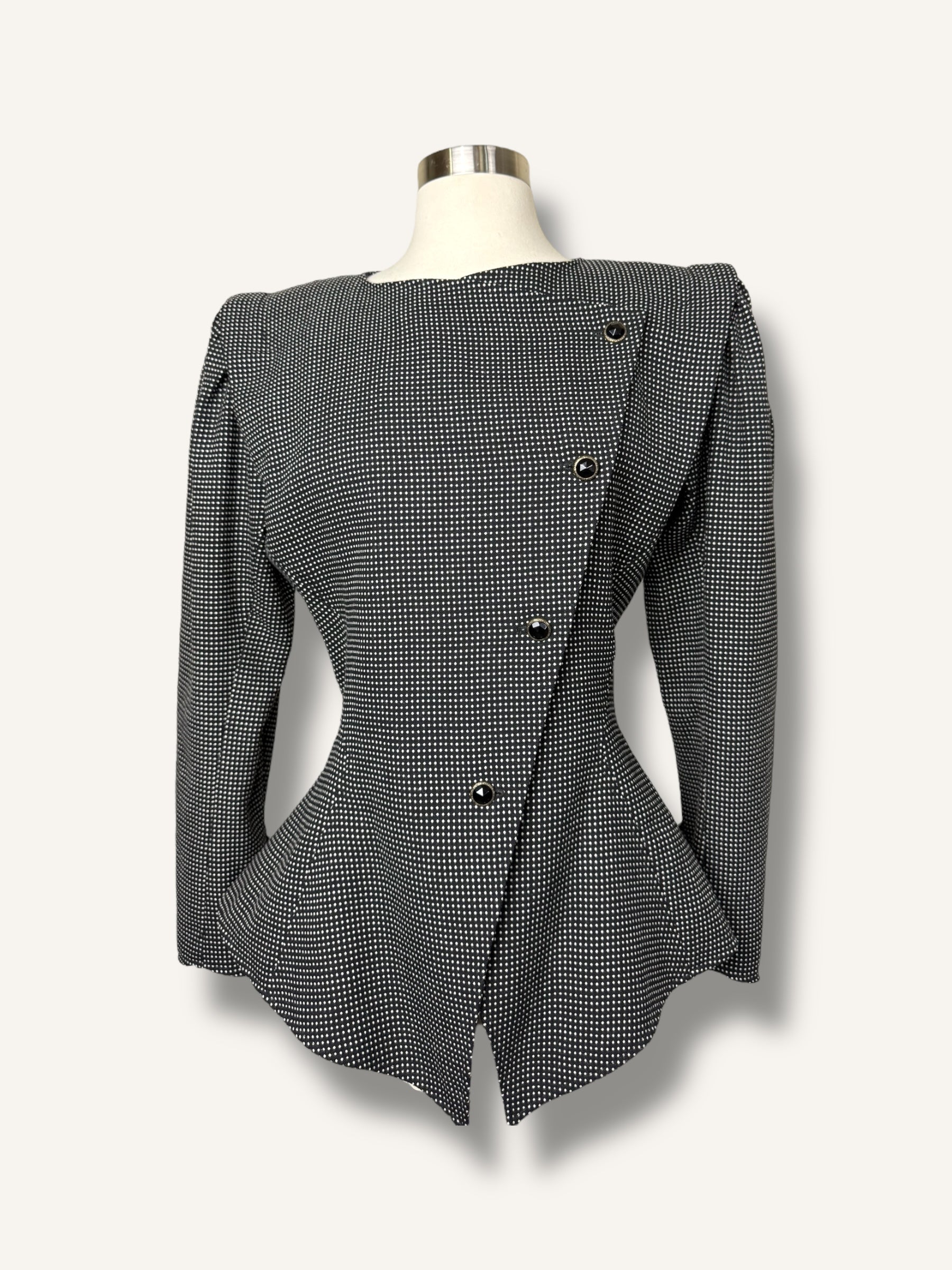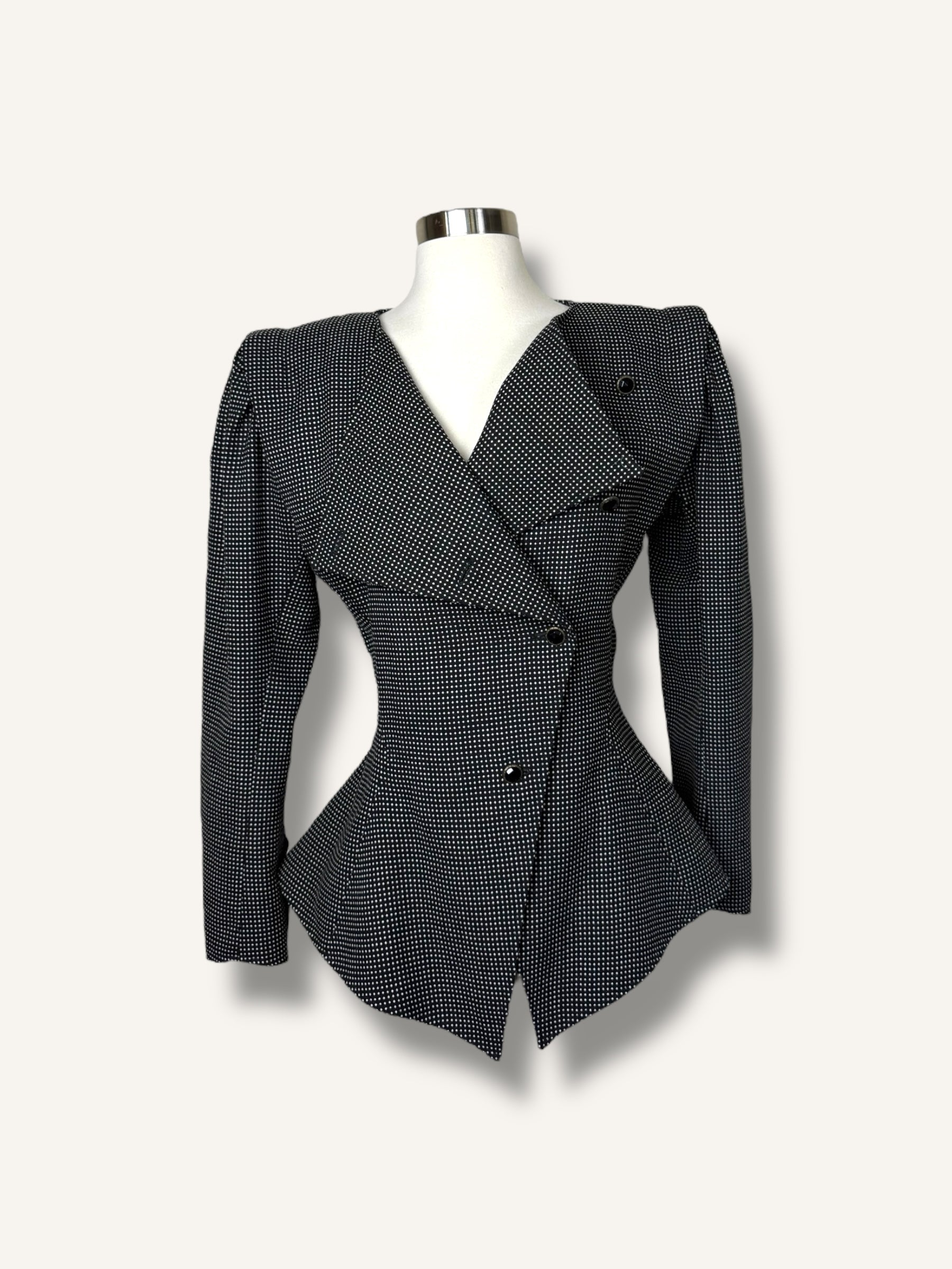 Iconic 1980s Ungaro structure, sharply tailored with an exaggerated hourglass shape, sculpted waist, and bold asymmetric button closure. Done in a black-and-white micro-check with glossy enamel buttons. A true collectible piece of French couture heritage that feels just as striking now as it did then.