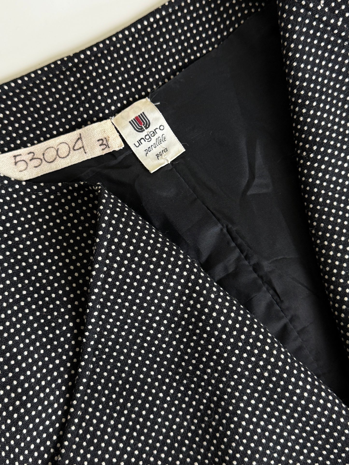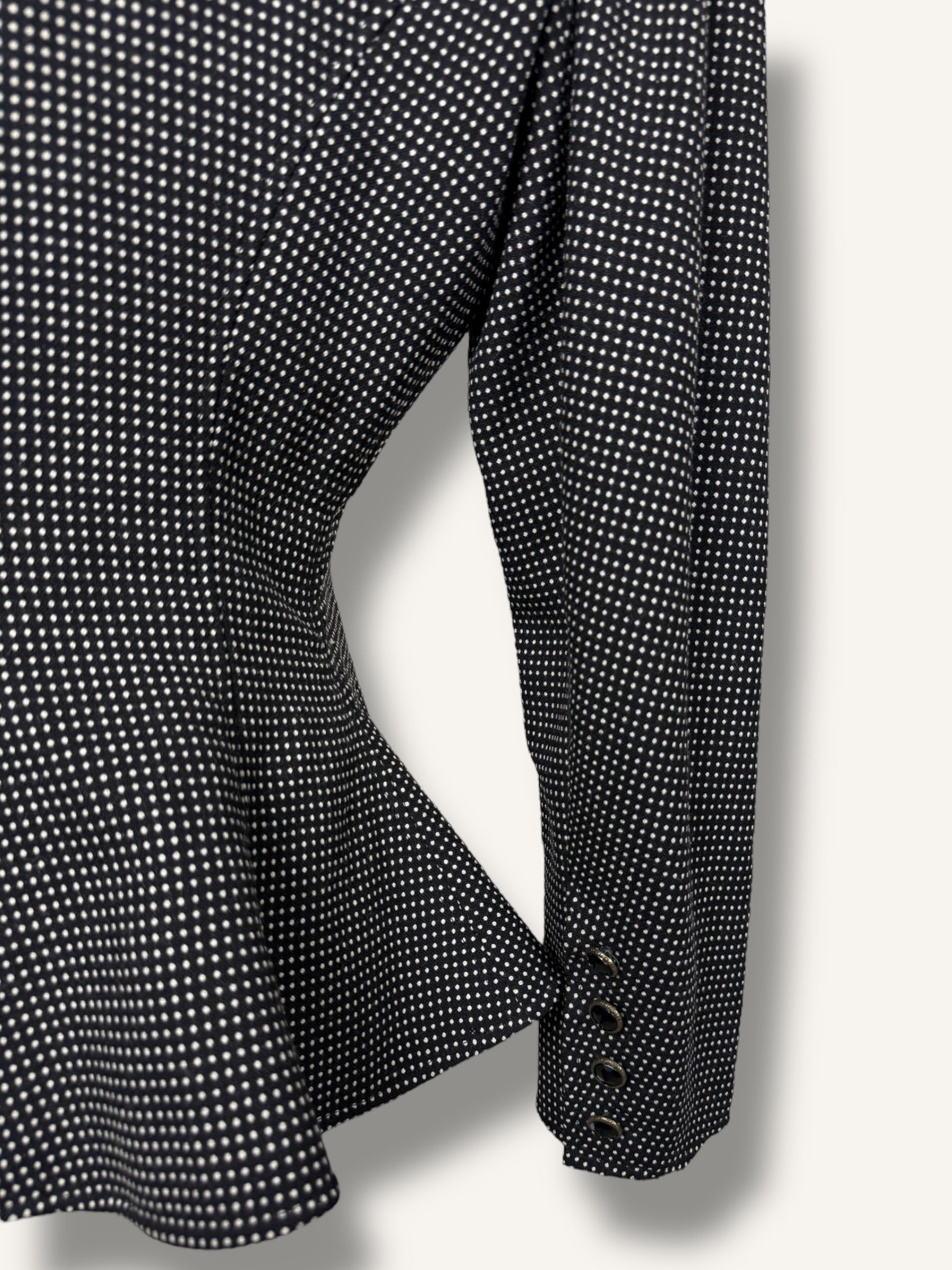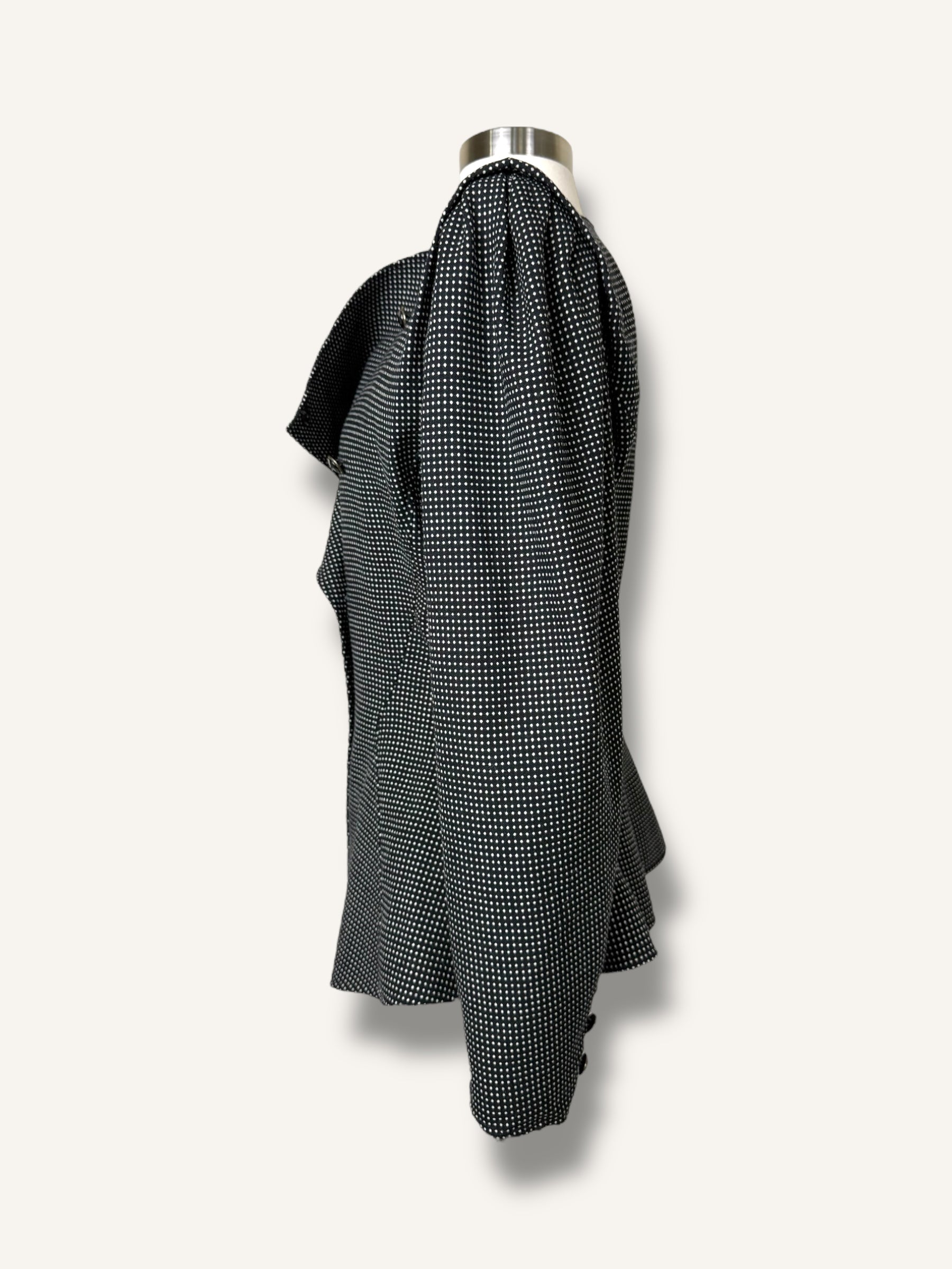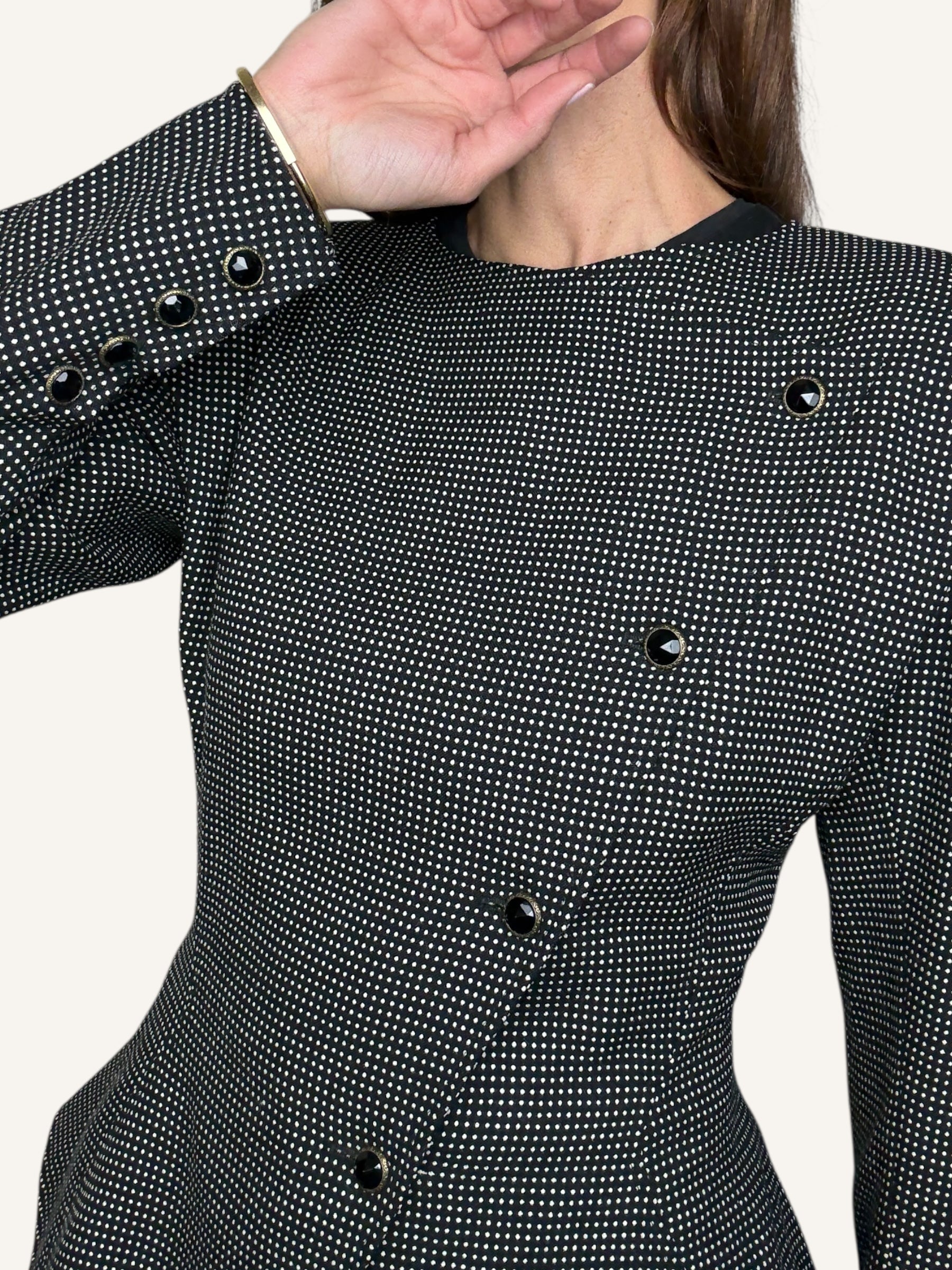 Iconic 1980s Ungaro structure, sharply tailored with an exaggerated hourglass shape, sculpted waist, and bold asymmetric button closure. Done in a black-and-white micro-check with glossy enamel buttons. A true collectible piece of French couture heritage that feels just as striking now as it did then.
