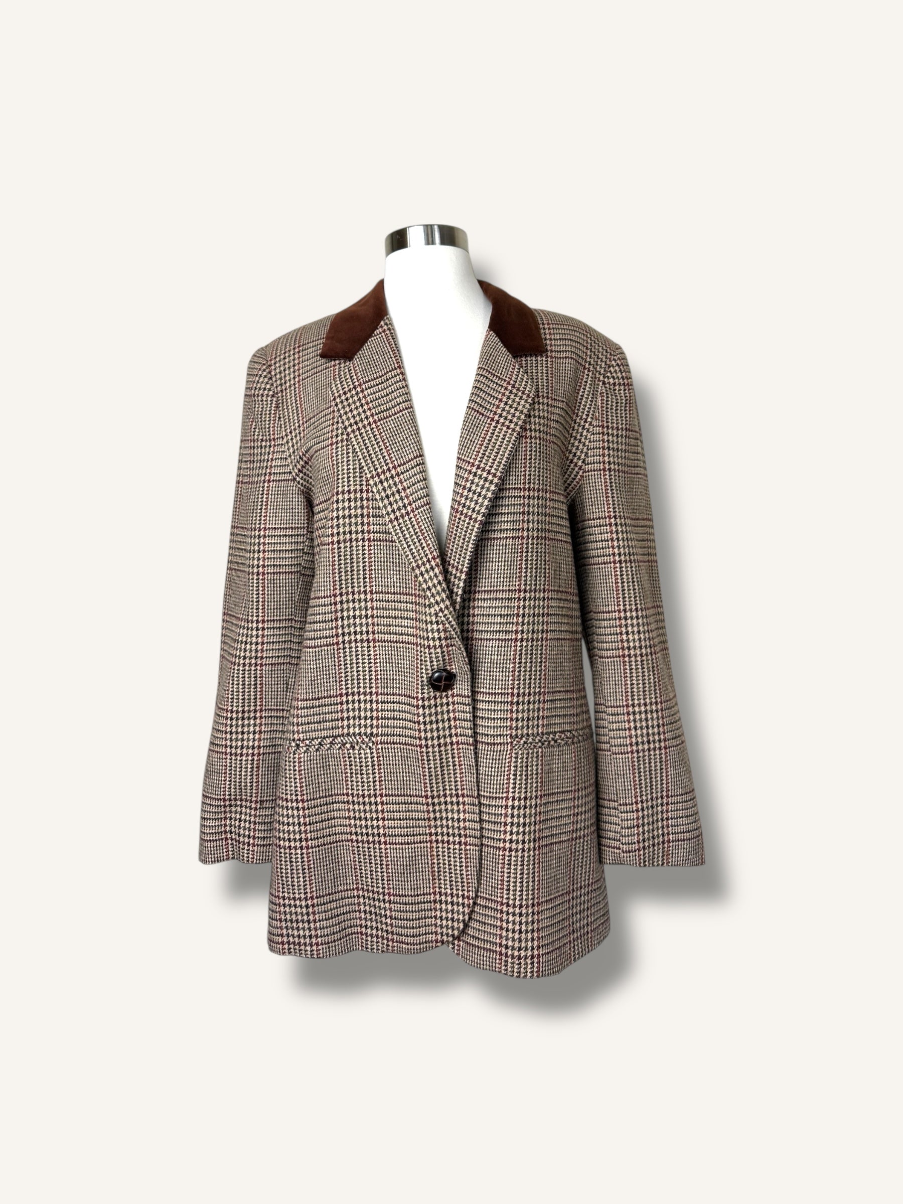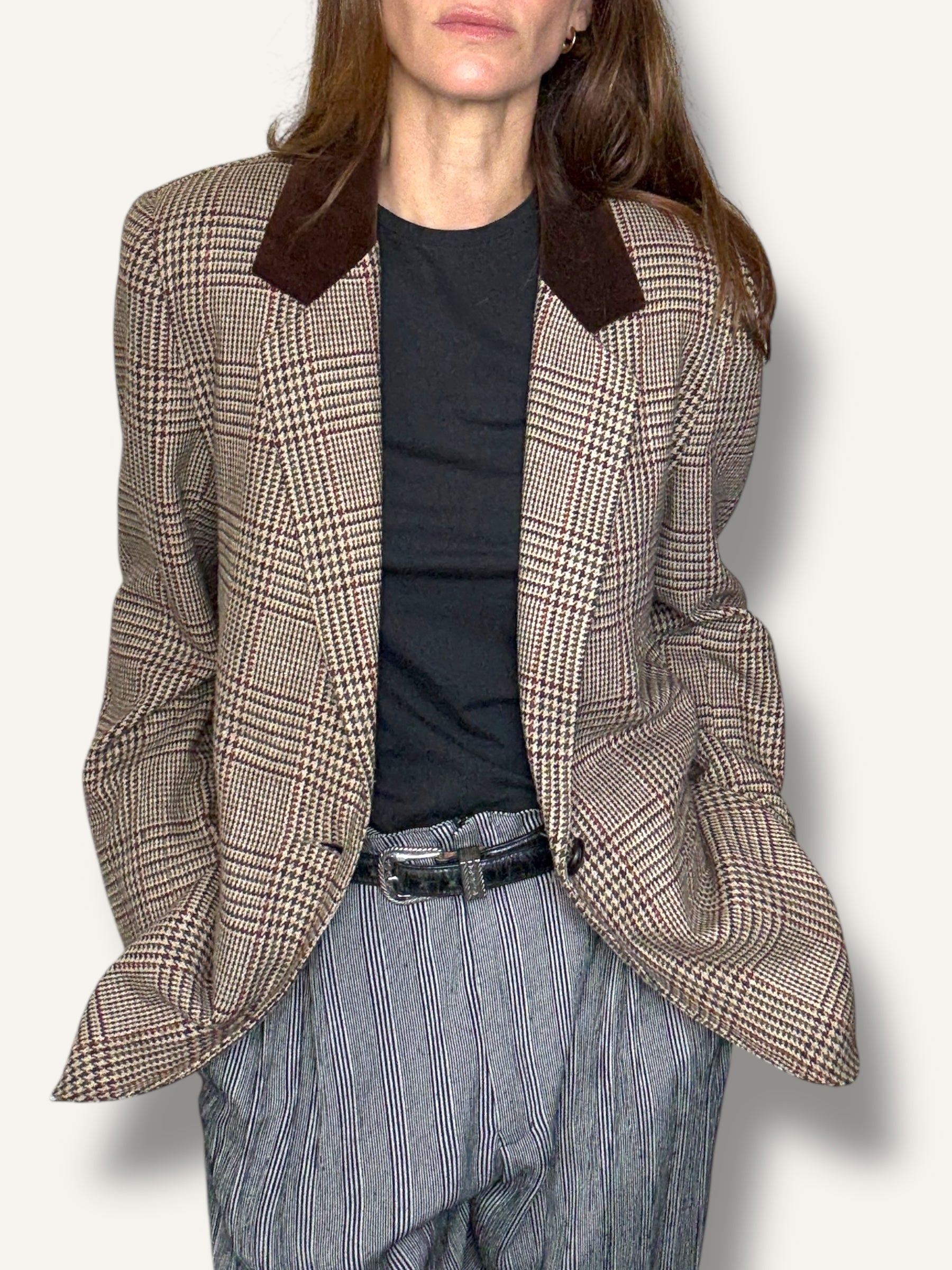 A timeless equestrian-inspired blazer featuring a rich Prince of Wales check and a chocolate velvet collar. Structured yet relaxed, with a single-button closure and that effortlessly polished, countryside-meets-city feel.