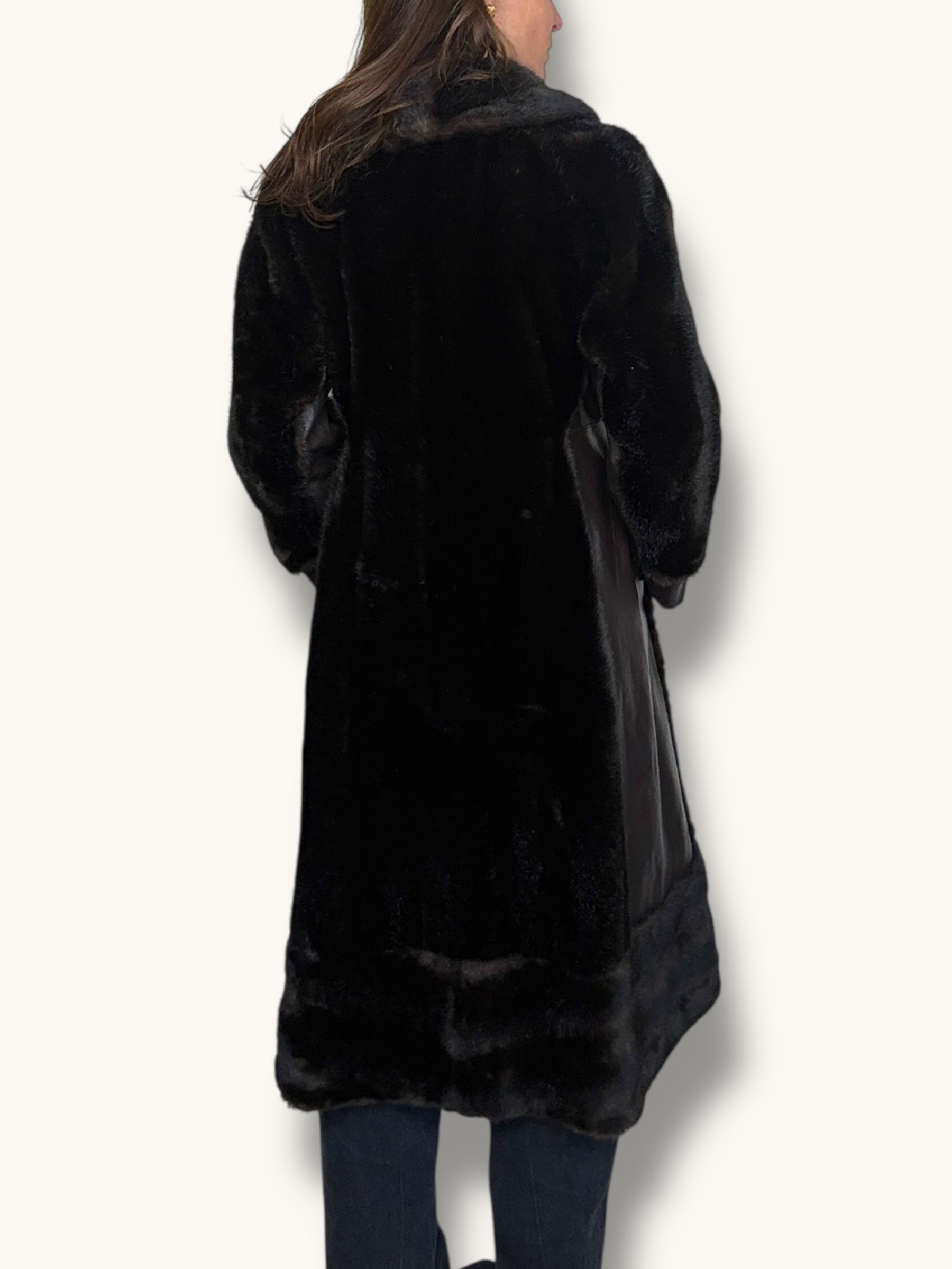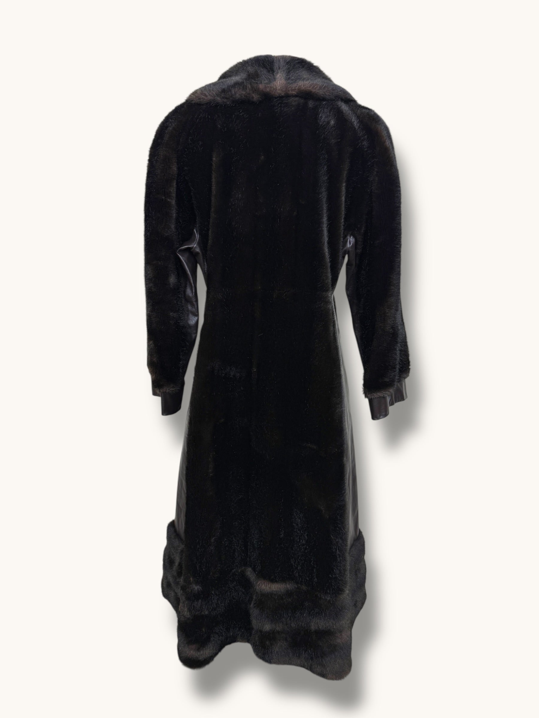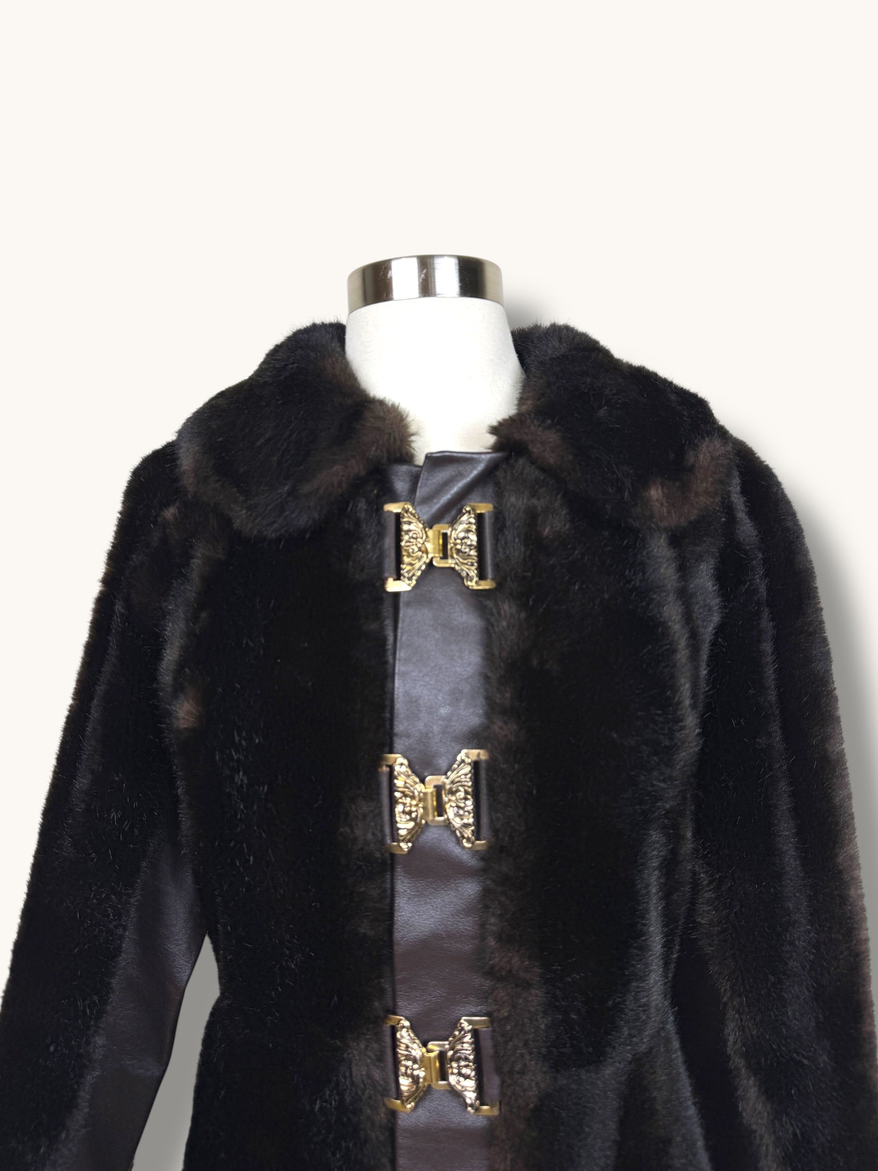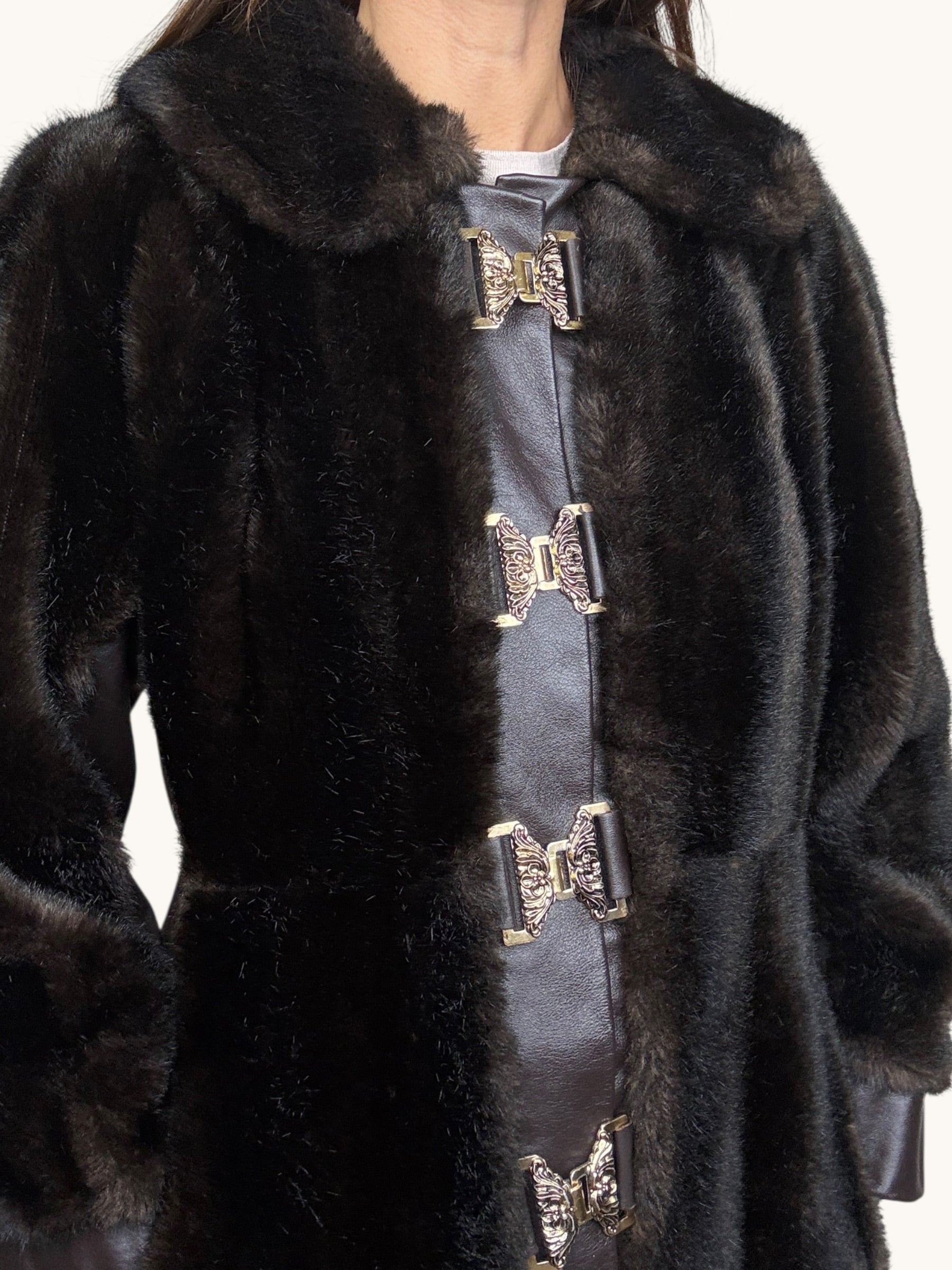 A dramatic vintage 1960s dark chocolate brown coat crafted in faux fur with rich leather panel detailing for a striking textural contrast. Designed in a long, elegant silhouette, it features a structured leather placket down the front adorned with ornate gold statement clasps that add a regal, couture-inspired touch. The plush faux fur collar frames the neckline beautifully, while the leather-trimmed cuffs and subtle shaping through the waist create a flattering, feminine line. Voluminous yet refined, this one-of-a-kind coat brings timeless glamour to denim or eveningwear alike — the ultimate cold-weather statement piece.