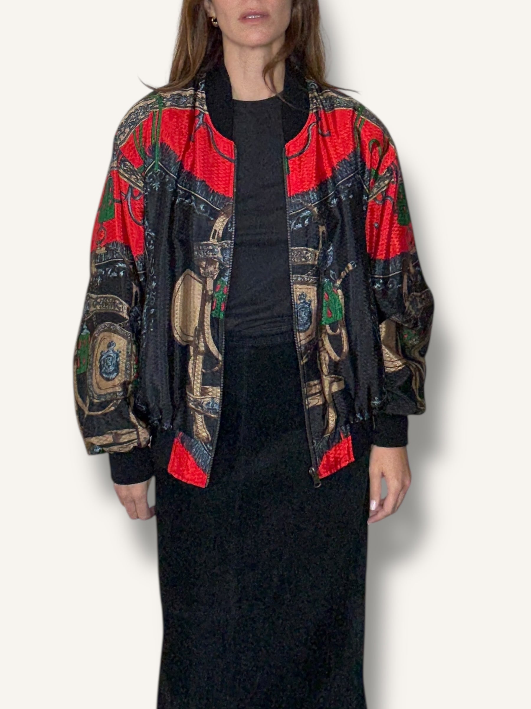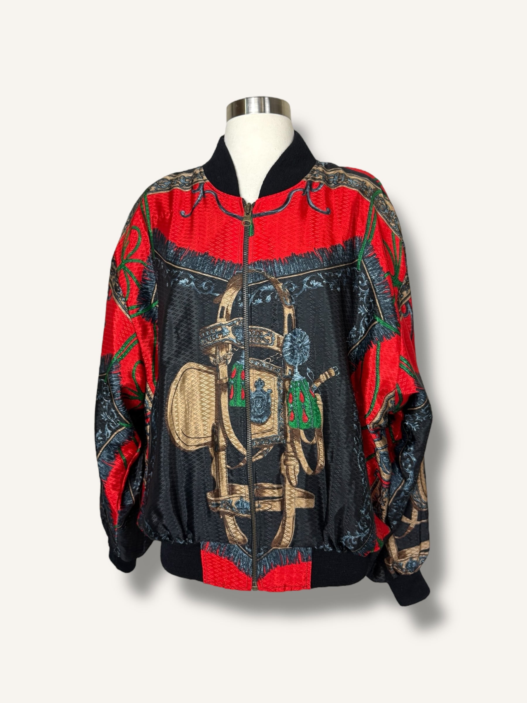 Vintage Lightweight satin bomber Jacket featuring a rich red and black equestrian print with gold detailing. Relaxed fit with ribbed trim and zip closure, bold yet wearable, with that effortless vintage edge.