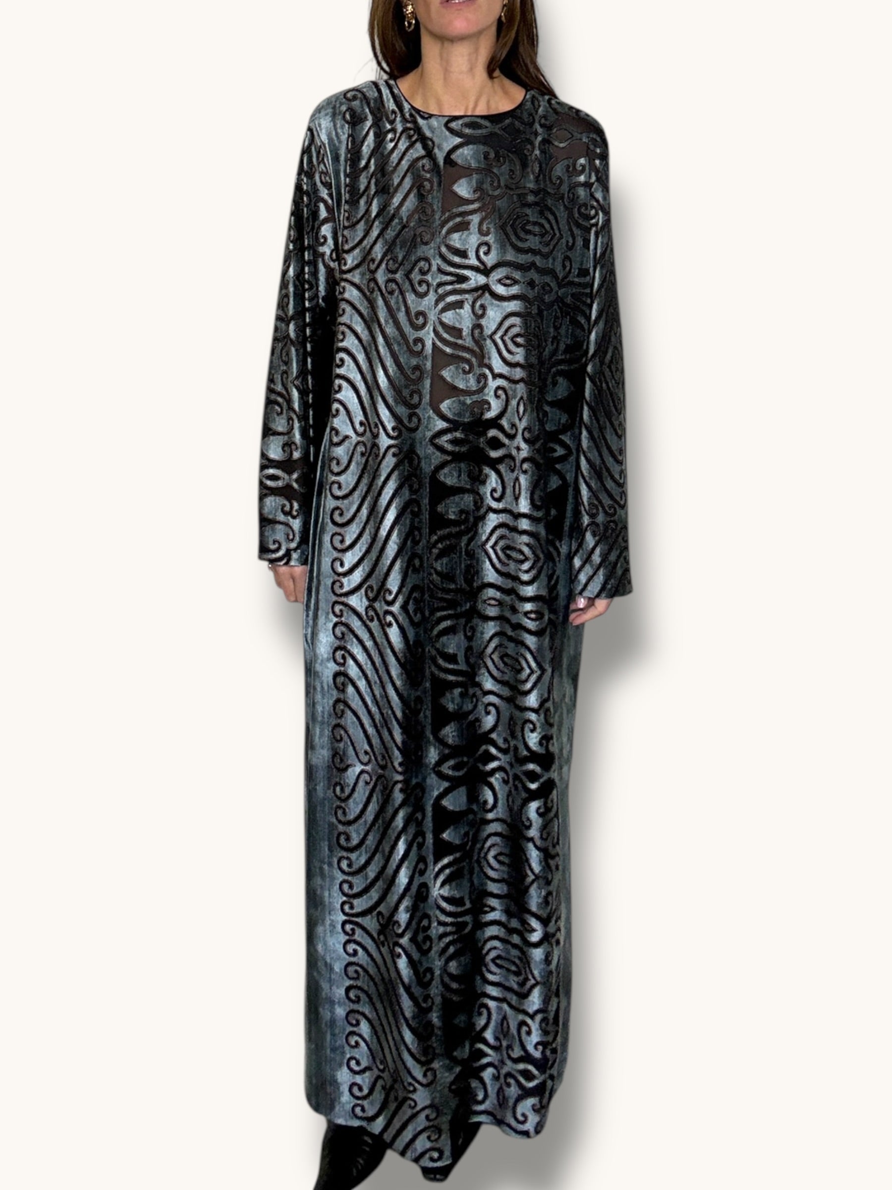 A stunning vintage Ruth Norman long dress crafted in a lightweight, velvety burnout fabric with an intricate black pattern layered over a luminous blue-grey base. The fabric has a soft, almost velvet-like finish while remaining fluid and airy, giving it beautiful movement and an effortless drape. Designed in an elongated silhouette with long sleeves and a softly rounded neckline, it falls gracefully along the body without feeling heavy. The back features three elegant frog closures at the neckline, adding a subtle, refined detail. Ethereal yet graphic, this piece feels dramatic without the weight — perfect styled with heels for evening or layered with boots for a modern, understated look.
