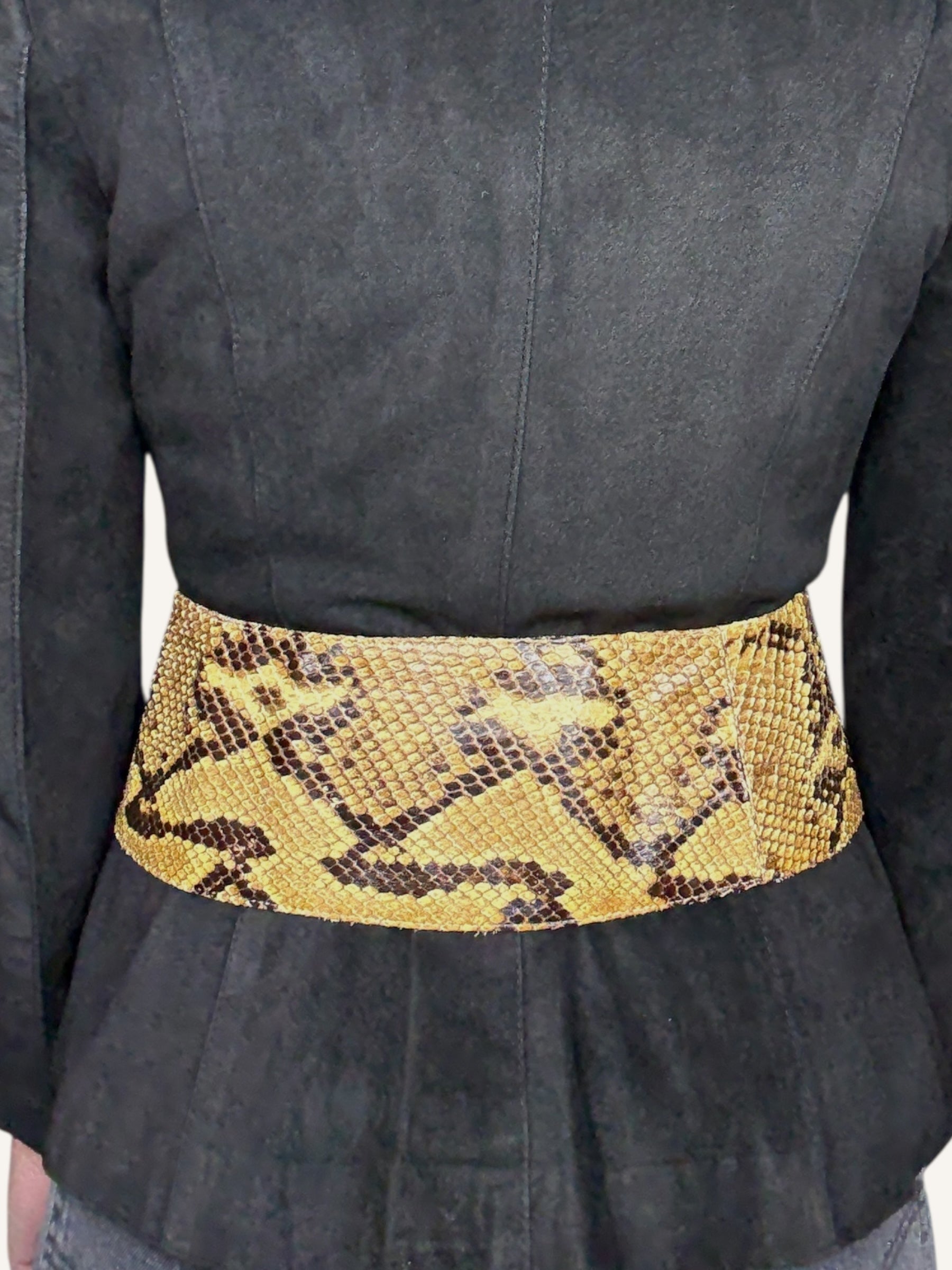 A rare, sculptural vintage belt crafted from genuine python for an unmistakably bold silhouette. Designed by Waldorf Creations, this piece wraps elegantly around the waist with its wide snakeskin band and dramatic pointed front closure. Three glossy black buttons accent the asymmetrical tab, adding dimension and a couture touch. Fully lined in soft leather for comfort, it’s a striking accessory that instantly elevates dresses, blazers, or evening looks.
