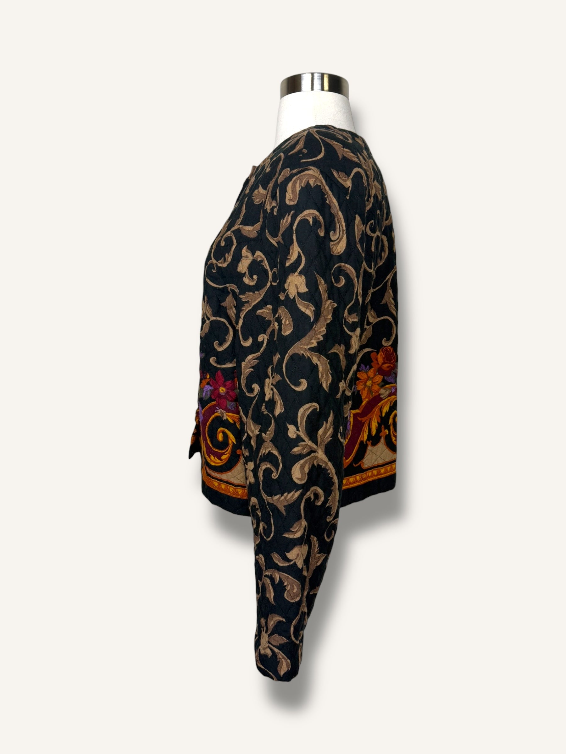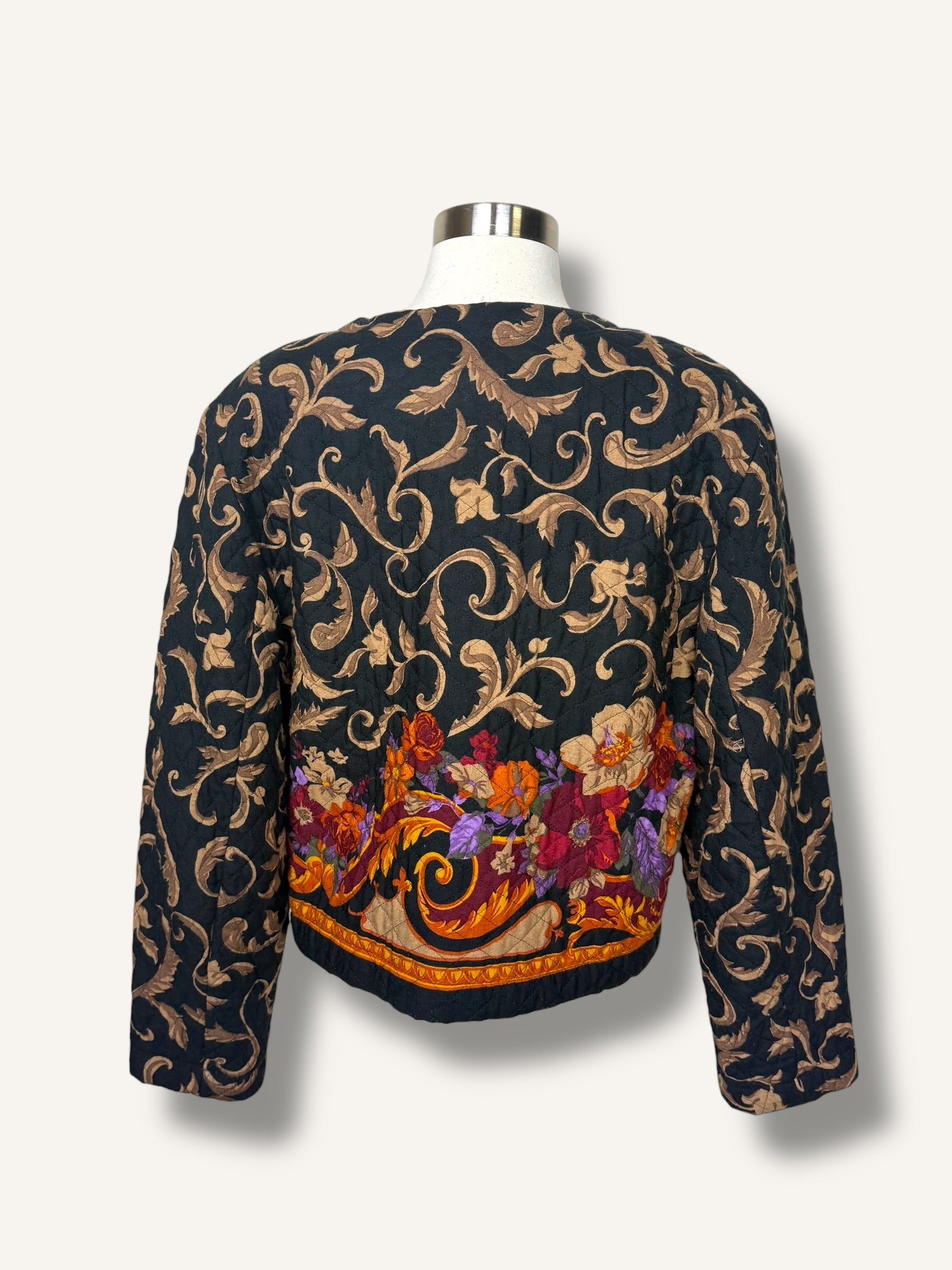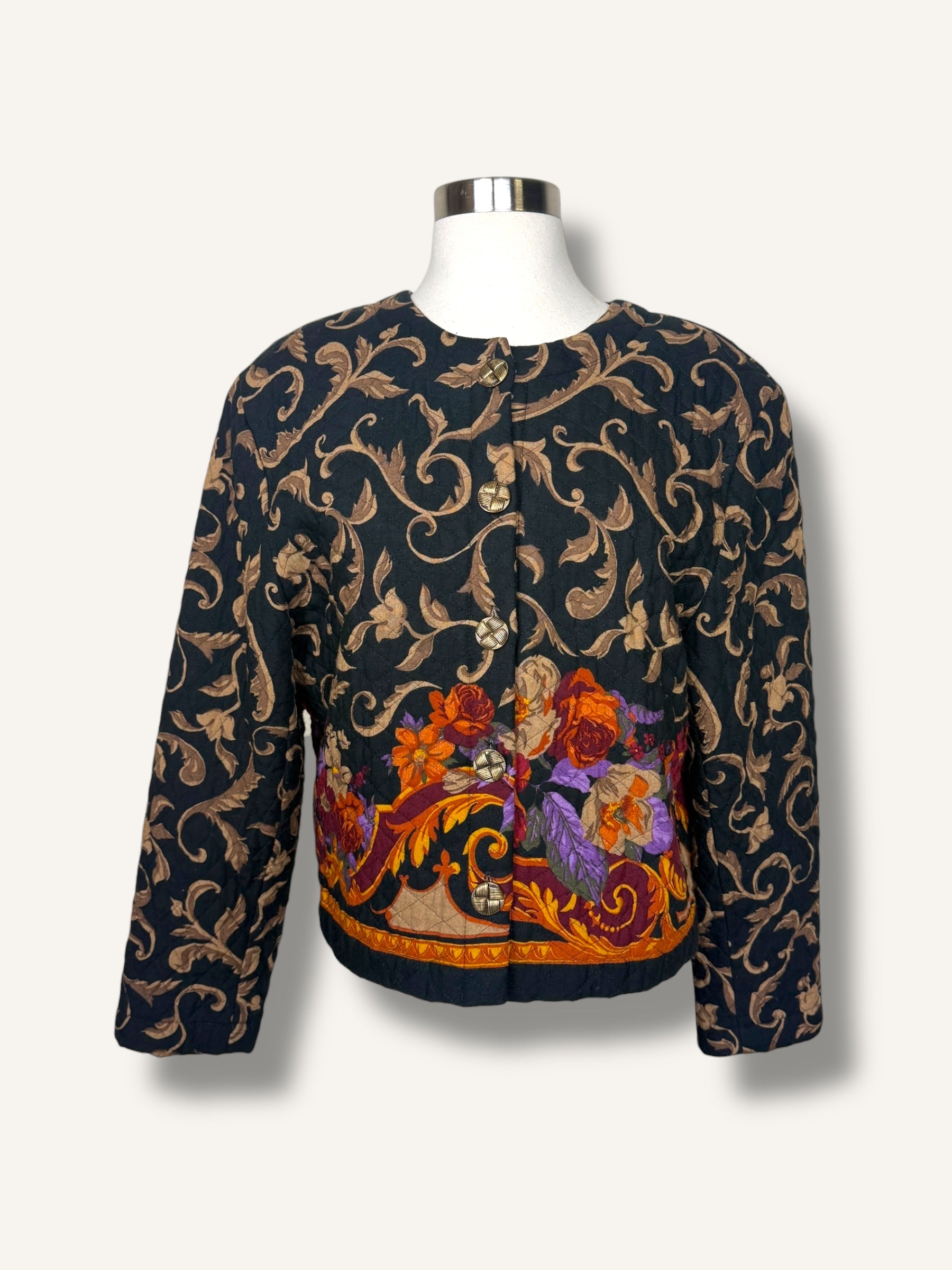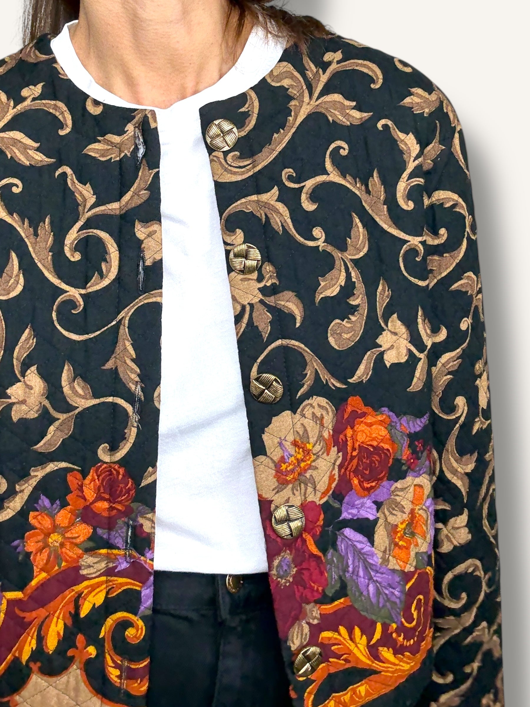 A standout vintage quilted jacket made in USA with an elegant, storybook feel: a rich dark base is covered in swirling tan baroque vines, then finished with a bold tapestry-like floral border bursting in oranges, burgundy, and violet across the hem. The silhouette is cropped and softly structured with a clean round neckline and oversized gold-tone textured buttons down the front—equal parts polished and playful. Throw it over denim and a tee to make it look intentional, or wear it with a sleek black dress for that “found in a Paris archive” energy.