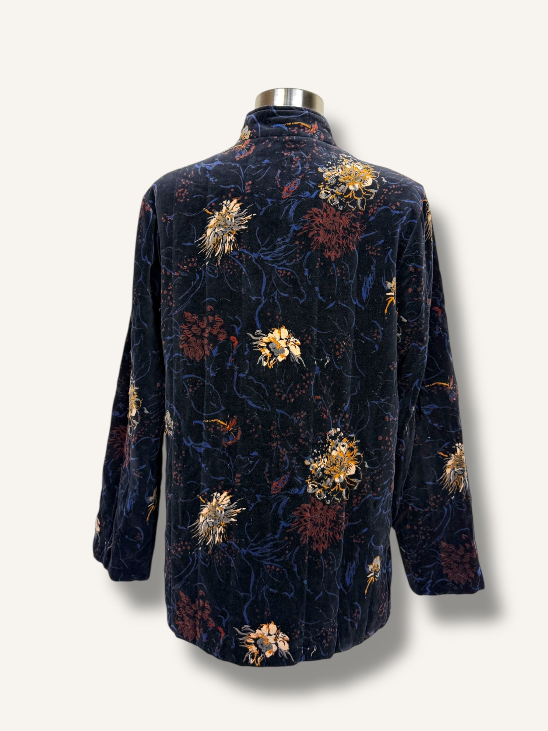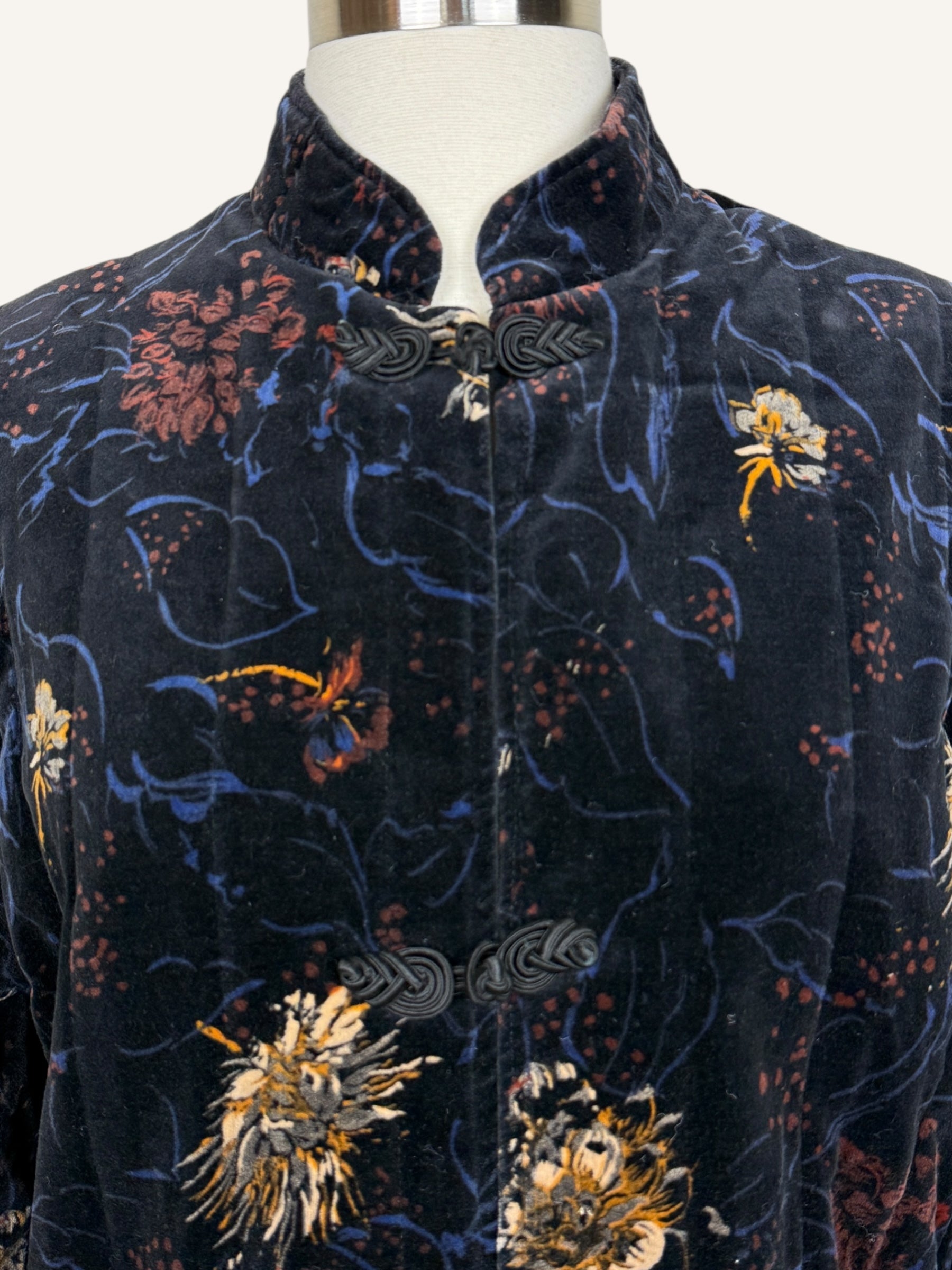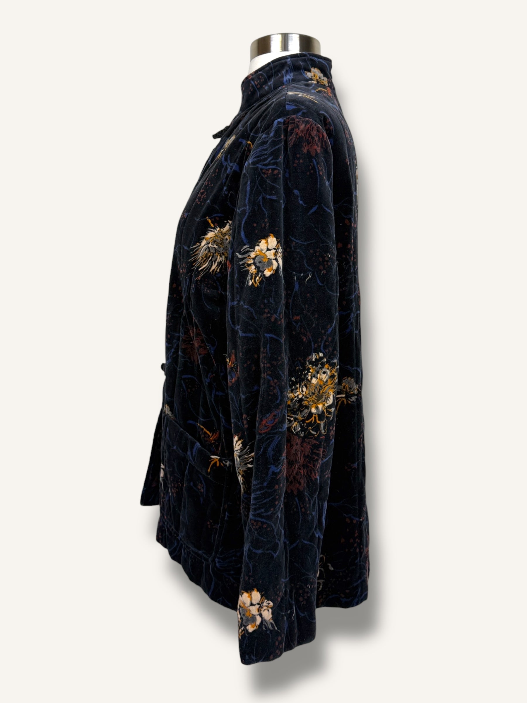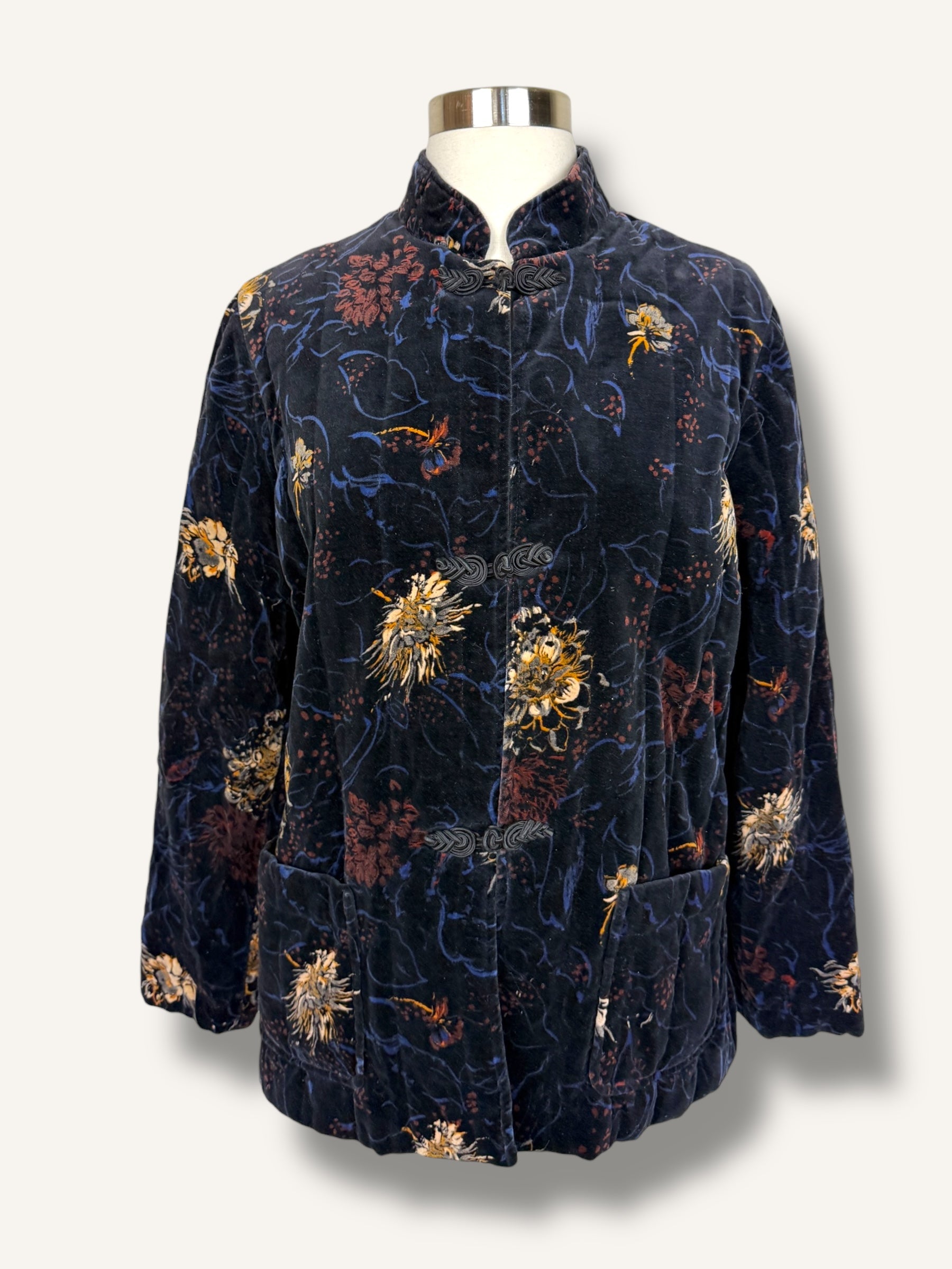 Vintage quilted velvet jacket with an elegant, Chinese-inspired silhouette and a moody floral print that feels like wearable art. Crafted in plush deep navy velvet with tonal quilting, it features a stand collar and traditional frog-style front closures for that iconic, refined finish. Complete with roomy front patch pockets and an easy, relaxed fit—perfect over a slip dress at night or dressed down with denim for day.