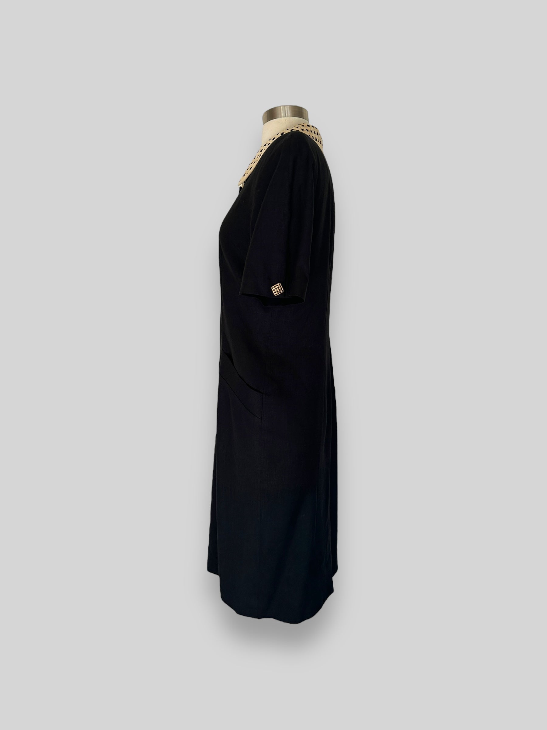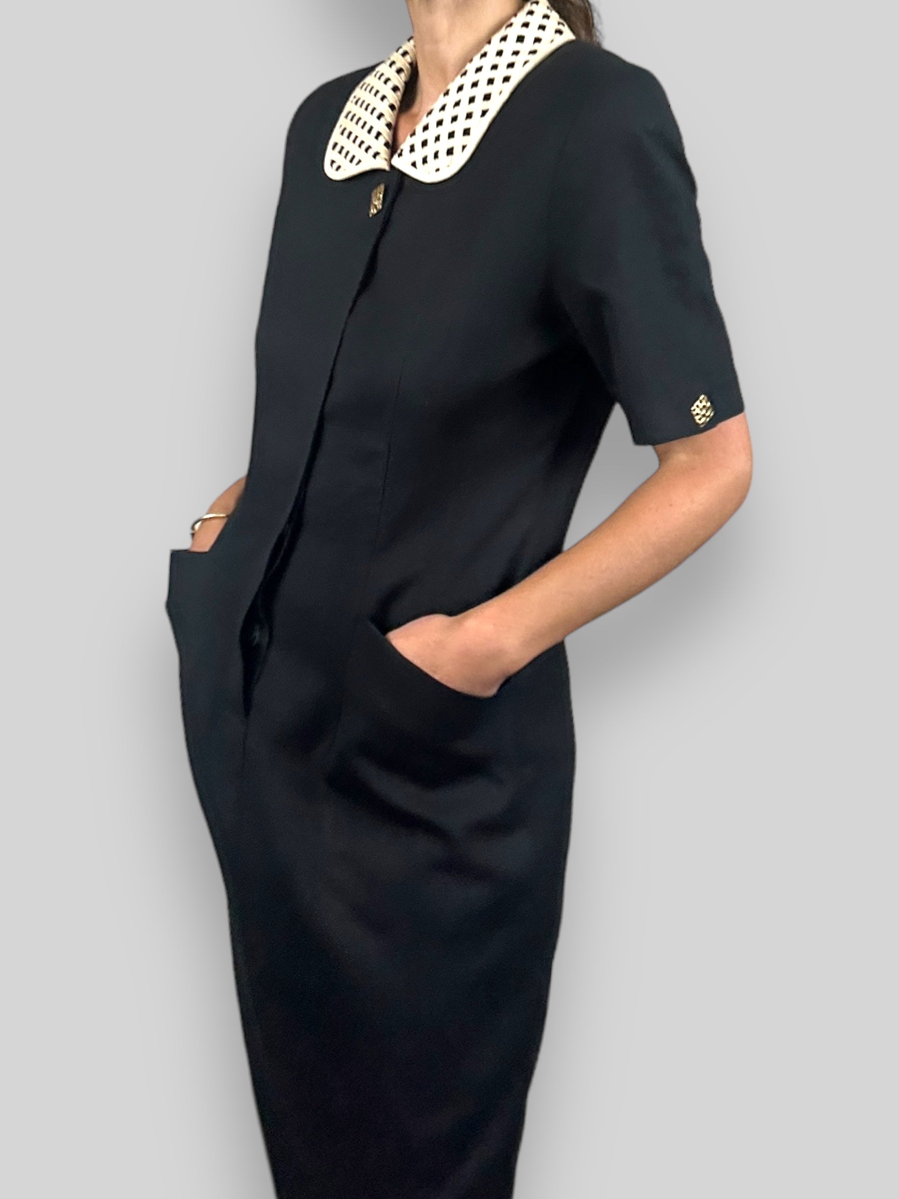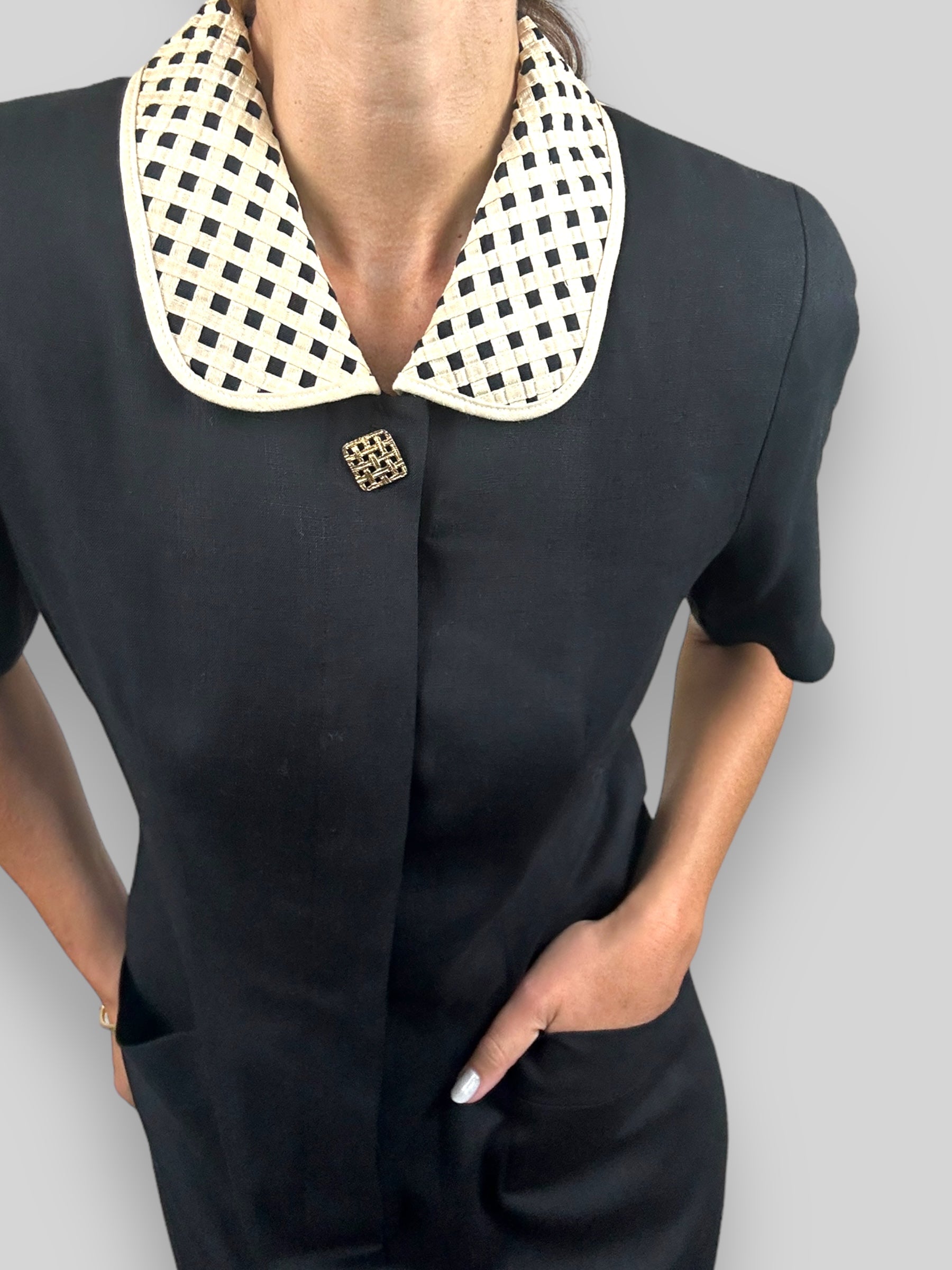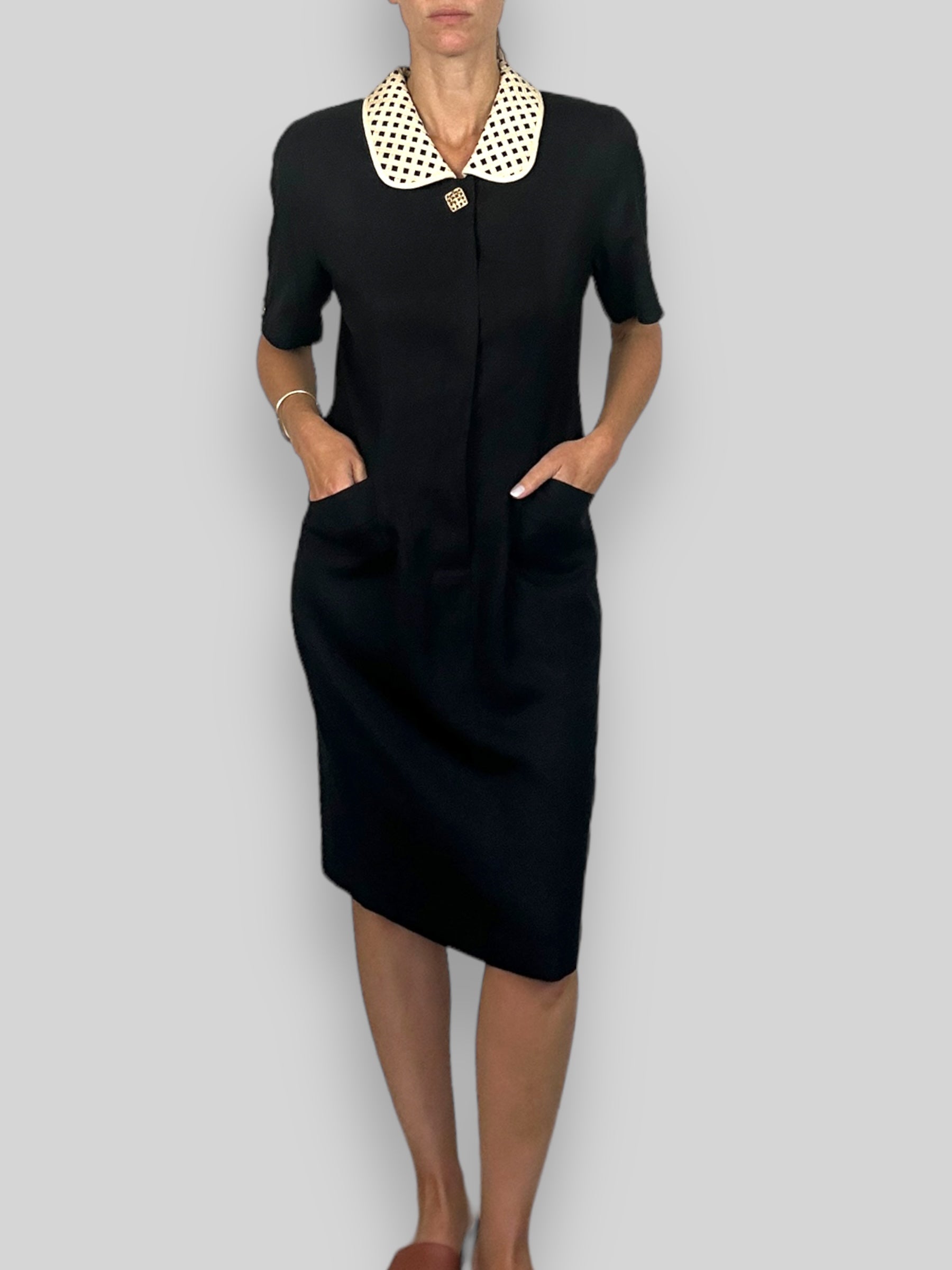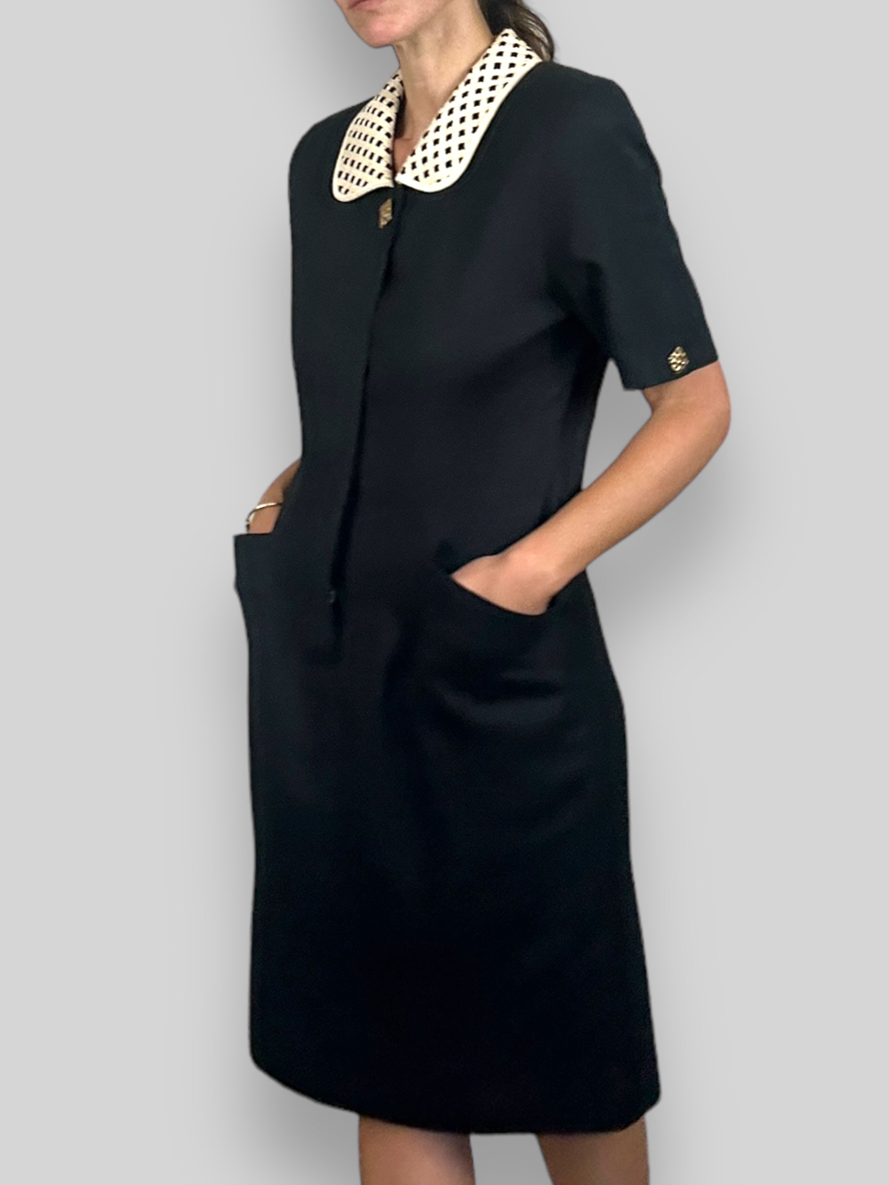 This elegant vintage dress 1960s showcases classic sophistication with its sleek black fabric and mid-length cut. The dress features short sleeves and a fitted waist, creating a flattering silhouette. A standout detail is the off white perforated collar, adding a charming contrast and a touch of retro style. The collar is secured with a decorative square button at the neckline, as well as on the sleeves enhancing it's vintage appeal. The dress also includes discreet front pockets, blending functionality with timeless fashion. Perfect for both formal and semi-formal occasions, this dress is a beautiful example of vintage craftsmanship and style.