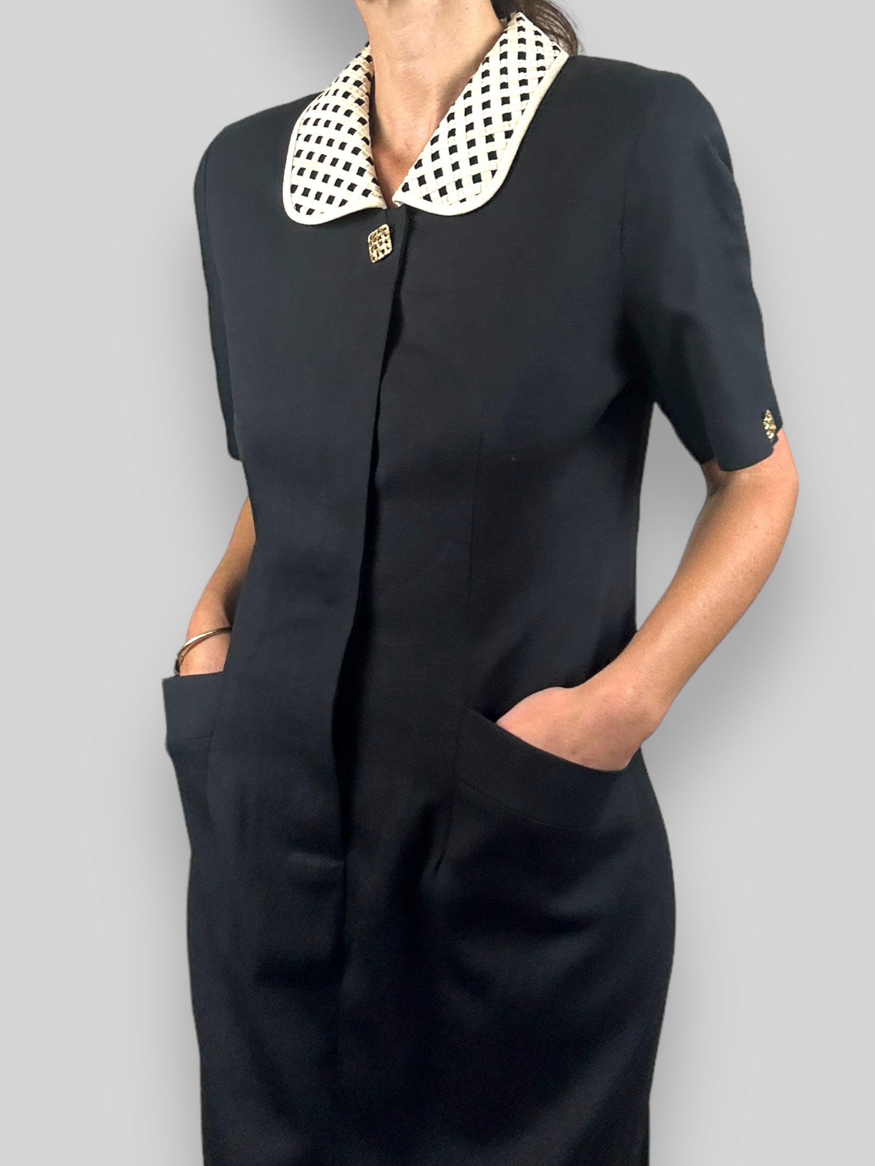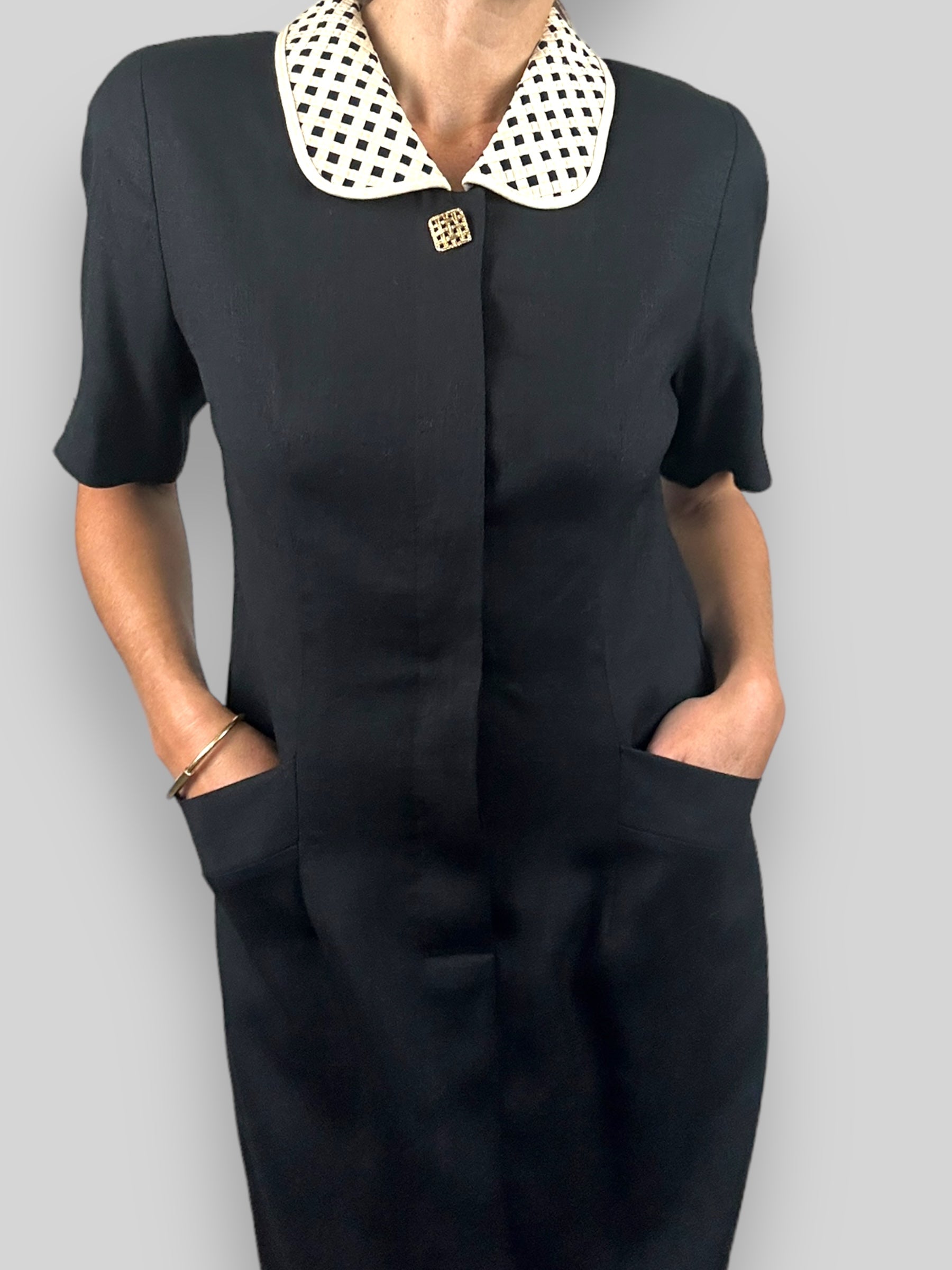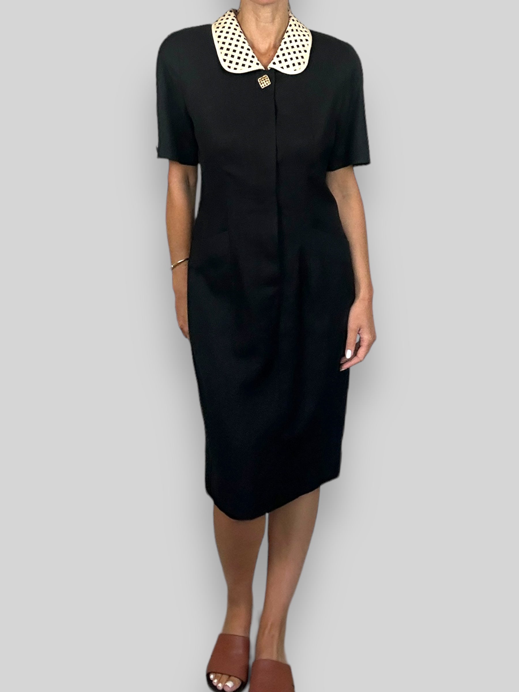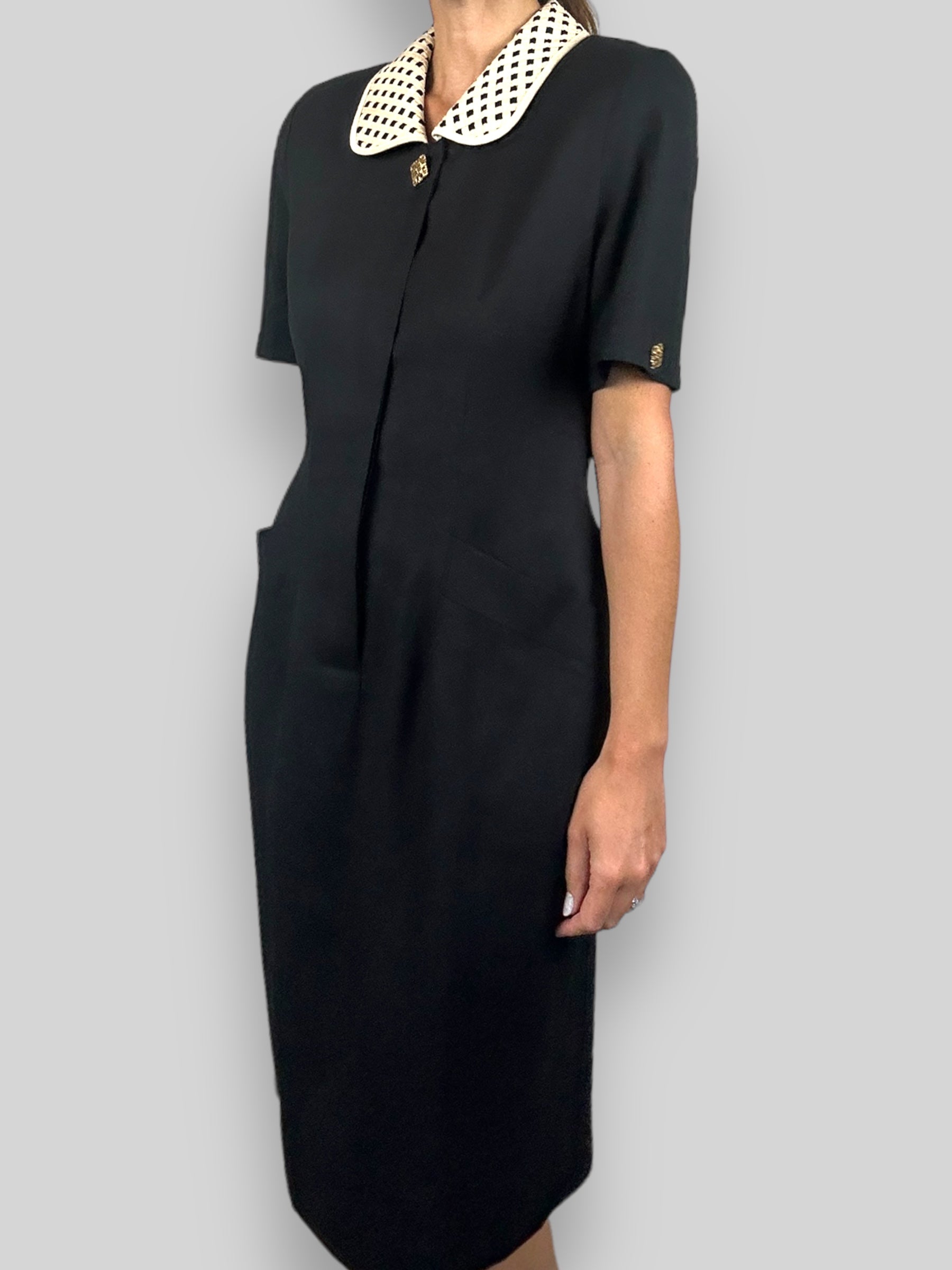 This elegant vintage dress 1960s showcases classic sophistication with its sleek black fabric and mid-length cut. The dress features short sleeves and a fitted waist, creating a flattering silhouette. A standout detail is the off white perforated collar, adding a charming contrast and a touch of retro style. The collar is secured with a decorative square button at the neckline, as well as on the sleeves enhancing it's vintage appeal. The dress also includes discreet front pockets, blending functionality with timeless fashion. Perfect for both formal and semi-formal occasions, this dress is a beautiful example of vintage craftsmanship and style.