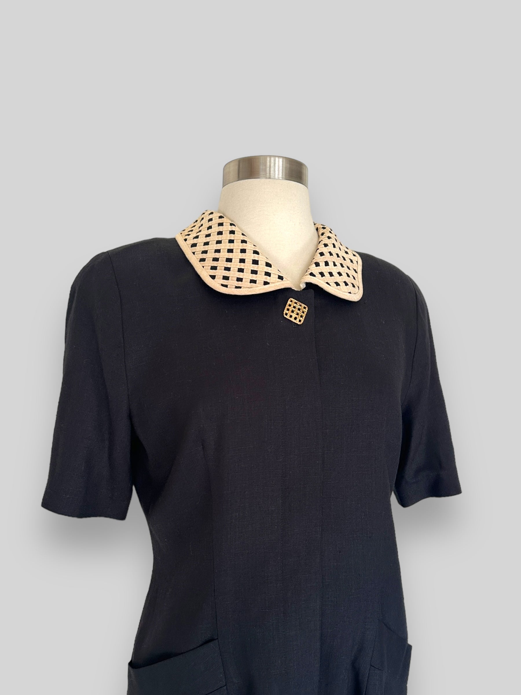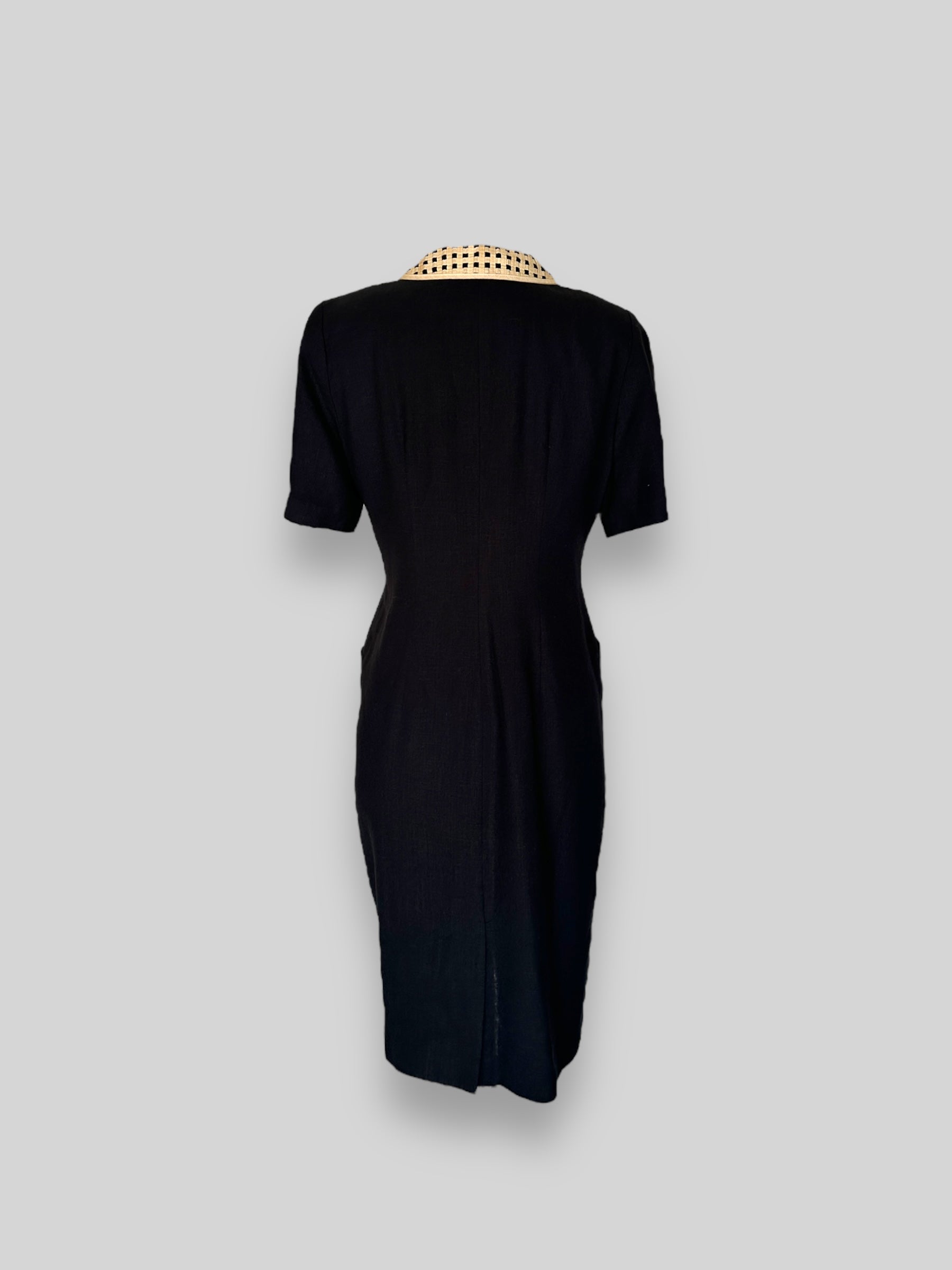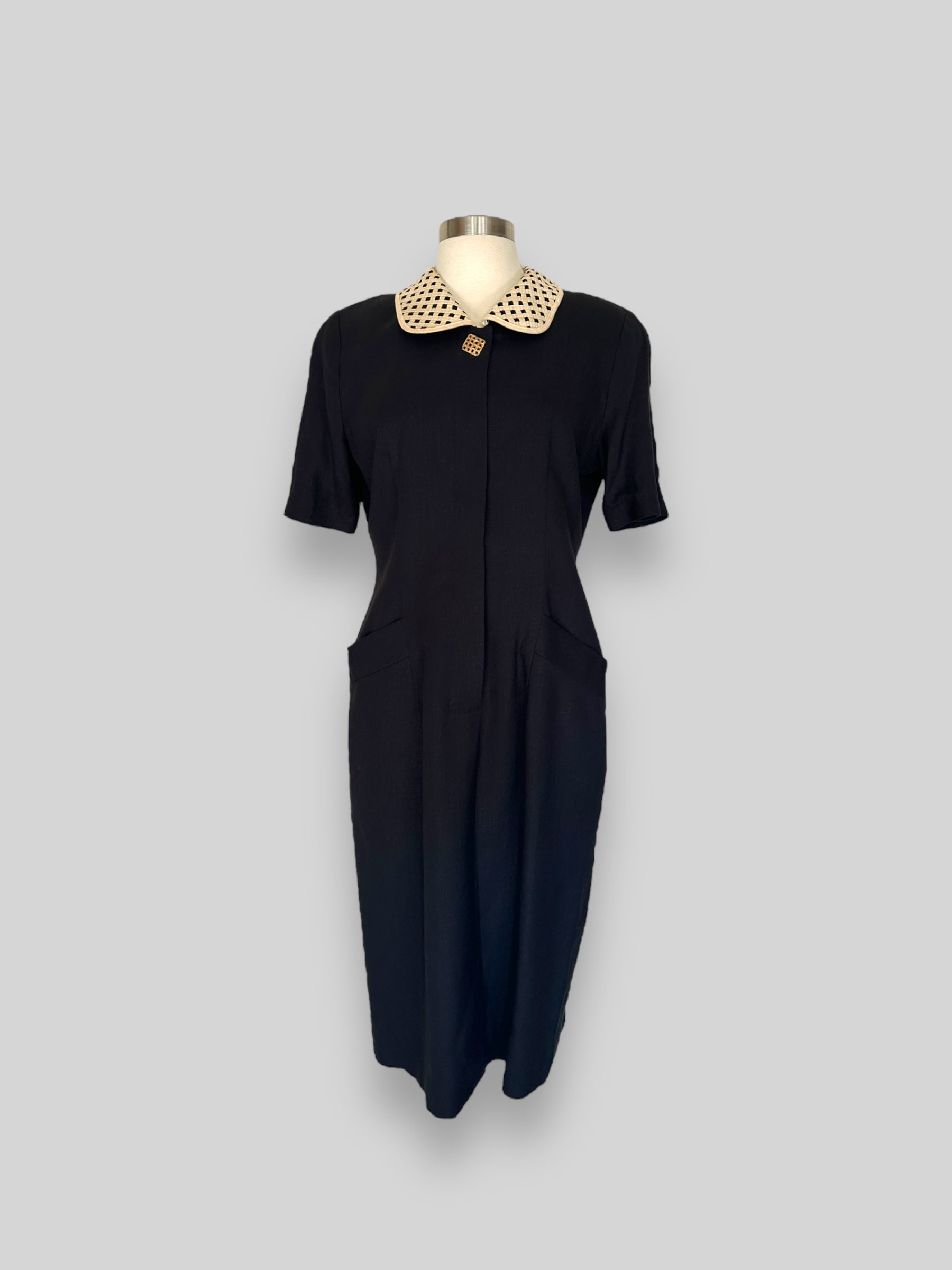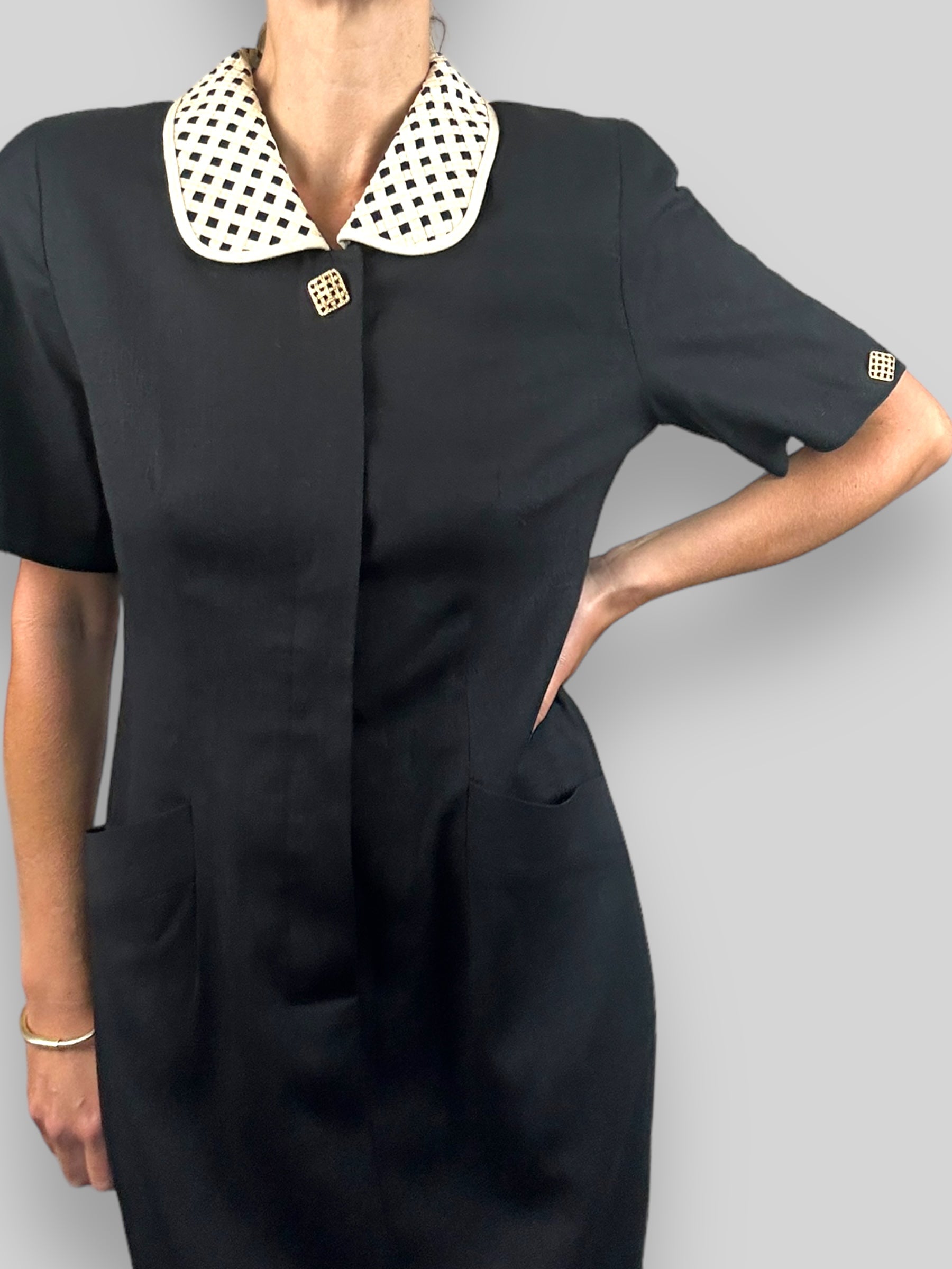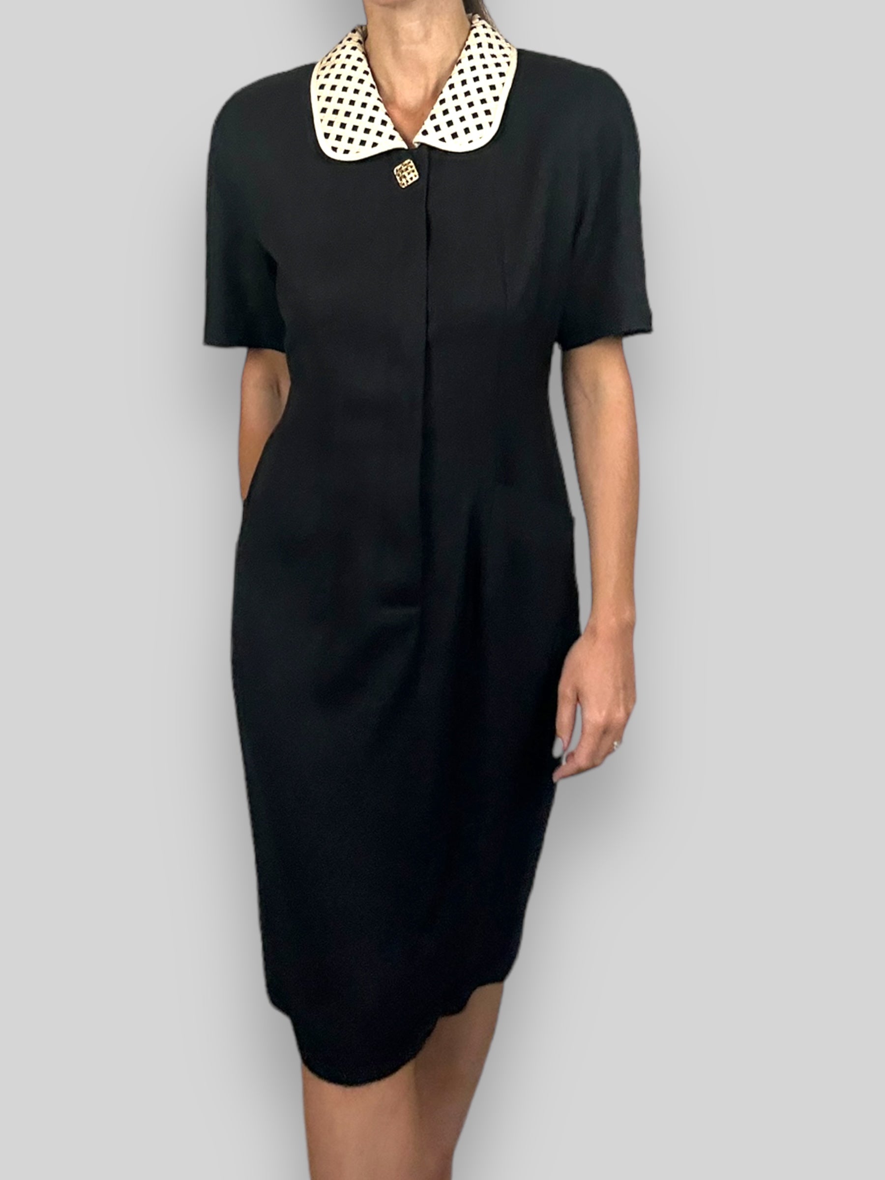 This elegant vintage dress 1960s showcases classic sophistication with its sleek black fabric and mid-length cut. The dress features short sleeves and a fitted waist, creating a flattering silhouette. A standout detail is the off white perforated collar, adding a charming contrast and a touch of retro style. The collar is secured with a decorative square button at the neckline, as well as on the sleeves enhancing it's vintage appeal. The dress also includes discreet front pockets, blending functionality with timeless fashion. Perfect for both formal and semi-formal occasions, this dress is a beautiful example of vintage craftsmanship and style.