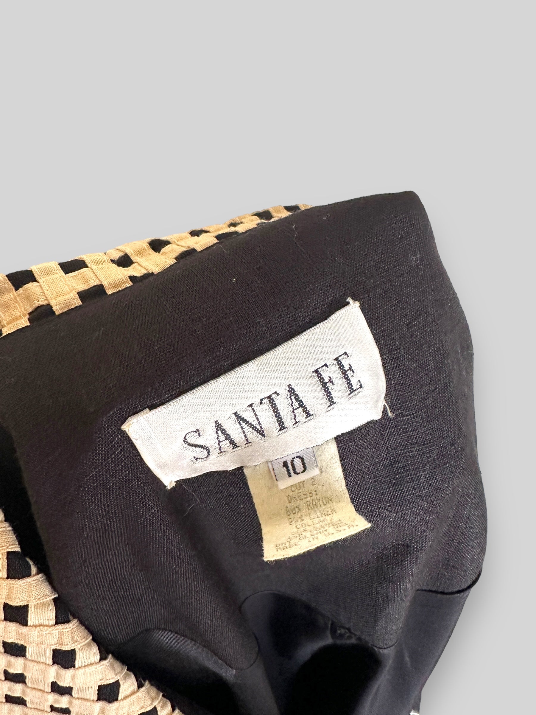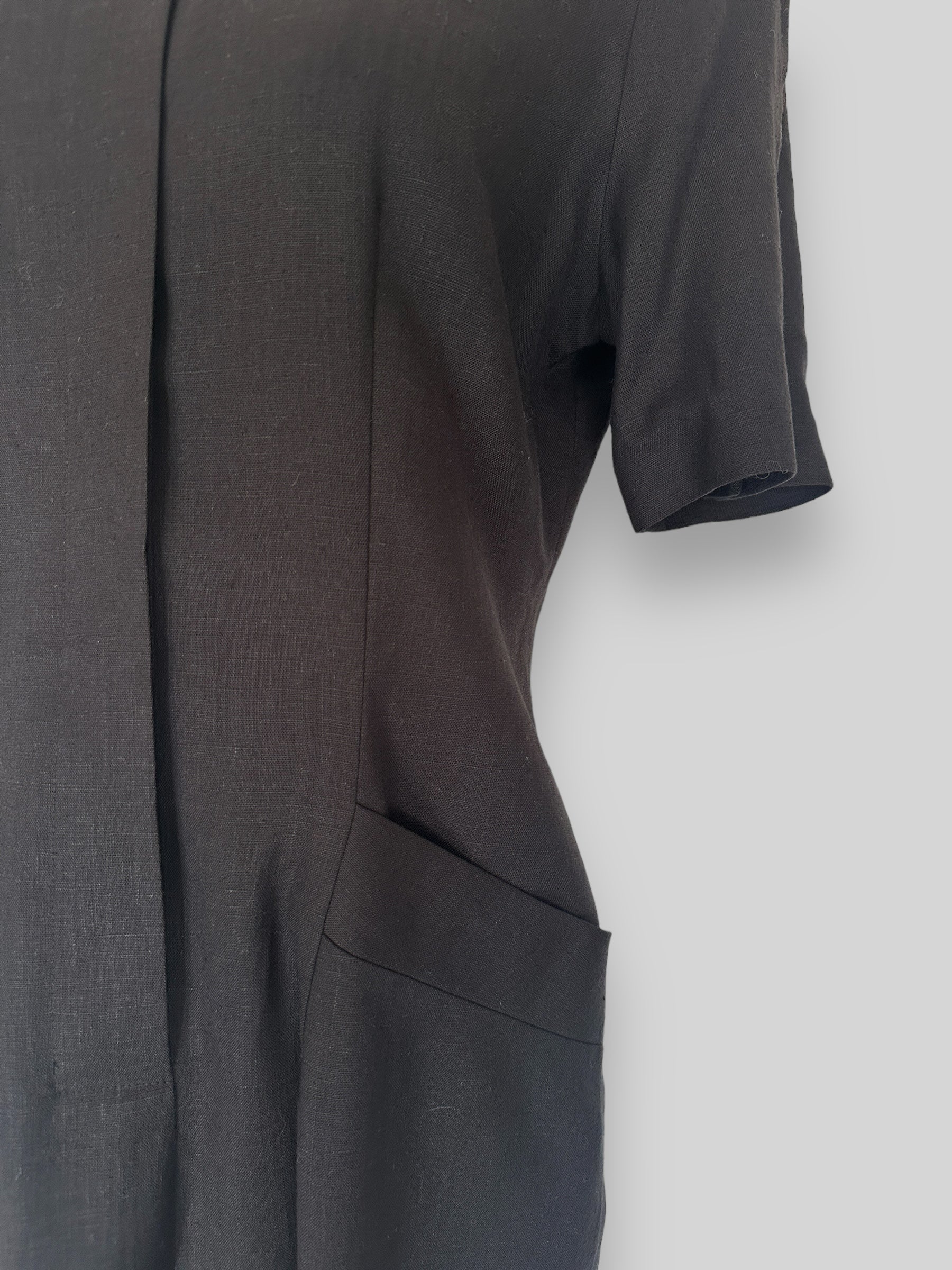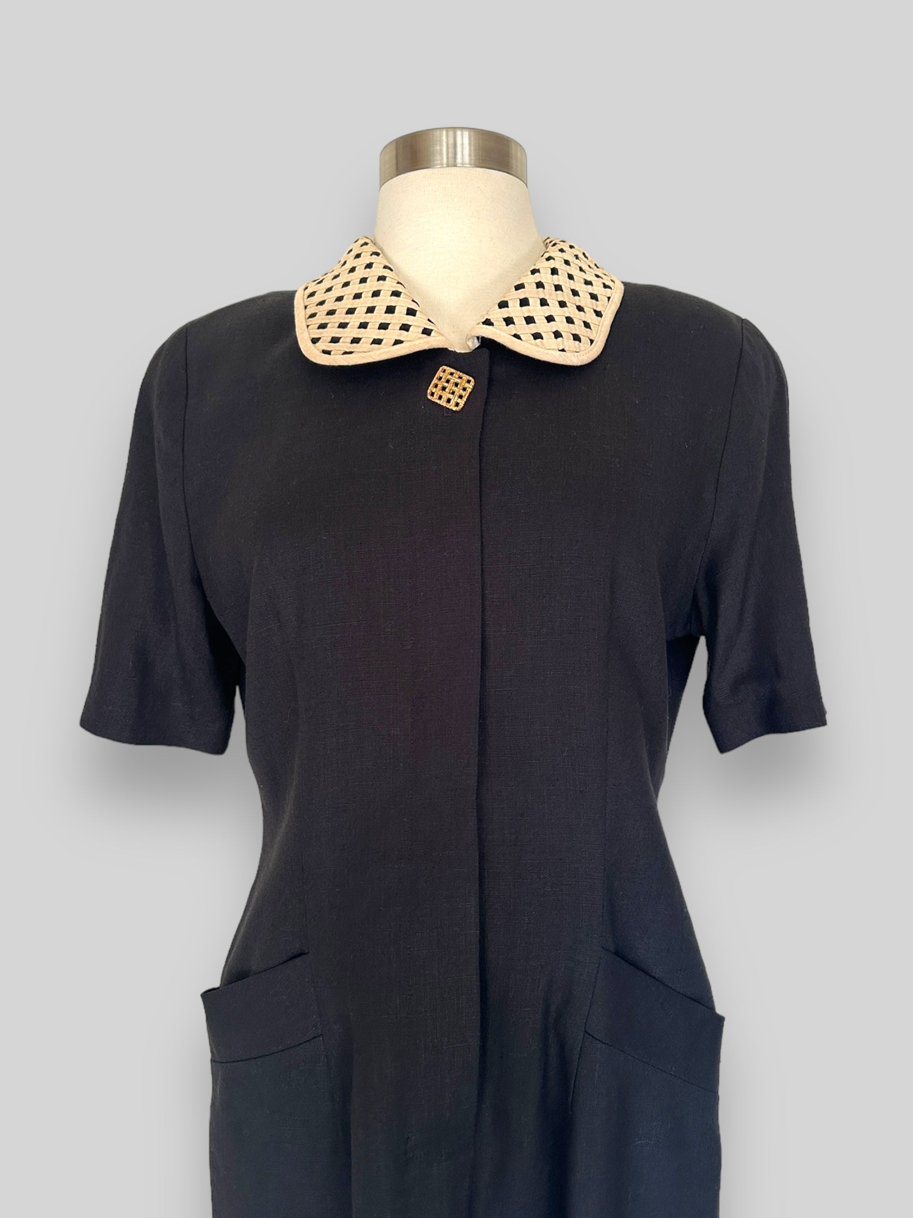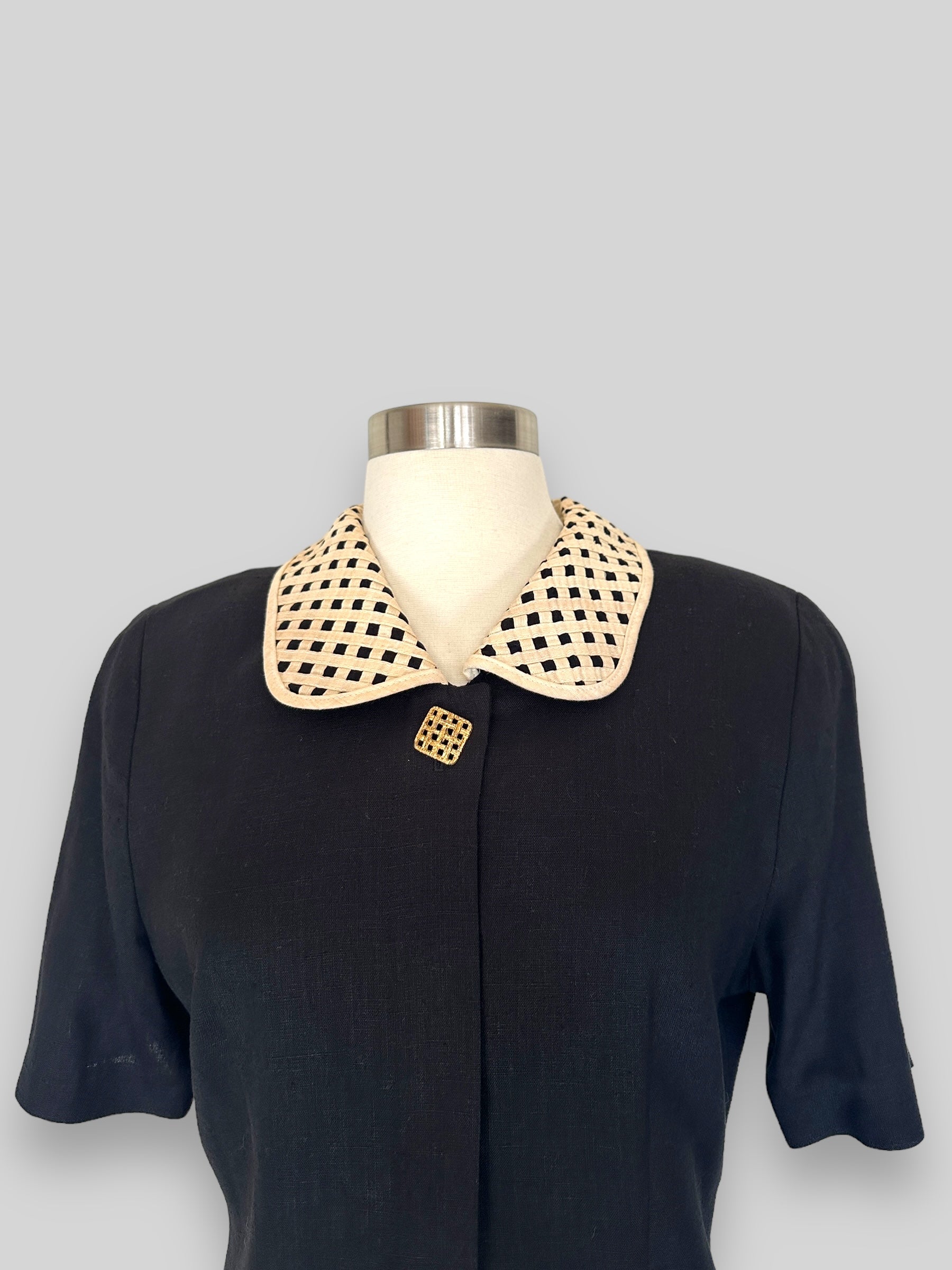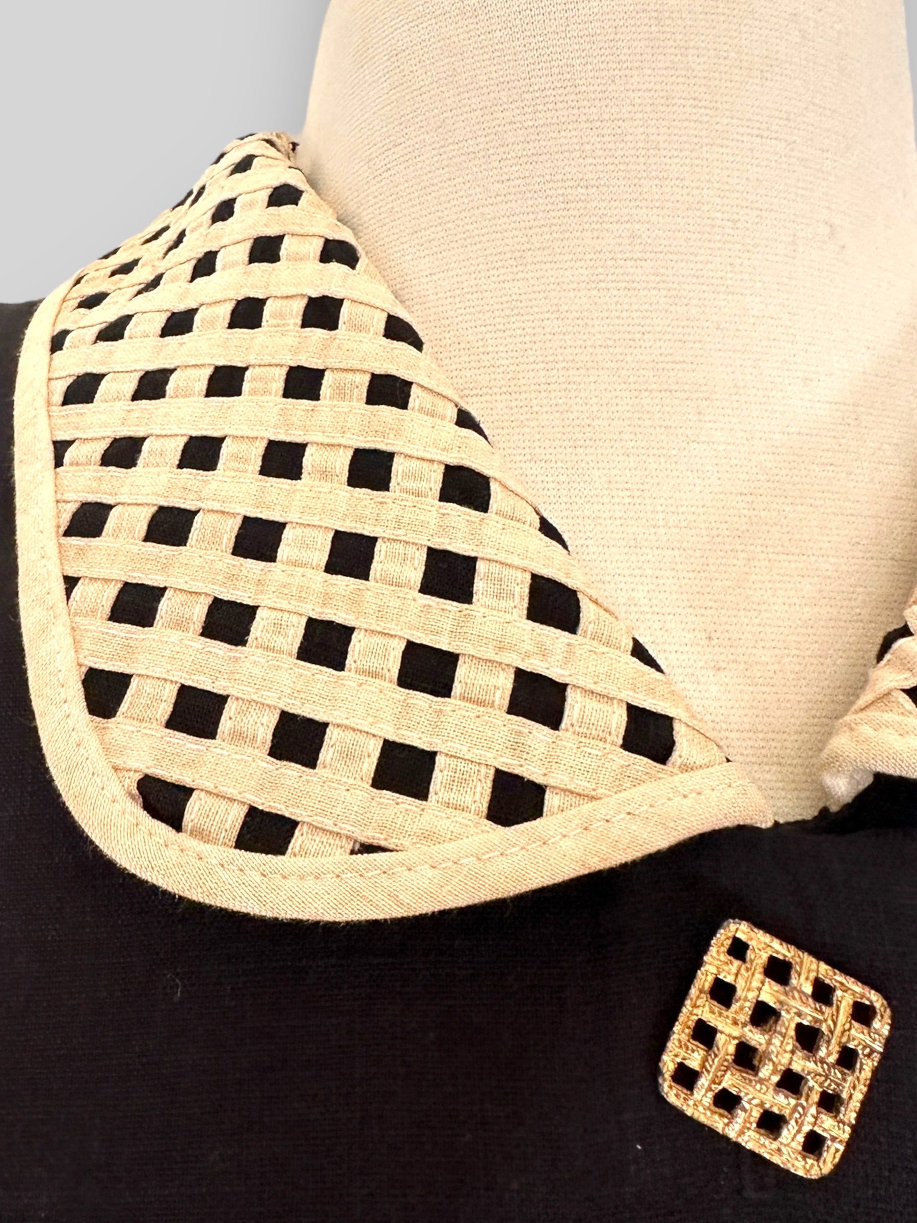 This elegant vintage dress 1960s showcases classic sophistication with its sleek black fabric and mid-length cut. The dress features short sleeves and a fitted waist, creating a flattering silhouette. A standout detail is the off white perforated collar, adding a charming contrast and a touch of retro style. The collar is secured with a decorative square button at the neckline, as well as on the sleeves enhancing it's vintage appeal. The dress also includes discreet front pockets, blending functionality with timeless fashion. Perfect for both formal and semi-formal occasions, this dress is a beautiful example of vintage craftsmanship and style.