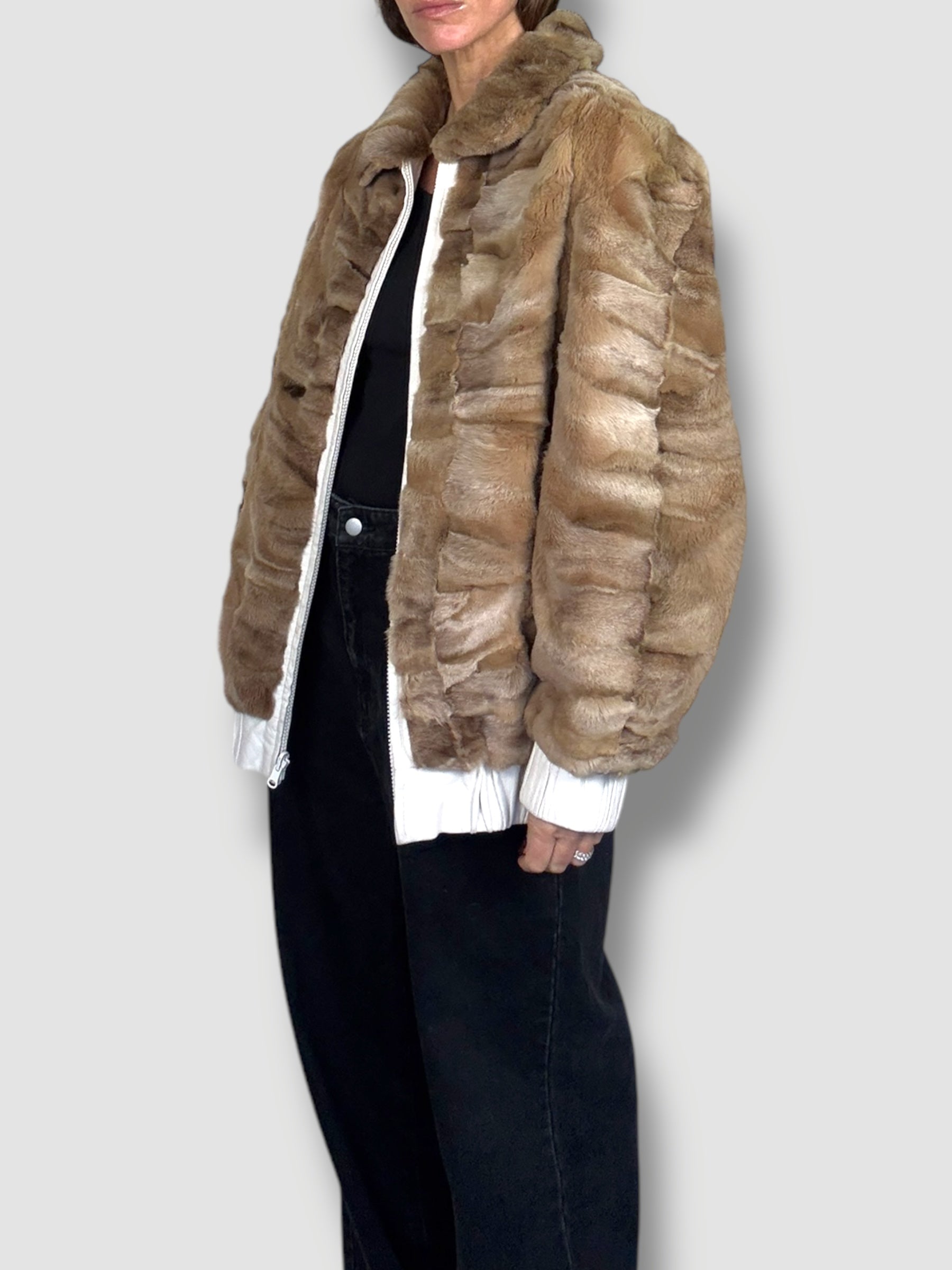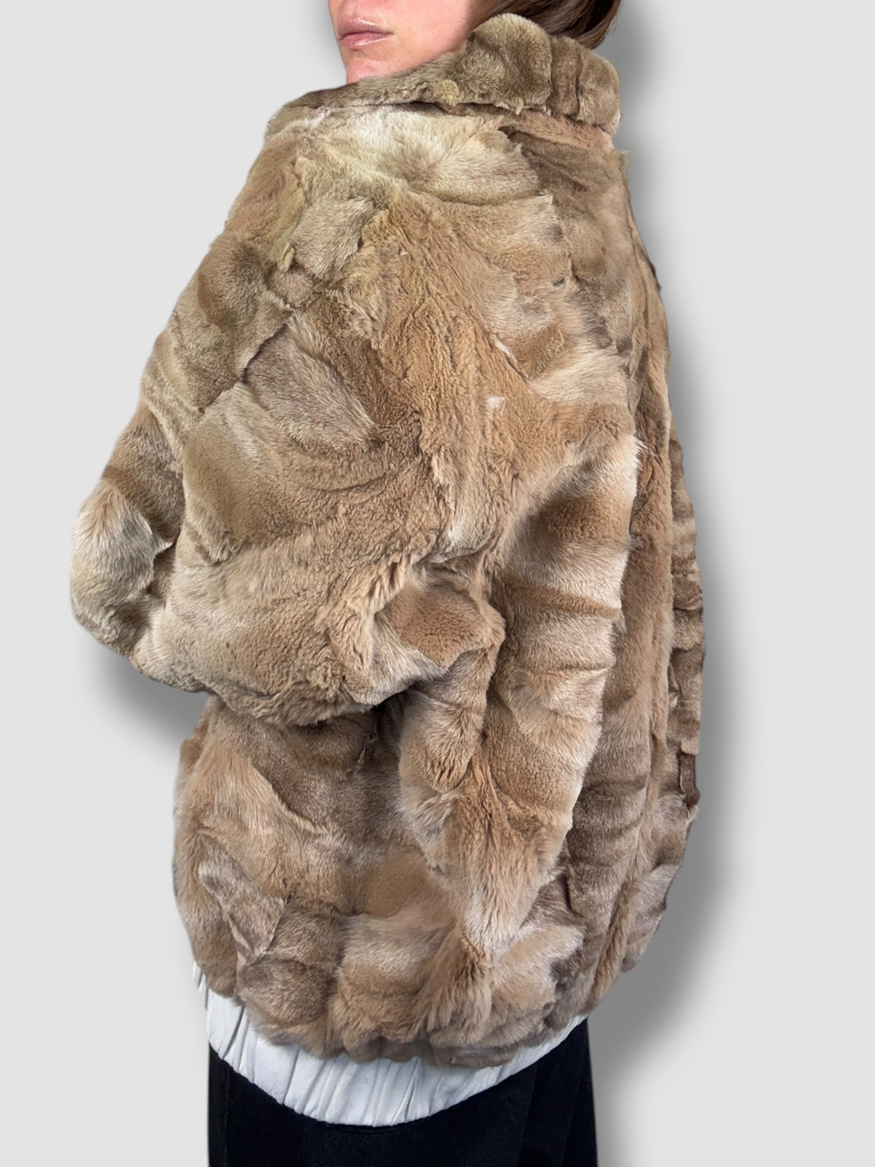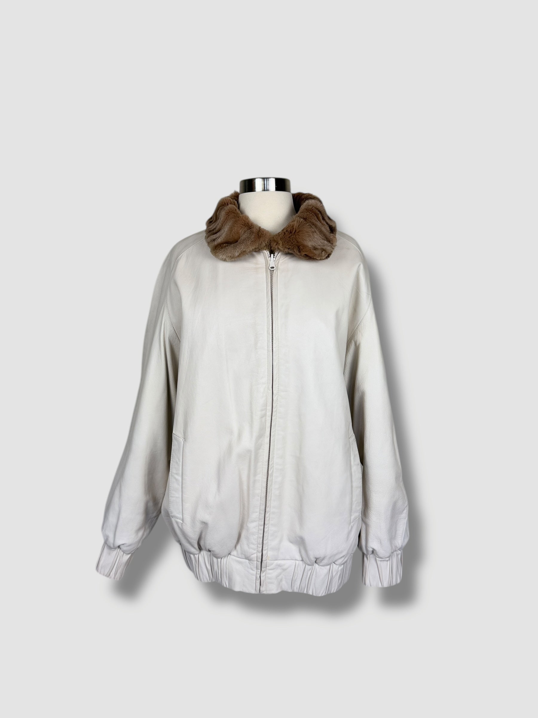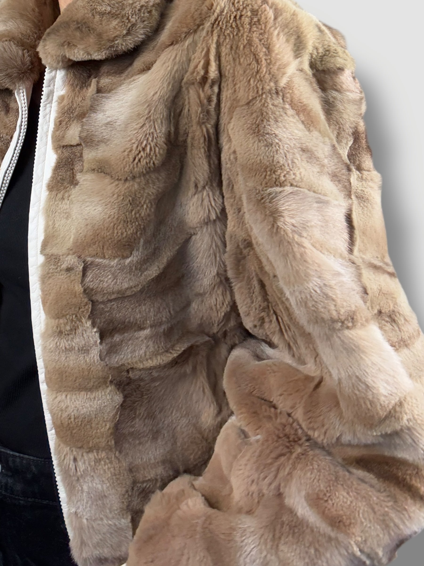 This vintage reversible jacket is a stunning fusion of luxury and versatility, featuring plush mink fur on one side and supple leather on the other. The fur side showcases an opulent, soft texture with a beautifully structured collar, while the leather side offers a sleek, minimalist look with a touch of fur trim for added elegance. A zip-front closure and ribbed cuffs and hem provide a casual yet sophisticated silhouette, making it a perfect statement piece for day-to-night styling. Whether worn for warmth or style, this one-of-a-kind piece is a timeless wardrobe investment.