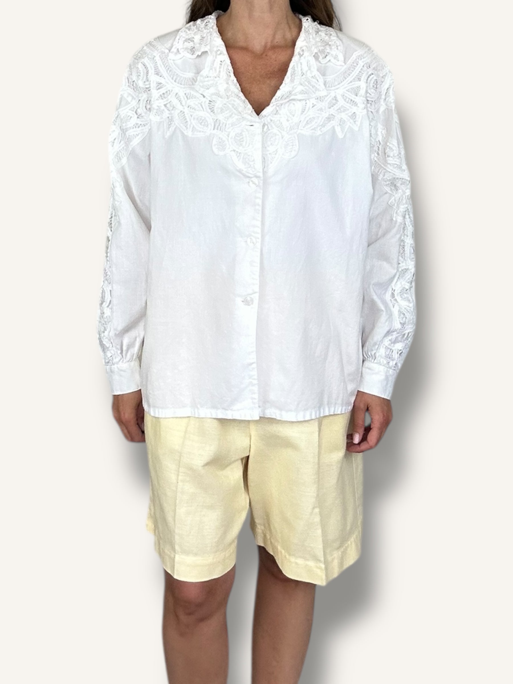 Vintage white chemise is a true heirloom piece with intricate lace detailing that feels both delicate and bold. Crafted from a soft, breathable cotton blend, it features a button-down front, relaxed fit, and stunning appliqué lacework across the collar, yoke, and sleeves. The wide lapel-style collar adds a touch of drama, while the long sleeves and flowing silhouette make it endlessly versatile — wear it as a blouse, layered tunic, or dreamy loungewear. Fits sizes M–L, or wear oversized for a breezy, effortless vibe.