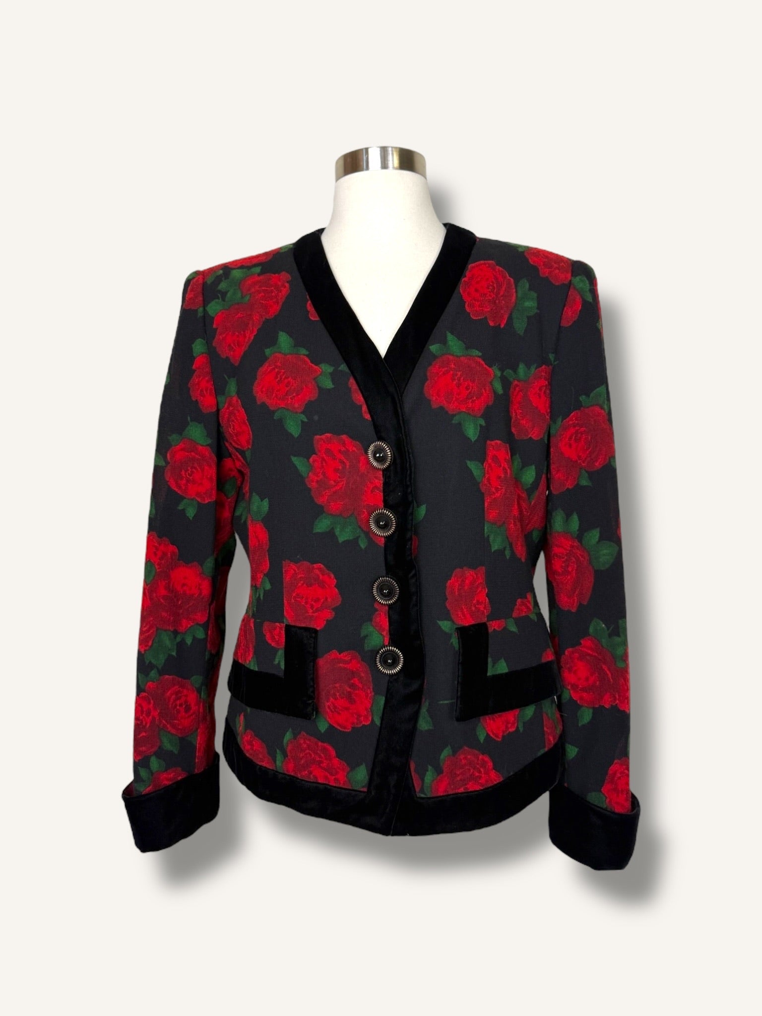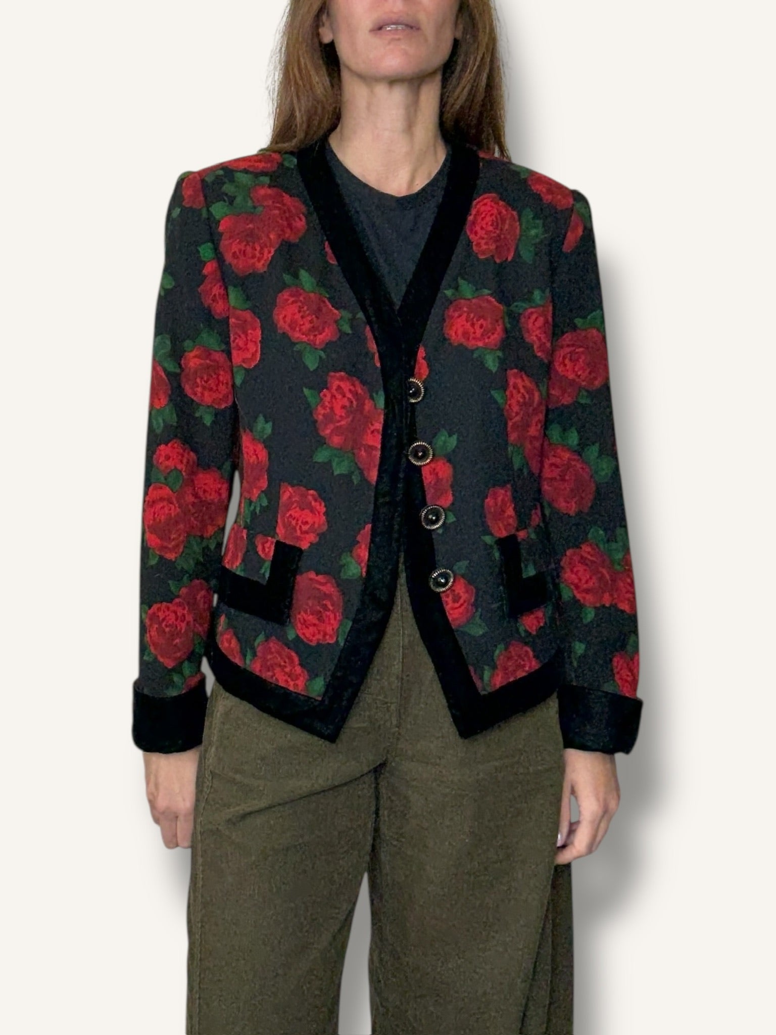 Vintage Rose Print Blazer. Romantic and bold, this vintage blazer features a striking red rose print over deep black fabric. The tailored silhouette is framed with black velvet trim along the collar, cuffs, and pockets, adding a touch of luxury. Detailed with statement buttons and light shoulder structure, it’s a perfect mix of femininity and edge, ideal worn open over denim or dressed up for evening.