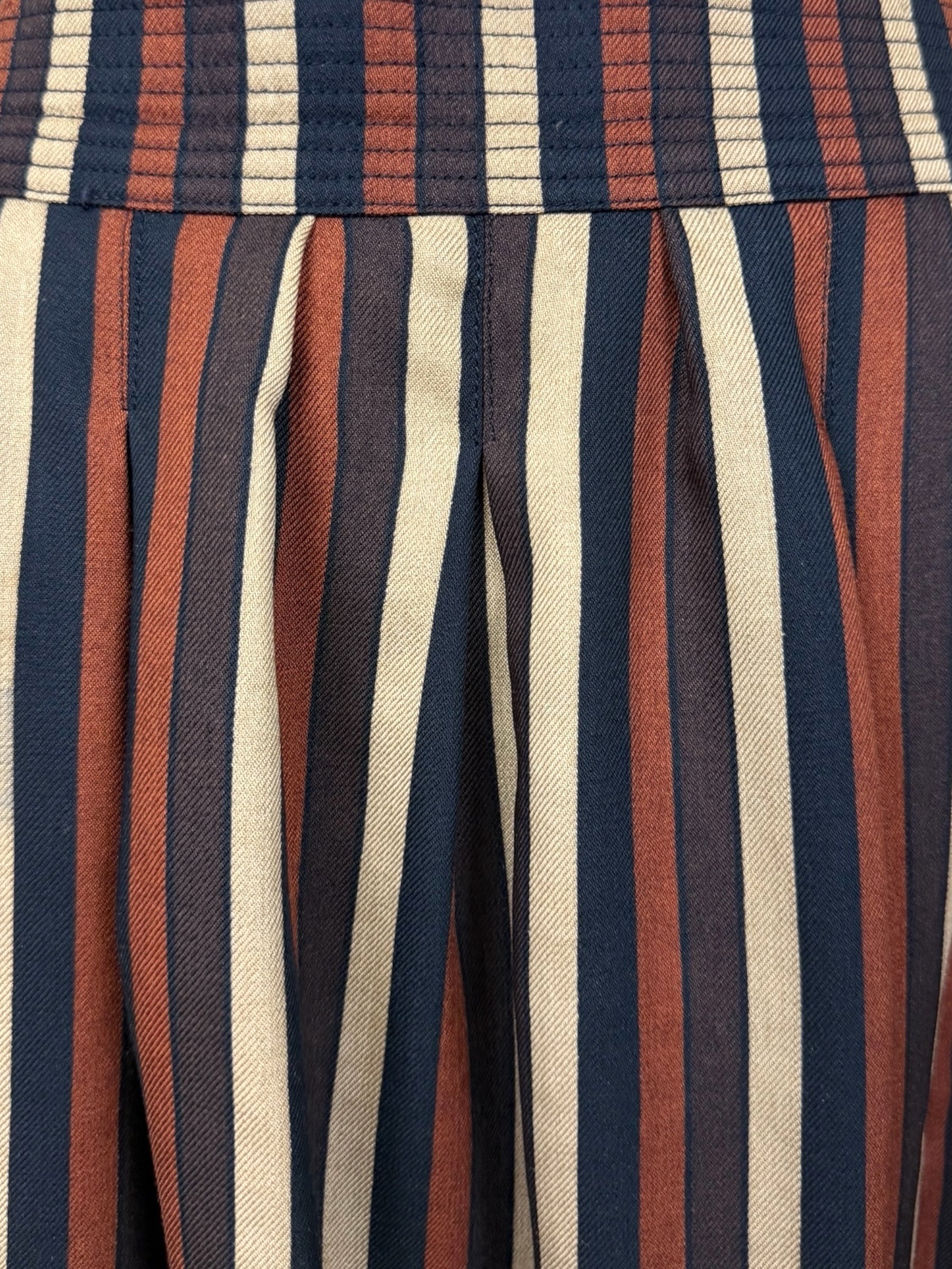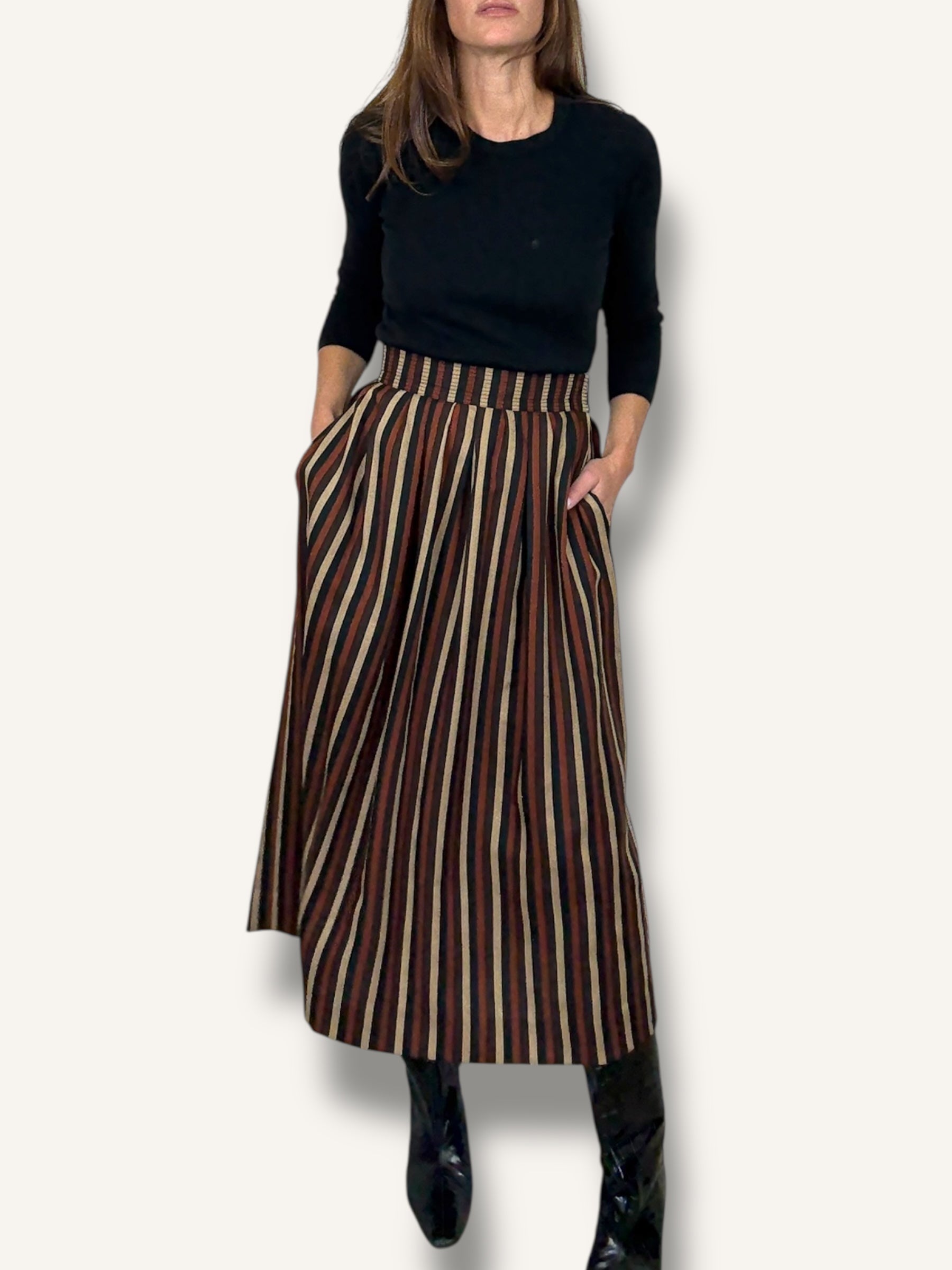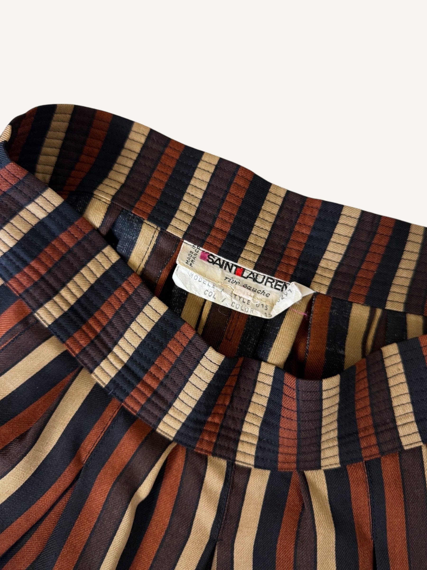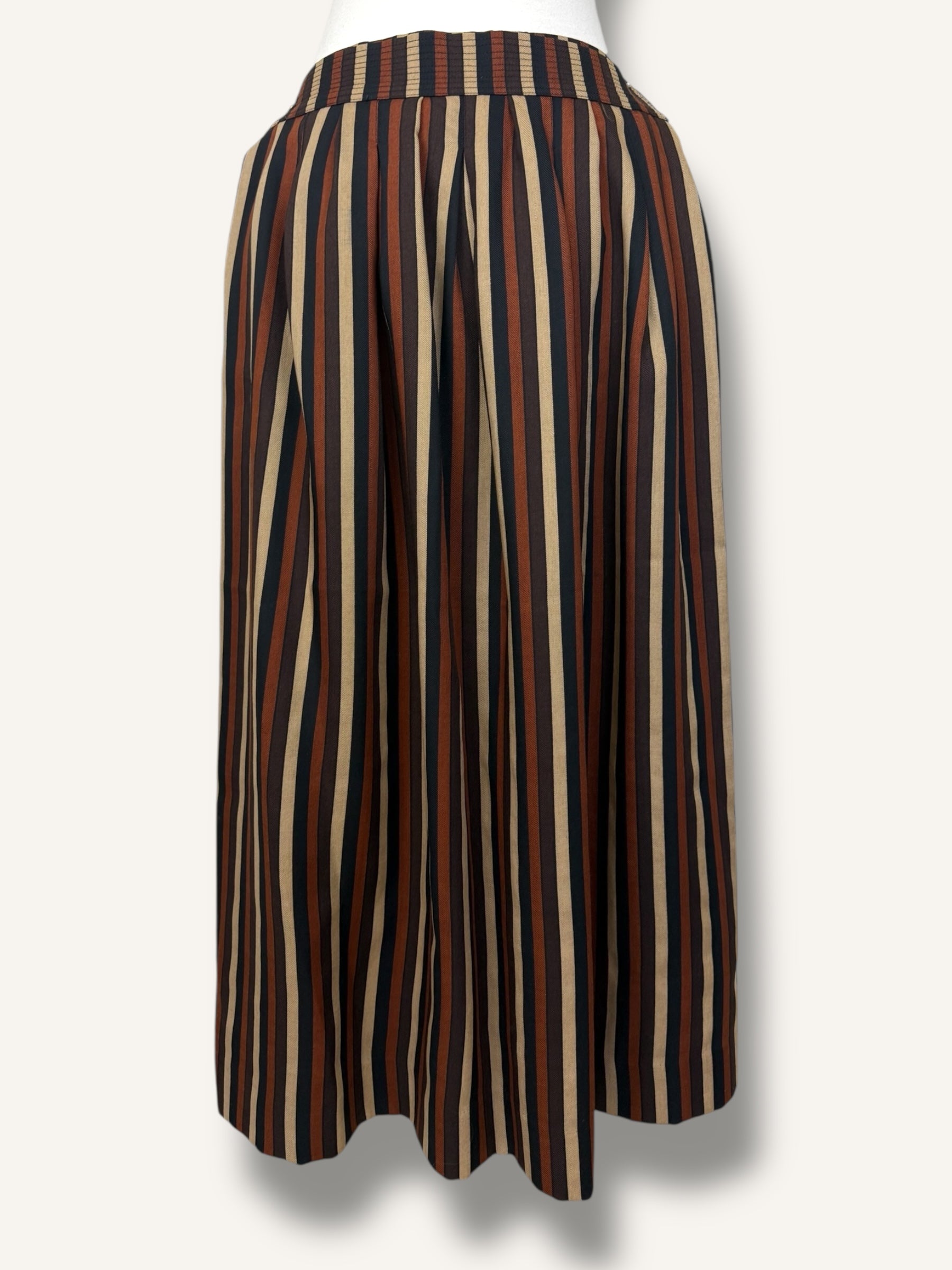 Vintage Saint Laurent Rive Gauche 1970s striped midi skirt in earthy tones of rust, black, and beige. Designed with a structured waistband, soft pleating, and a fluid A-line silhouette that falls below the knee. Seamless side pockets and side zipper. The vertical stripes elongate the shape while the lightweight fabric adds movement, making it a versatile piece for both casual and elevated styling.