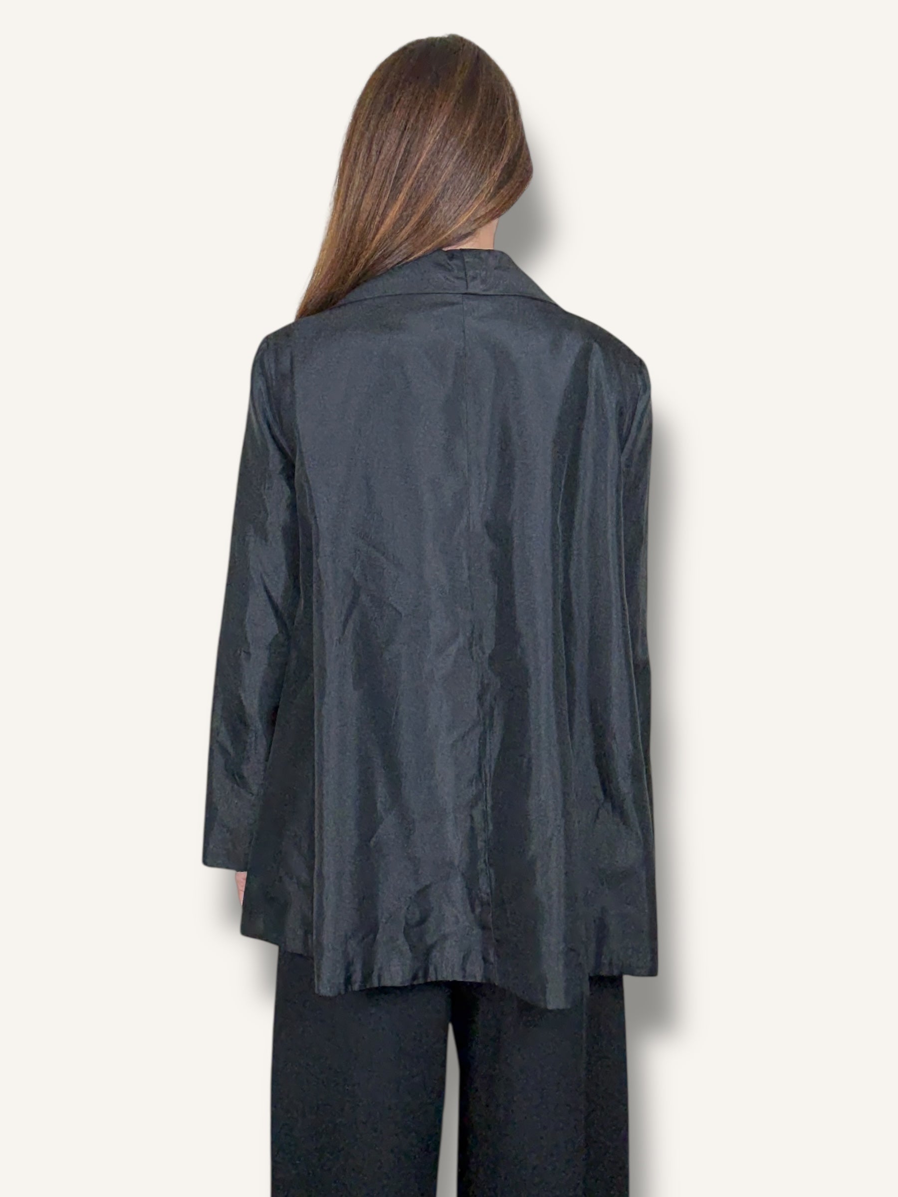 Vintage Satin Jacket. A timeless vintage piece from Jessica McClintock, this black satin jacket captures understated elegance with its fluid silhouette and luminous sheen. Designed with a softly structured collar and a relaxed, swing-style cut, it drapes effortlessly over the body, perfect for layering over evening wear or elevating a simple look. The lightweight satin fabric gives it that signature 80s–90s glam touch, while the minimalist design keeps it modern and versatile. A piece that embodies quiet sophistication and classic femininity.