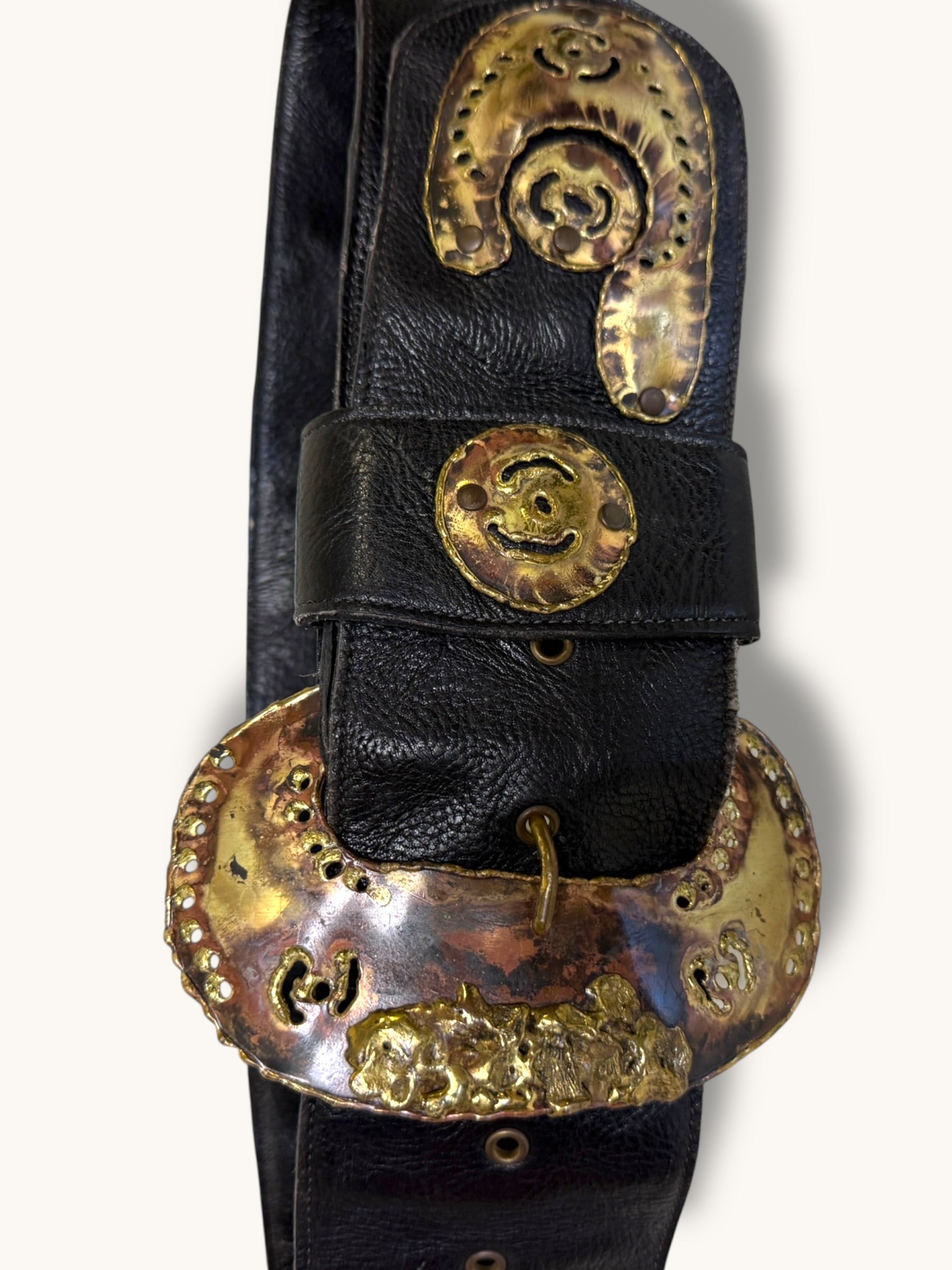 Vintage wide black leather belt featuring a striking sculptural brass buckle and ornate hammered metal detailing. The oversized buckle showcases a beautifully patinated brass finish with artisanal textures and decorative cut-out motifs, giving the piece a bold, almost jewelry-like presence. Crafted from supple black leather with a wide silhouette that cinches the waist effortlessly, this belt adds instant character to blazers, dresses, or high-waisted trousers. A true statement vintage accessory that blends craftsmanship with dramatic style.