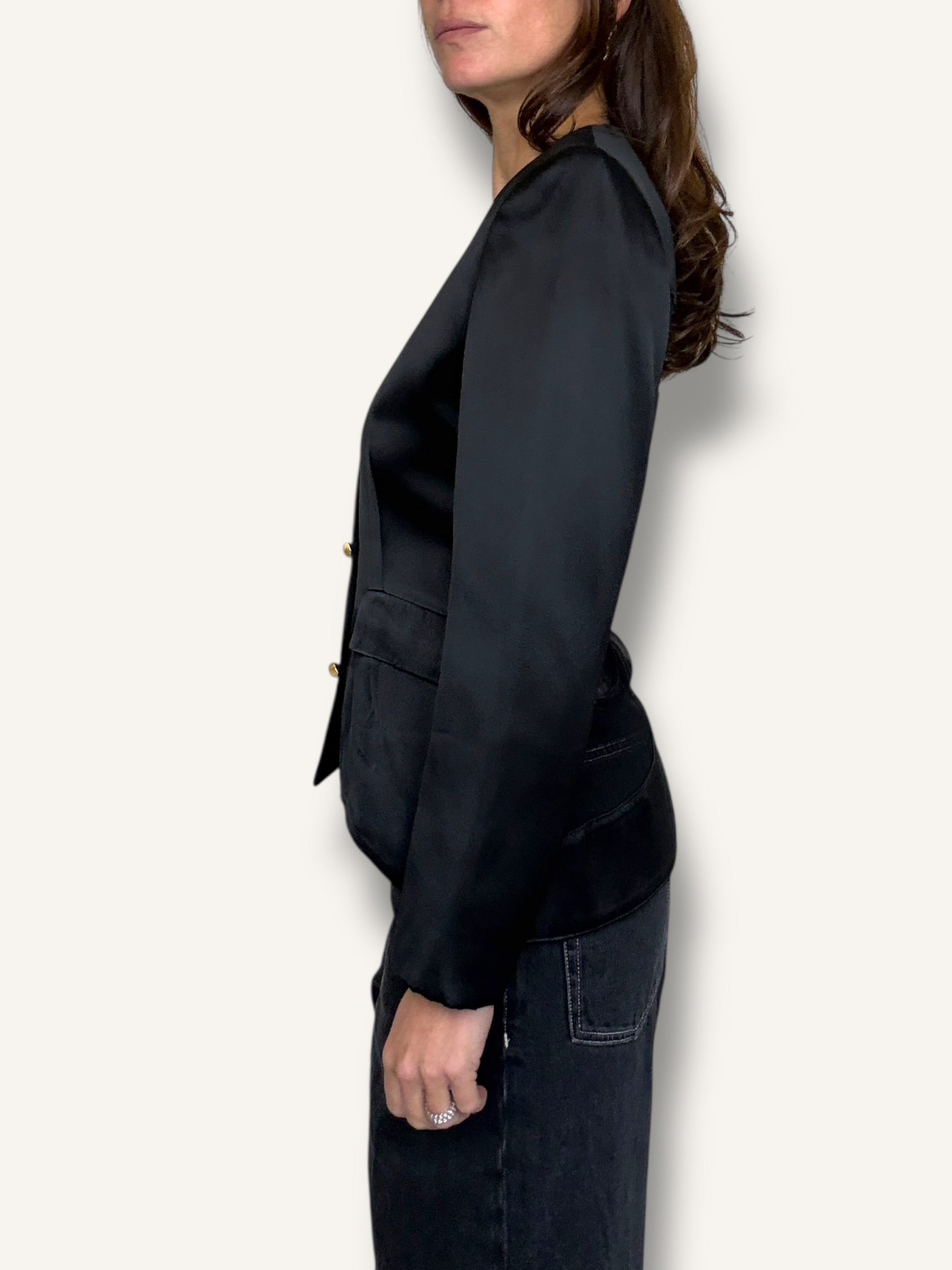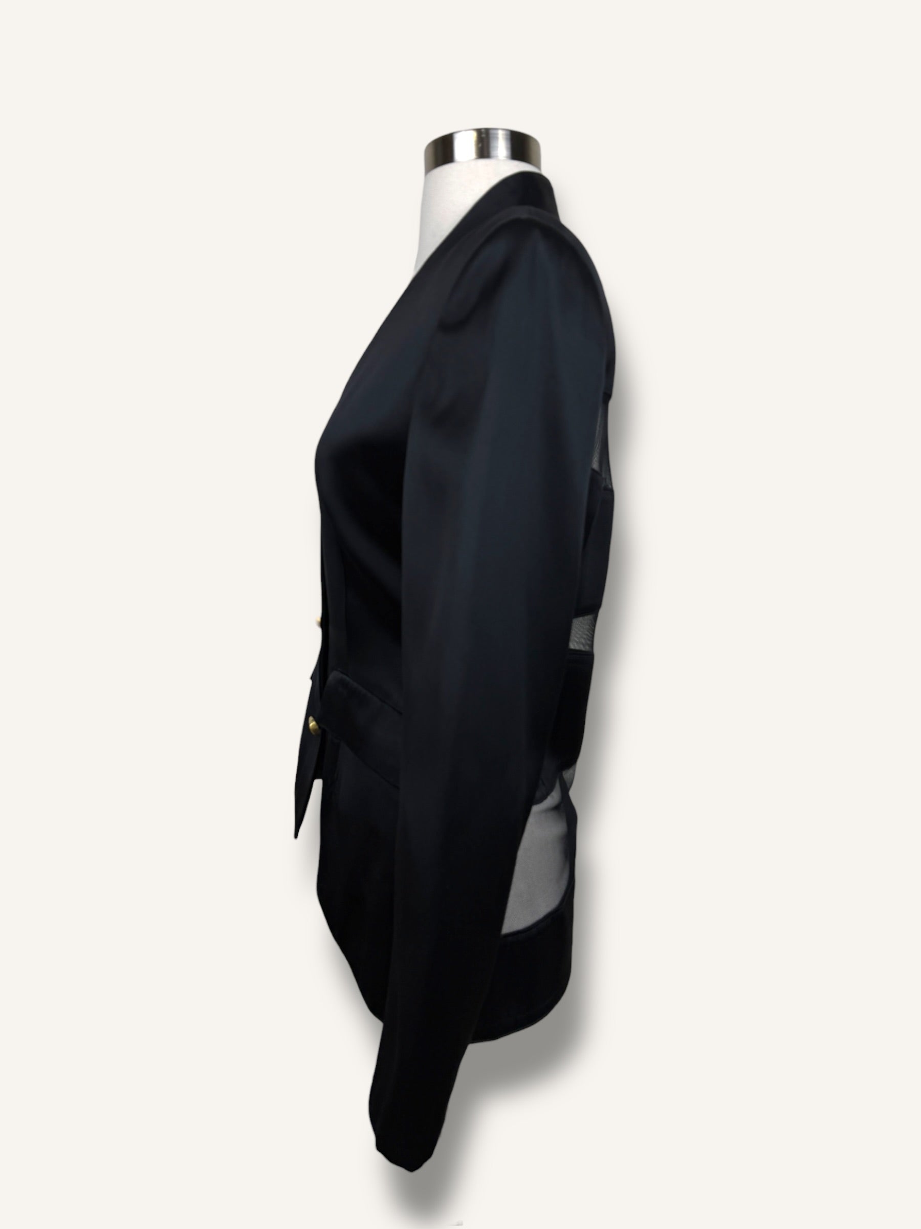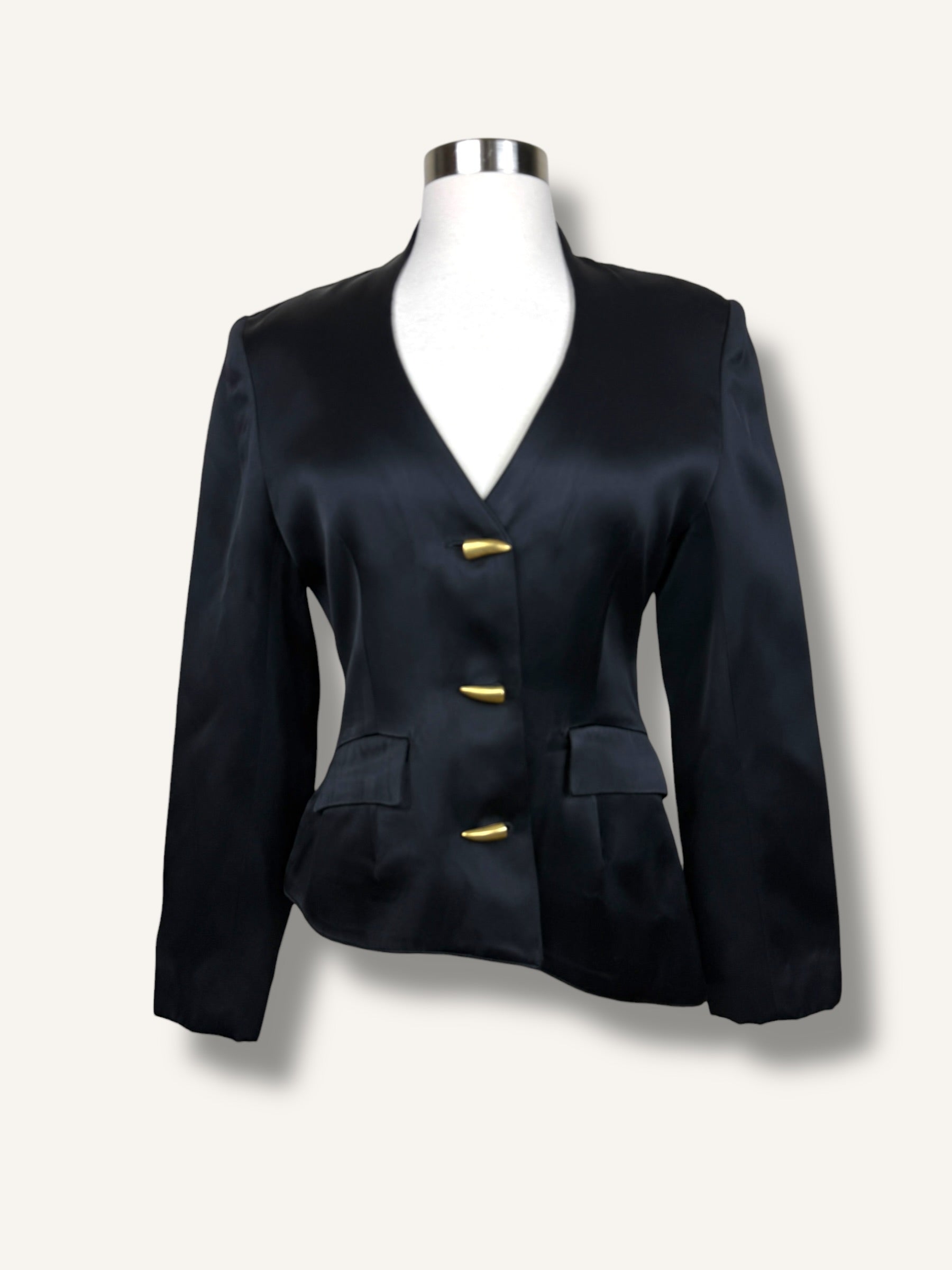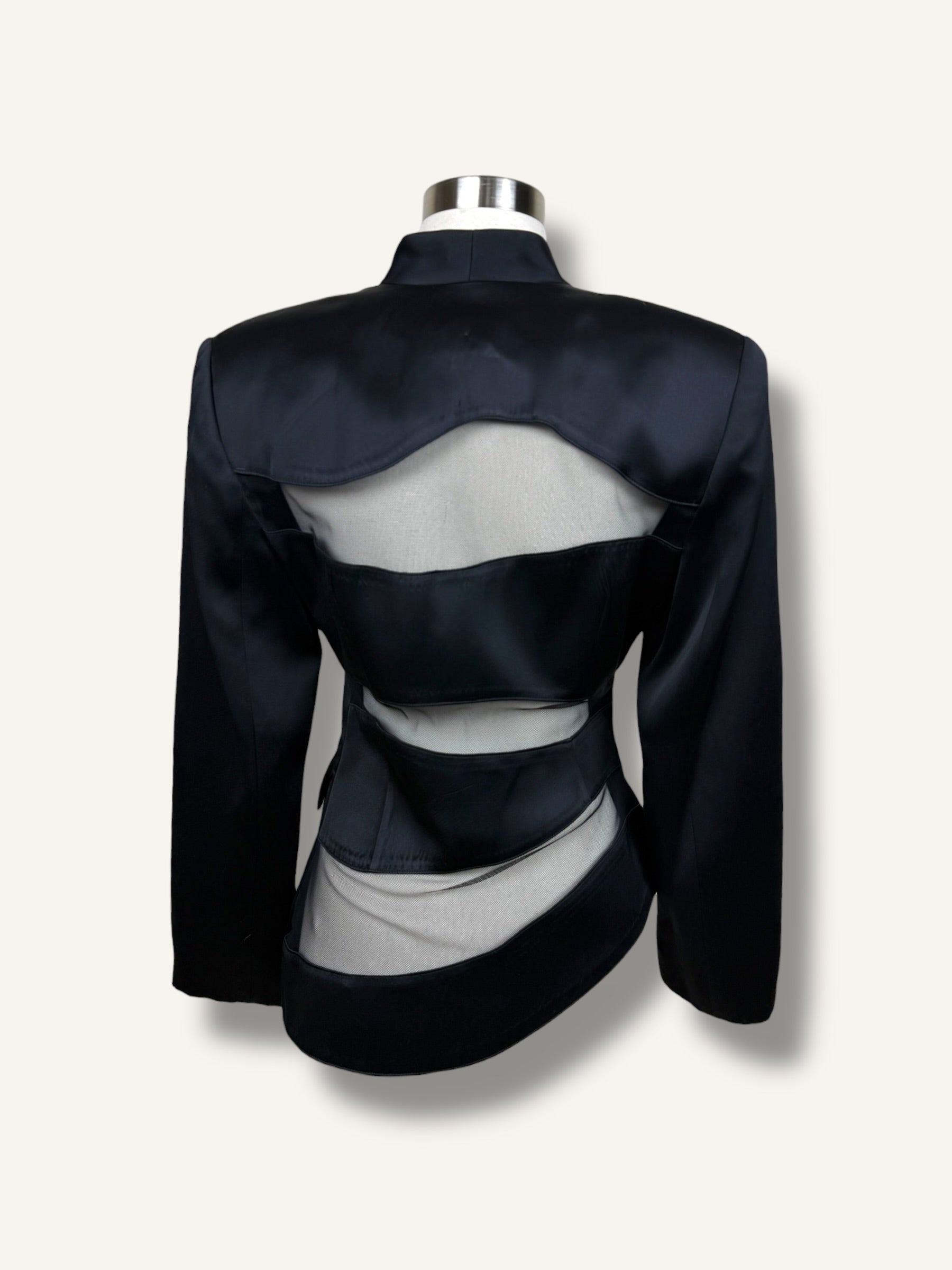 A striking vintage black satin jacket with a sleek, sculpted silhouette and bold architectural back cut-outs that make it unforgettable from every angle. Designed with a deep V neckline, structured shoulders, and statement gold sculptural buttons down the front, it features subtle flap pockets and a tailored waist that flatters the figure. The dramatic open back is framed by curved satin panels and sheer mesh inserts, creating a modern, unexpected contrast to the clean, minimal front. Elegant yet daring, this one-of-a-kind piece pairs effortlessly with denim or evening separates for a refined statement look.