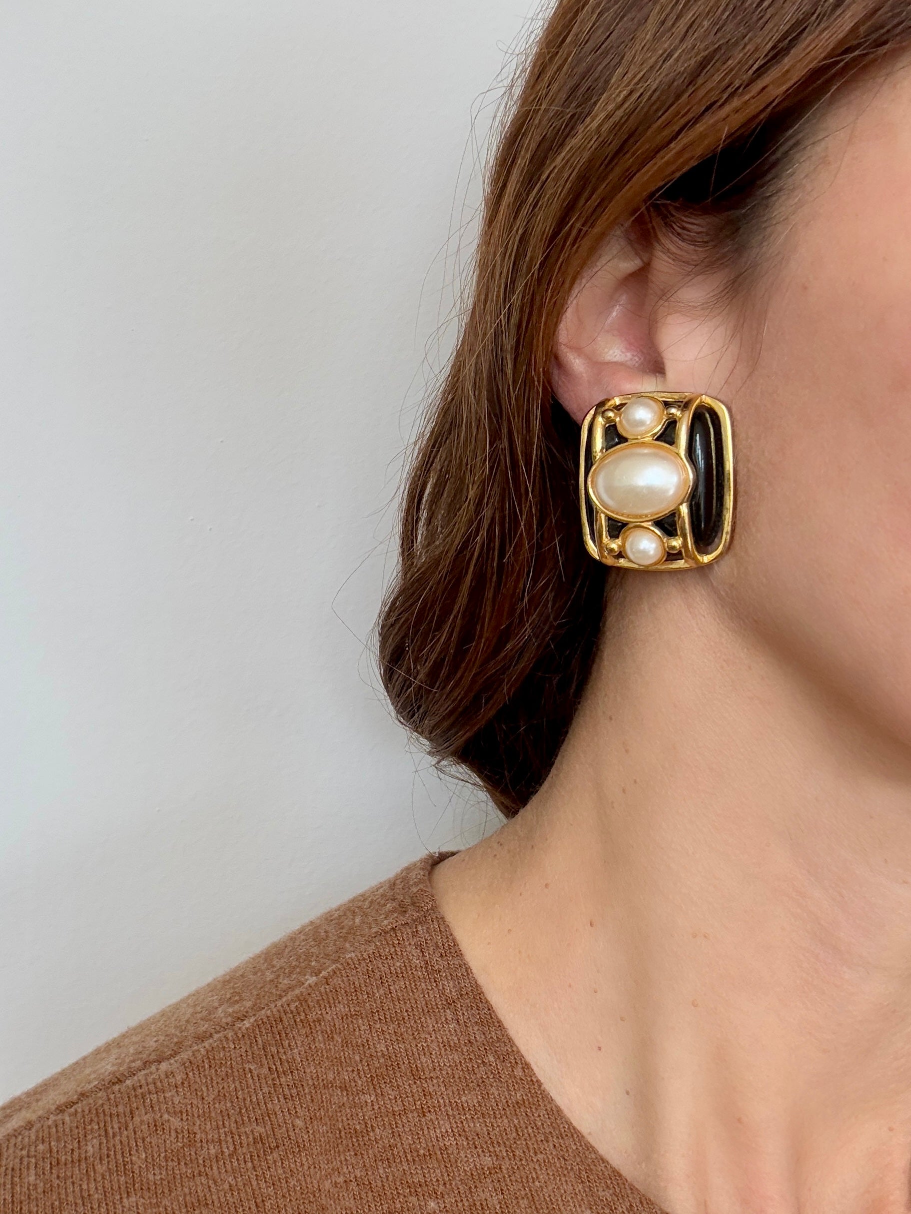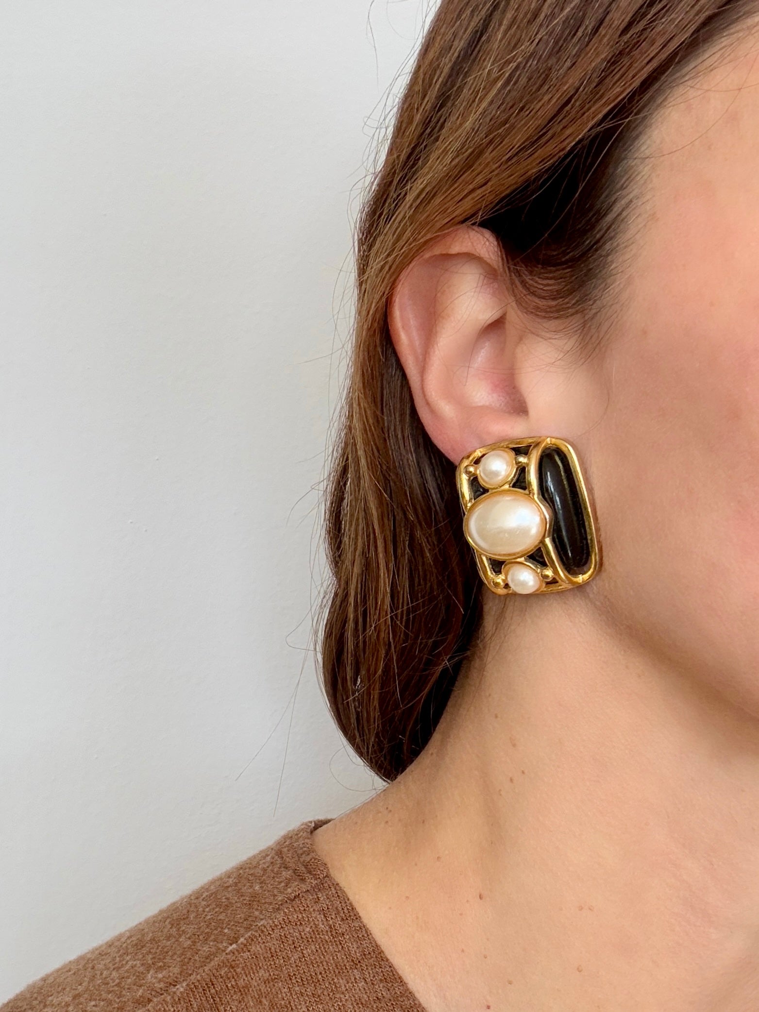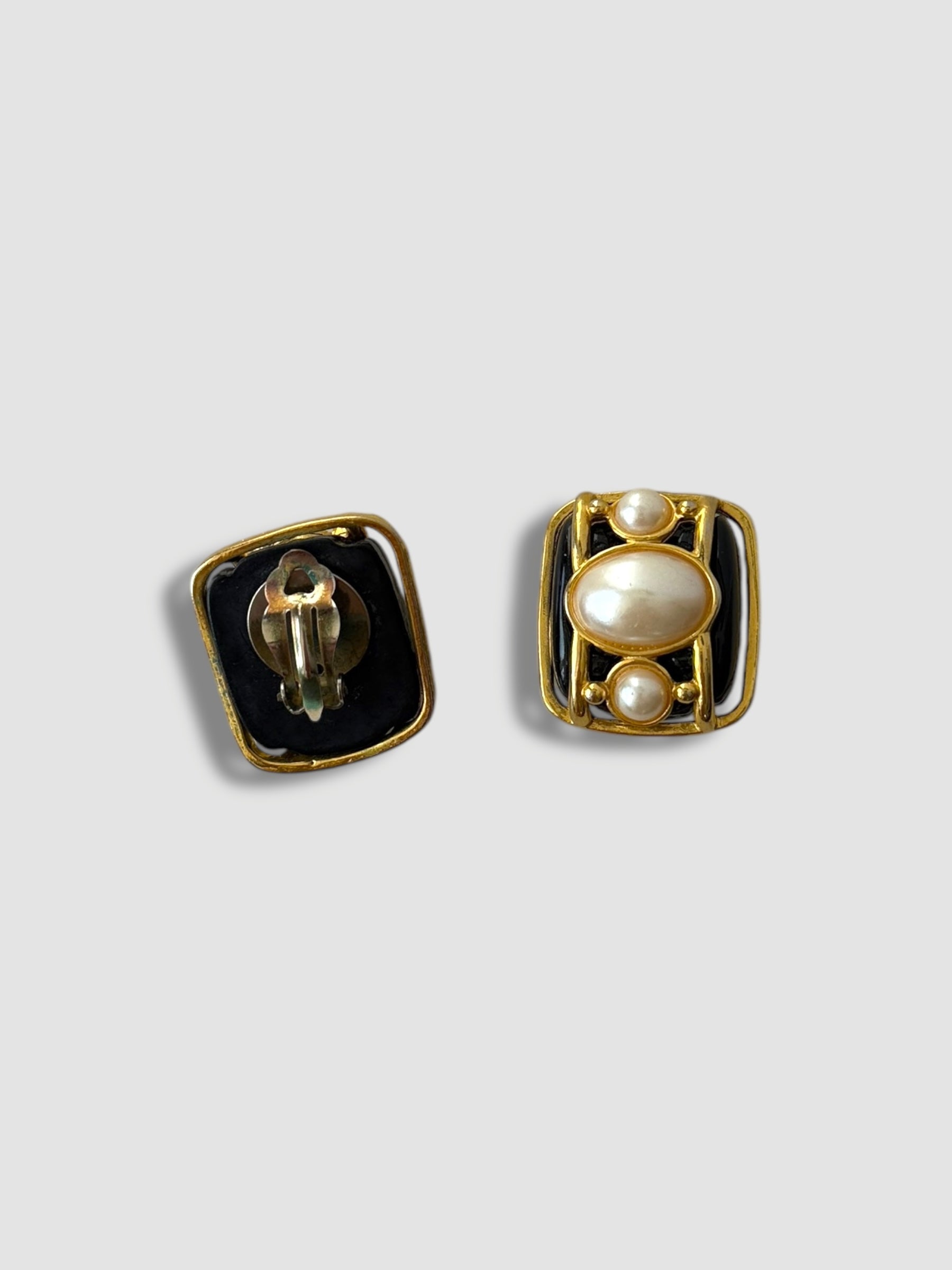 These vintage statement Clip ons earrings feature a bold, sculptural design with a rich mix of materials. Set in gold-tone metal, the rectangular frame has an openwork structure, creating a dynamic, dimensional look. The design is accented with a lustrous faux pearl centerpiece, complemented by two smaller pearls, adding a touch of classic elegance. A glossy black inlay contrasts beautifully with the gold, giving the earrings an Art Deco-inspired aesthetic. These clip-ons are perfect for adding a touch of sophisticated drama to any outfit.