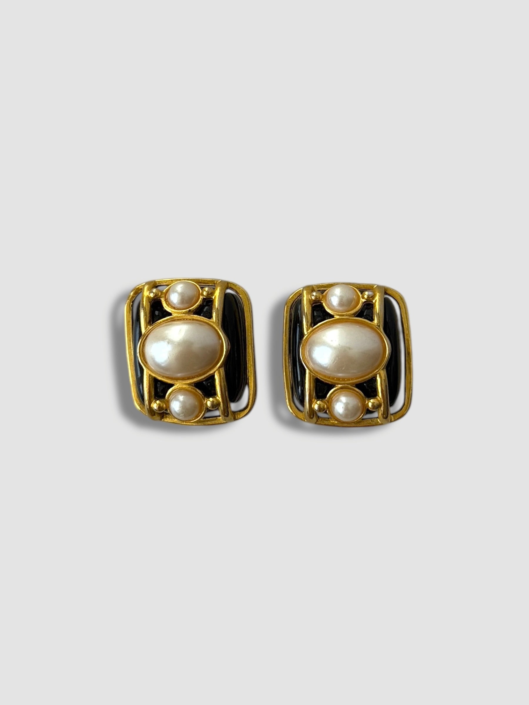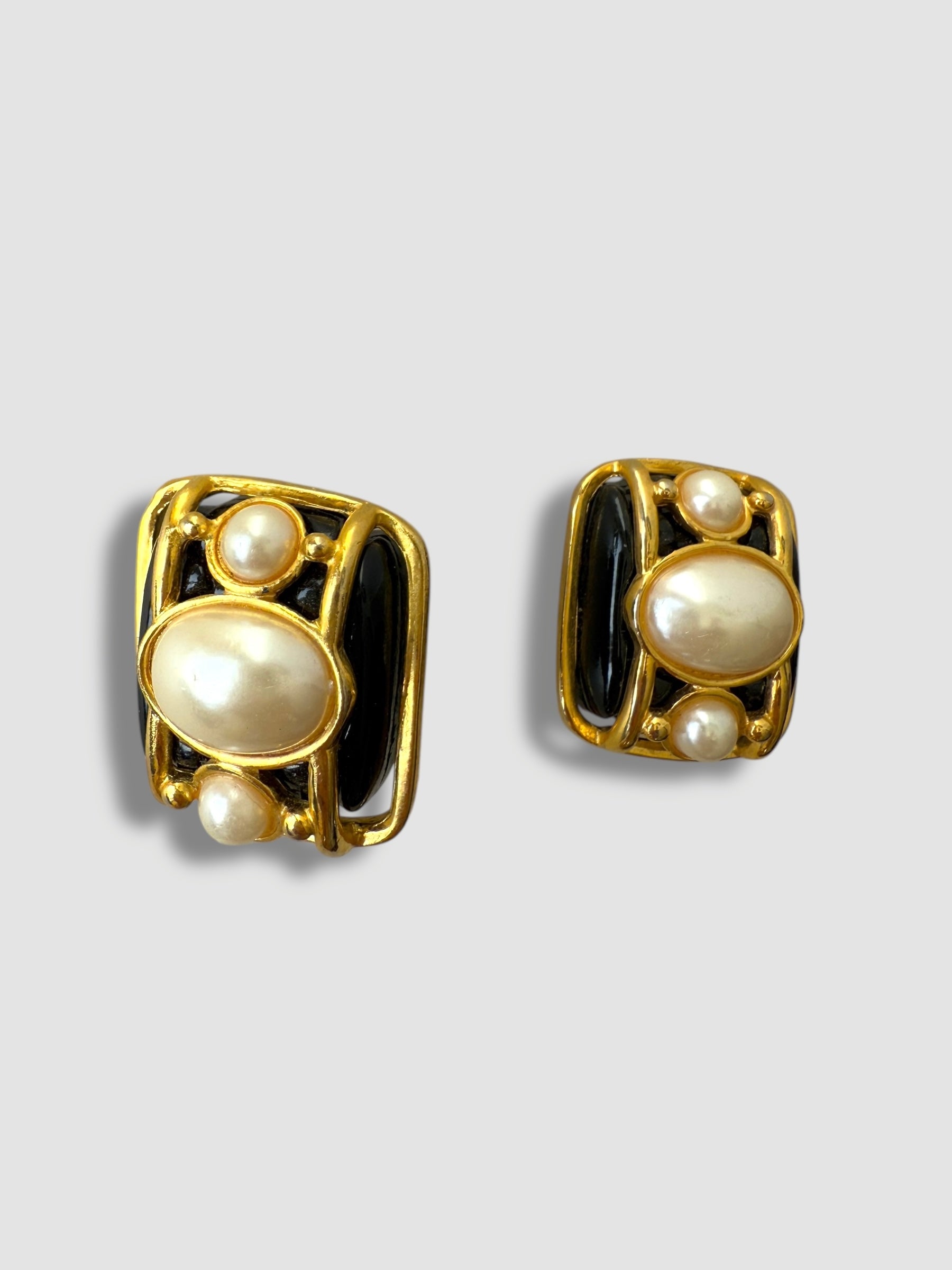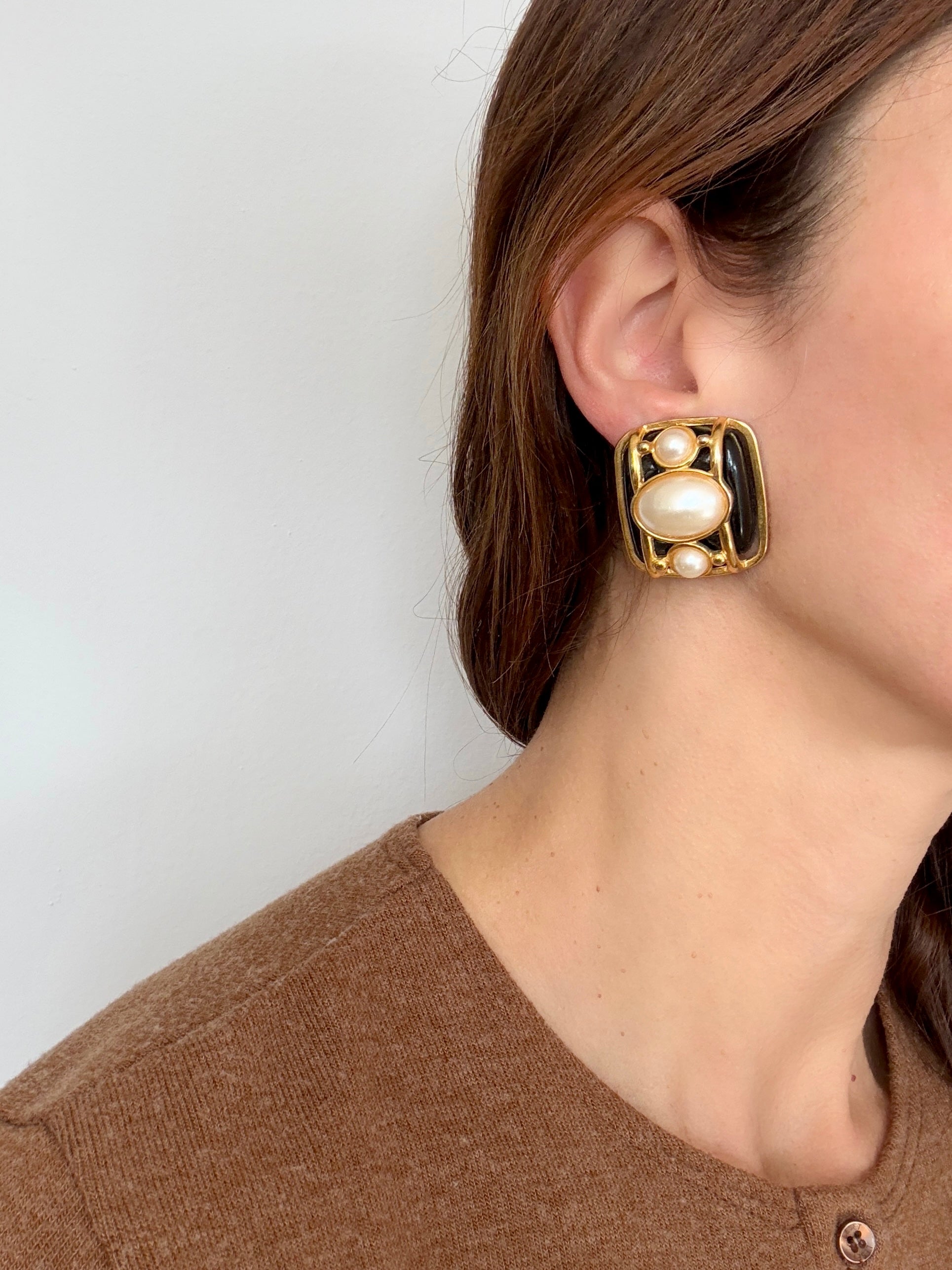These vintage statement Clip ons earrings feature a bold, sculptural design with a rich mix of materials. Set in gold-tone metal, the rectangular frame has an openwork structure, creating a dynamic, dimensional look. The design is accented with a lustrous faux pearl centerpiece, complemented by two smaller pearls, adding a touch of classic elegance. A glossy black inlay contrasts beautifully with the gold, giving the earrings an Art Deco-inspired aesthetic. These clip-ons are perfect for adding a touch of sophisticated drama to any outfit.